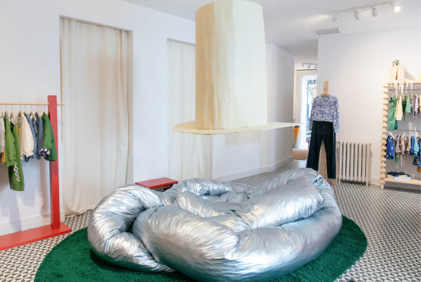 Les dimensions es reversionen. Submergeix-te en un barret gegant, relaxa't en un eclèctic coixí gegant que pots modelar i sentir-ne la seva textura platejada.