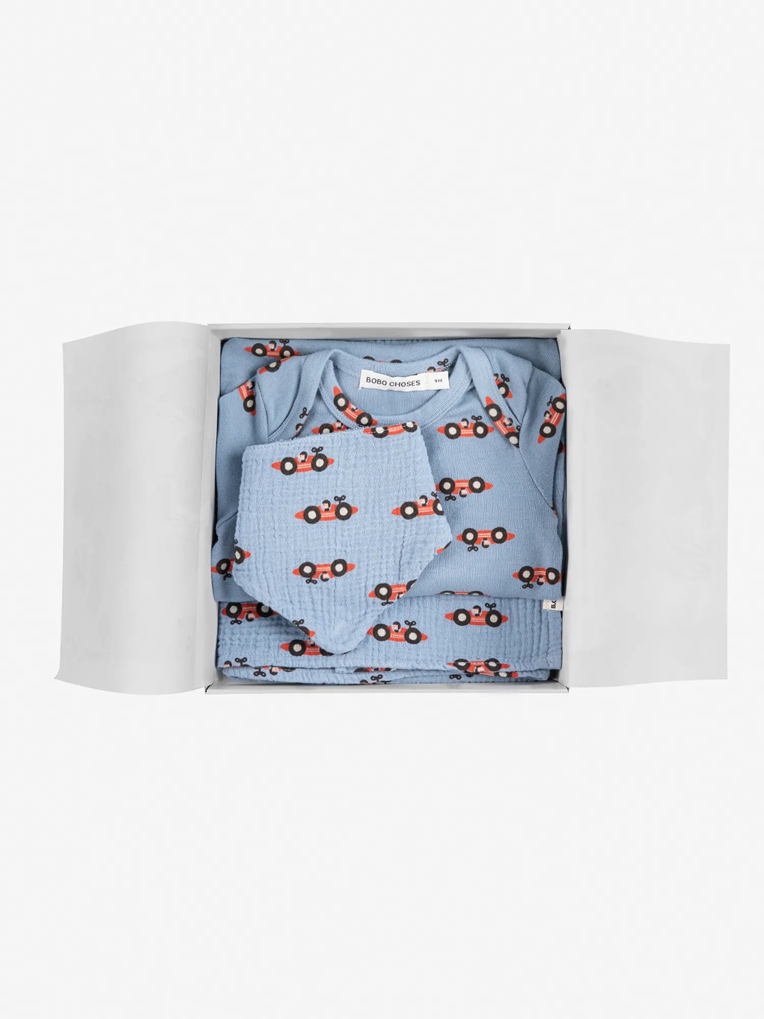 Conjunt de regal per a nadó de color blau clar. Amb disseny de màniga llarga, tancament a pressió a l'entrecuix, ajust cenyit, llarg i coll americà. Fabricat a Espanya.
