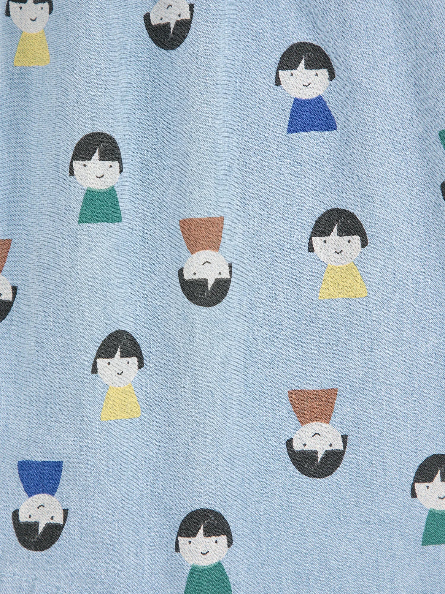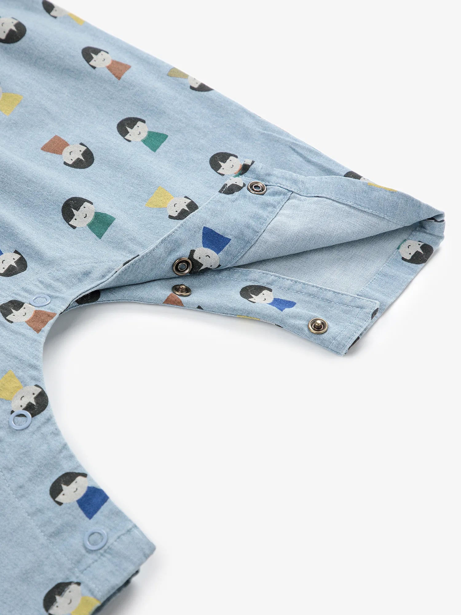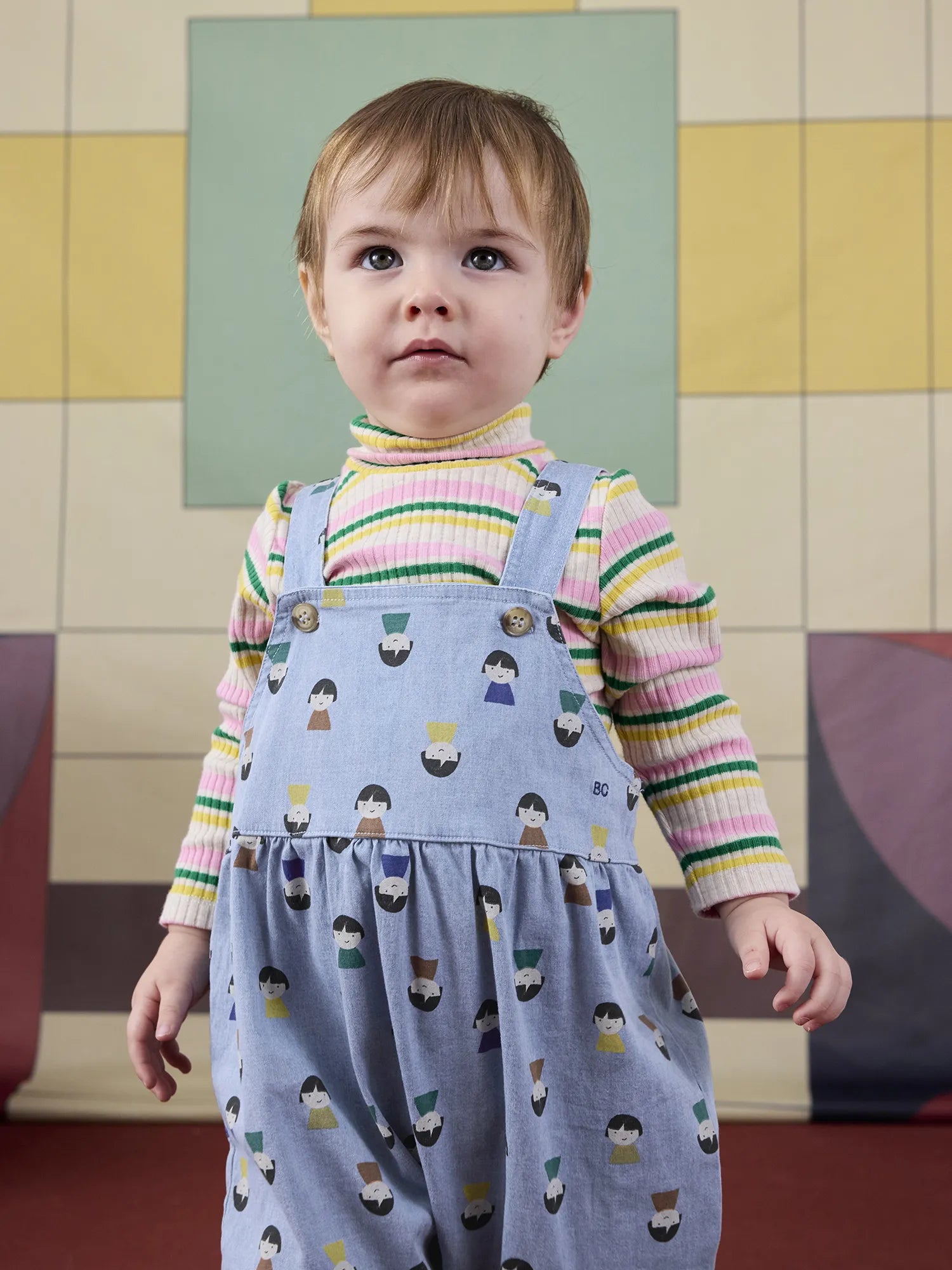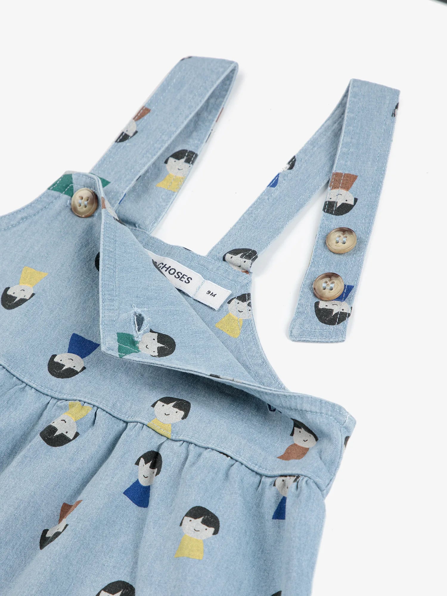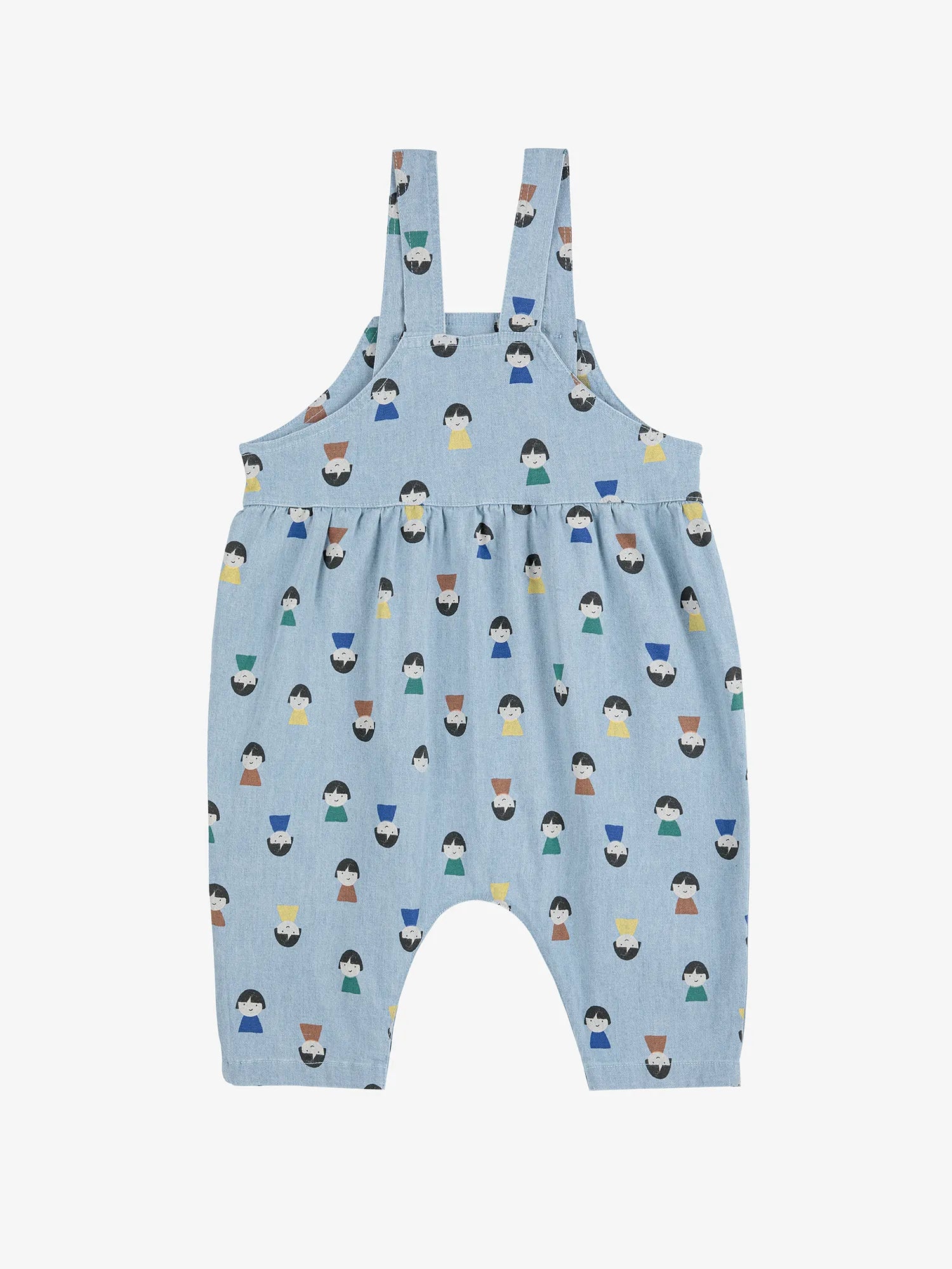 Granota de color blau clar. Dissenyada amb tirants ajustables, tancament a pressió a l'entrecuix, detall frunzit, brodat, ajust ample, tall llarg i denim.