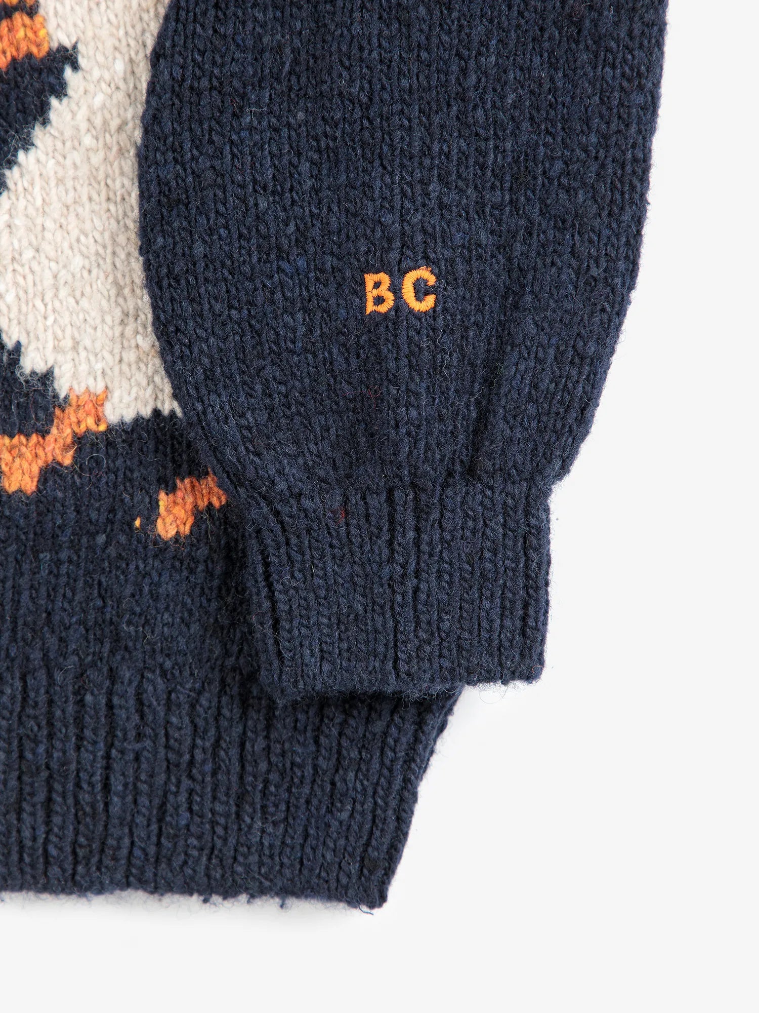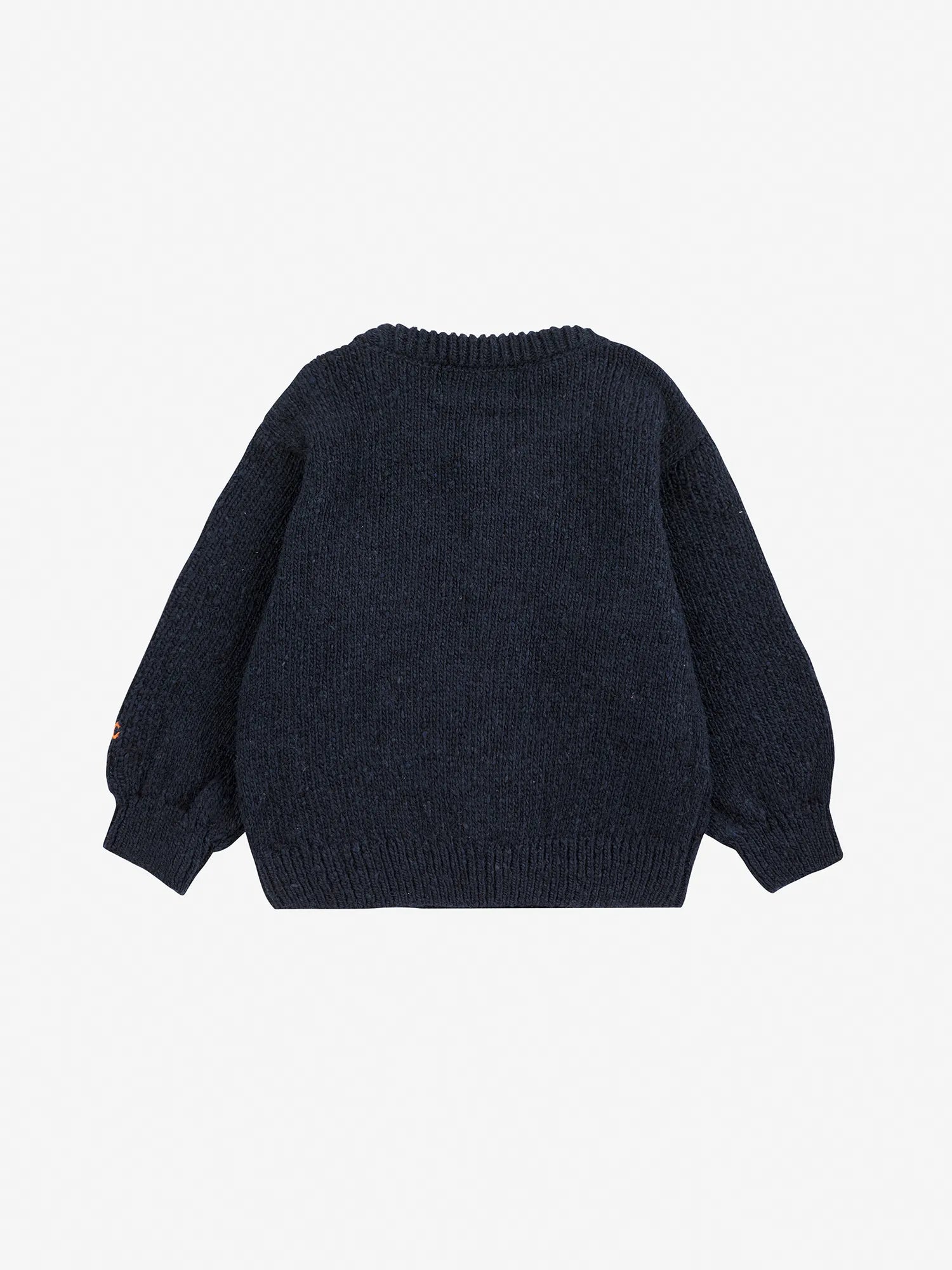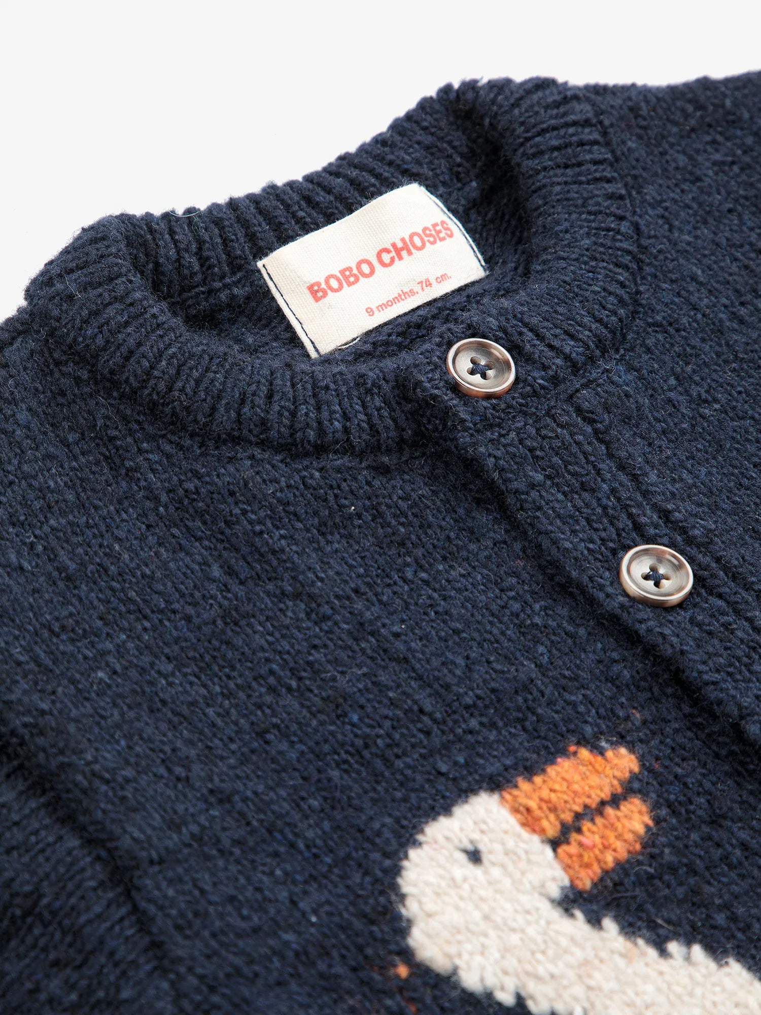 Càrdigan blau marí. Amb disseny de màniga llarga, espatlla caiguda, tancament amb botons al davant, punys i baix de canalé, intàrsia, ajust folgat, brodat i coll rodó. Fabricat a Portugal.