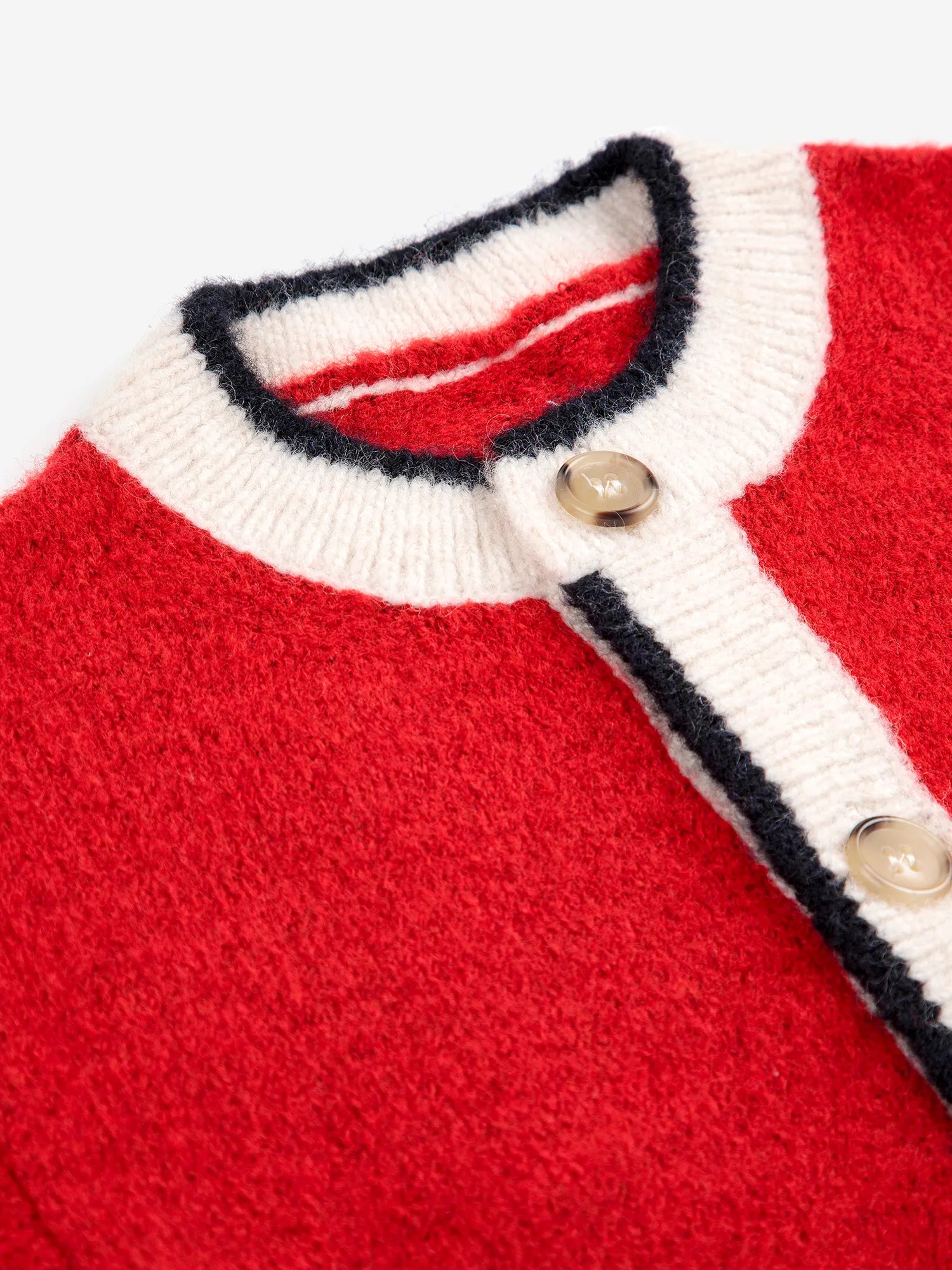 Càrdigan vermell. Amb disseny de màniga llarga, espatlla caiguda, tancament amb botons al davant, punys i baix de canalé, intàrsia, ajust folgat, brodat i coll rodó. Fabricat a Espanya.