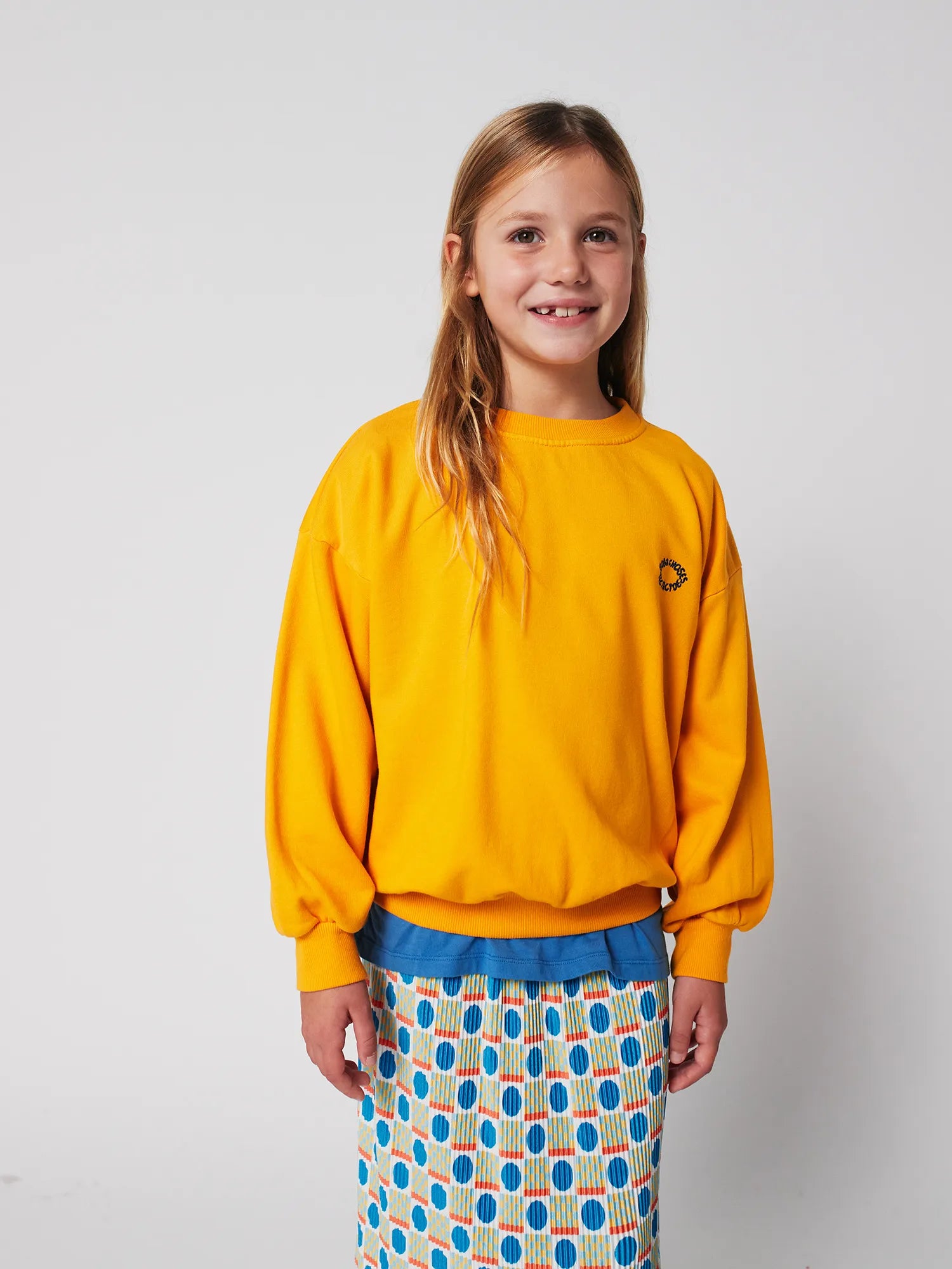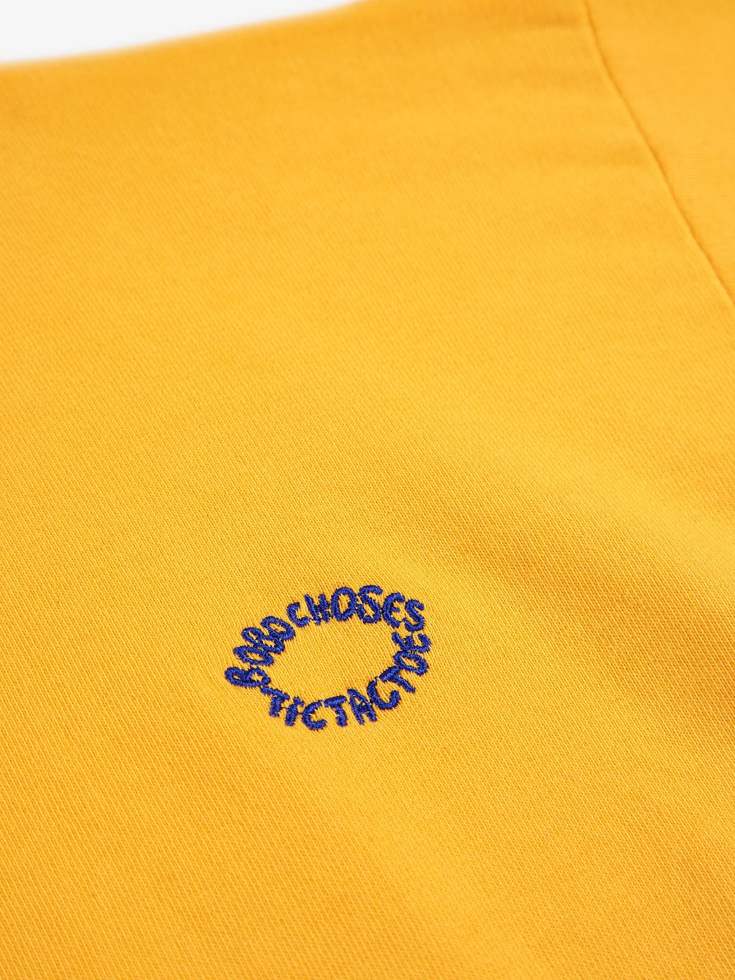 Dessuadora groga. Dissenyada de màniga llarga, punys de canalé, brodat, ajust folgat, baix de canalé i coll rodó. Fabricat a Espanya.