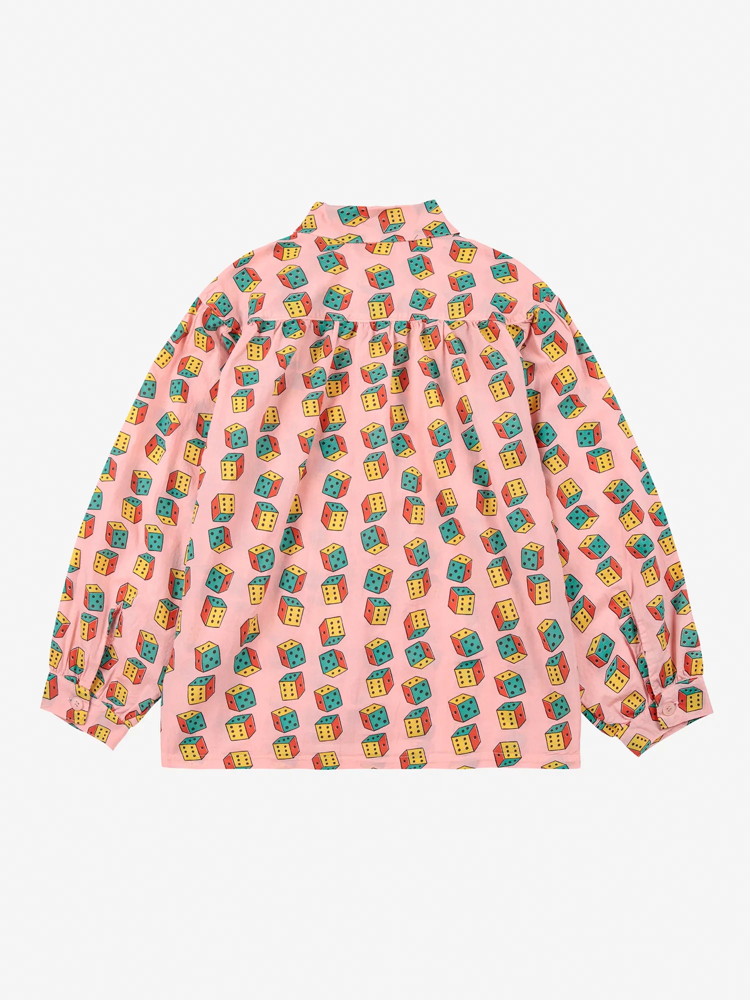 Brusa rosa. Dissenyada amb coll de sastre, màniga llarga, tancament amb botons al davant, punys amb botons, detall frunzit, ajust folgat i vora de brusa. Fabricat a Espanya.