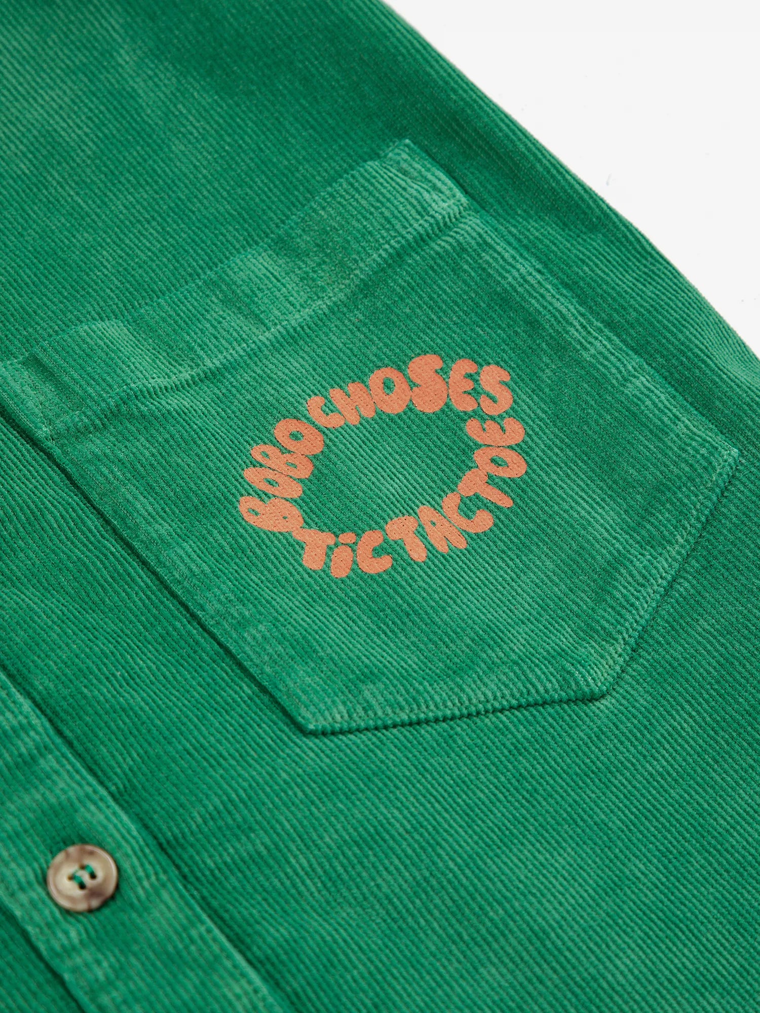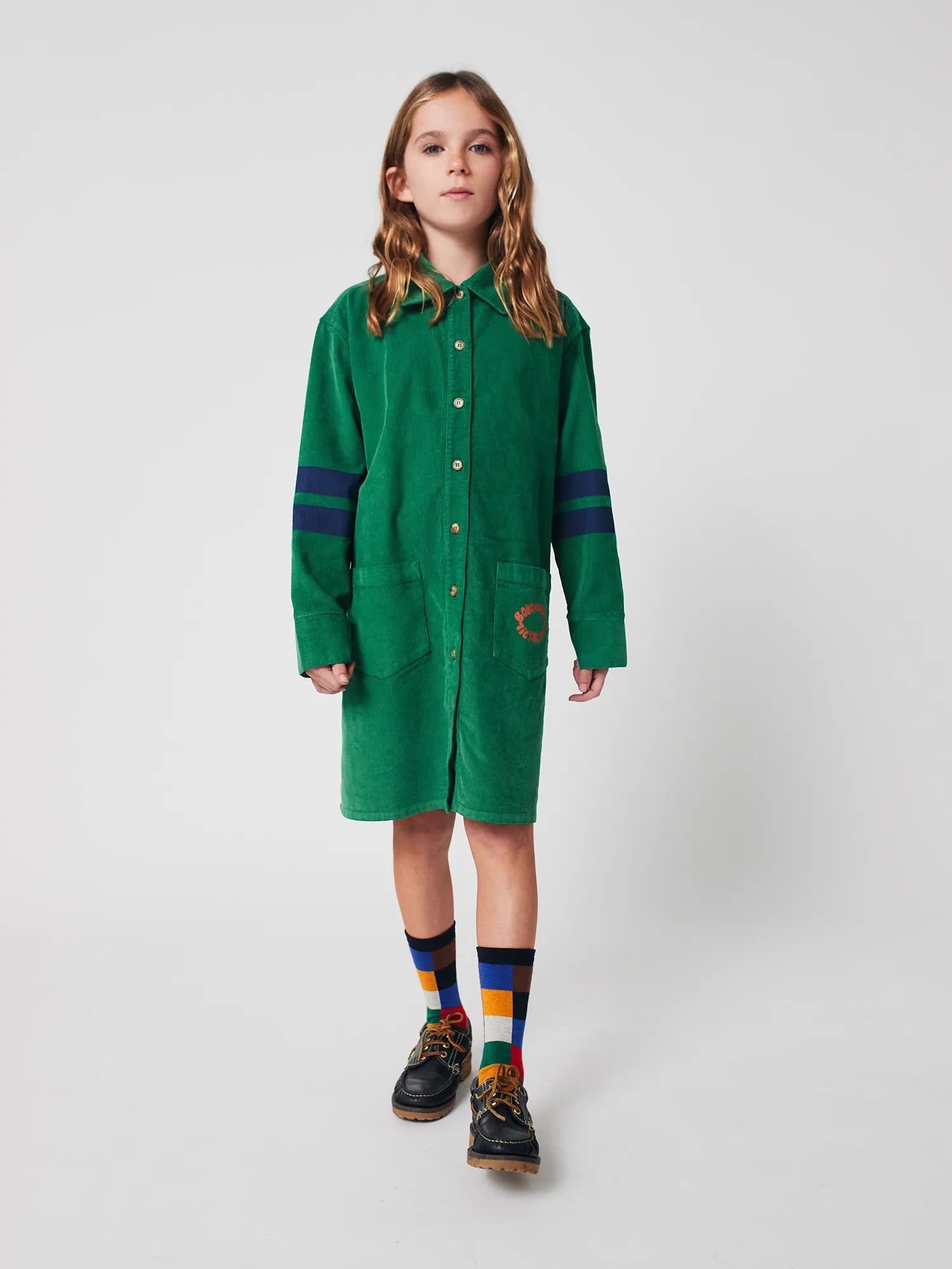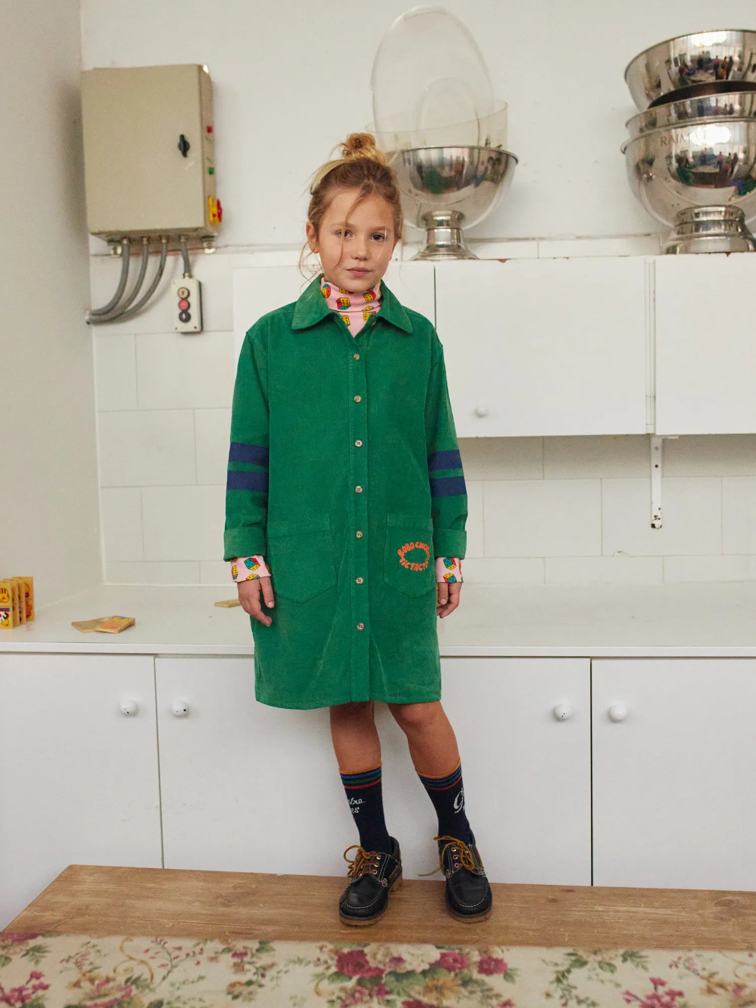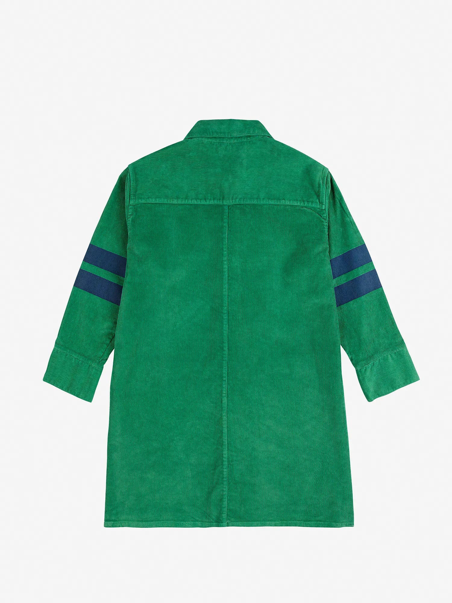 Vestit verd. Dissenyat amb coll de sastre, màniga llarga, tancament amb botons al davant, punys amb botons, butxaca de pedaç al pit, ajust recte, amb vora, canesú al darrere, llargada fins als genolls i pana.