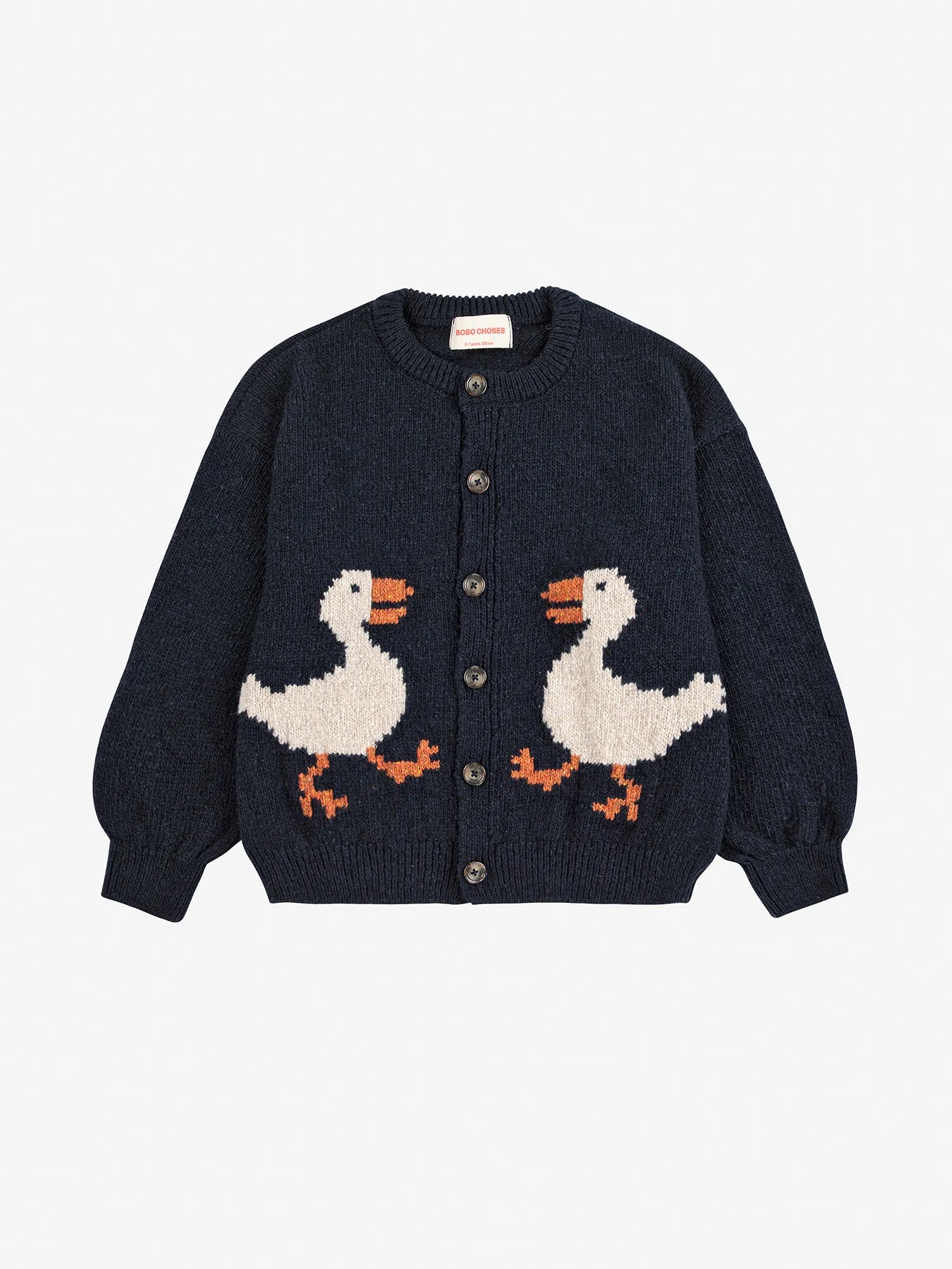 Càrdigan blau marí. Dissenyat amb coll rodó, màniga llarga, tancament amb botons al davant, punys i baix de canalé, intàrsia, ajust folgat i brodat. Fabricat a Portugal.