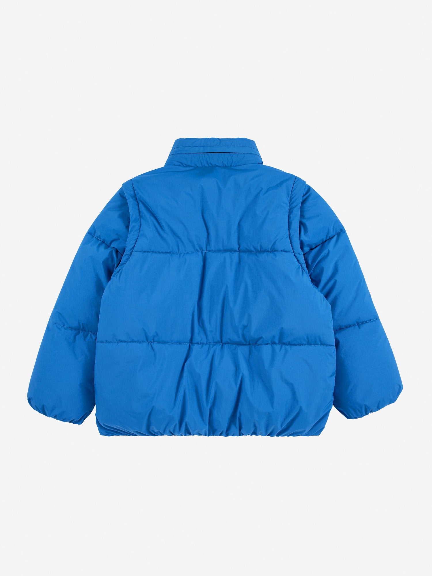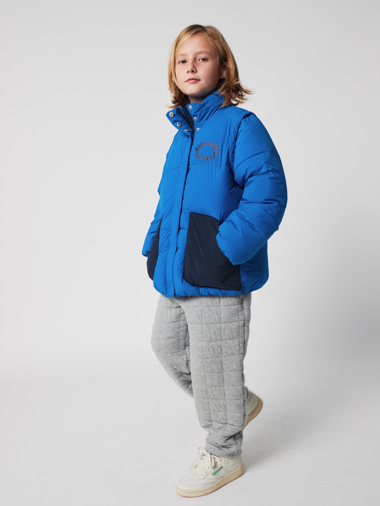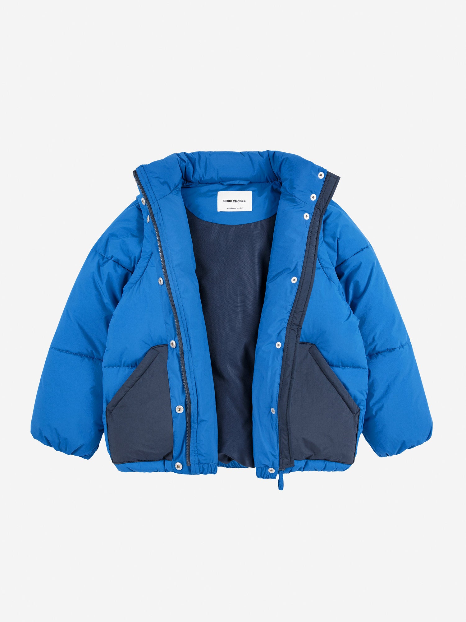 Anorac blau. Dissenyat amb caputxa, màniga llarga, tancament a pressió al davant, amb cremallera, baix elàstic, punys elàstics, folre reciclat, coll alt, butxaca de pedaç i ajust relaxat. Fabricat a la Xina.