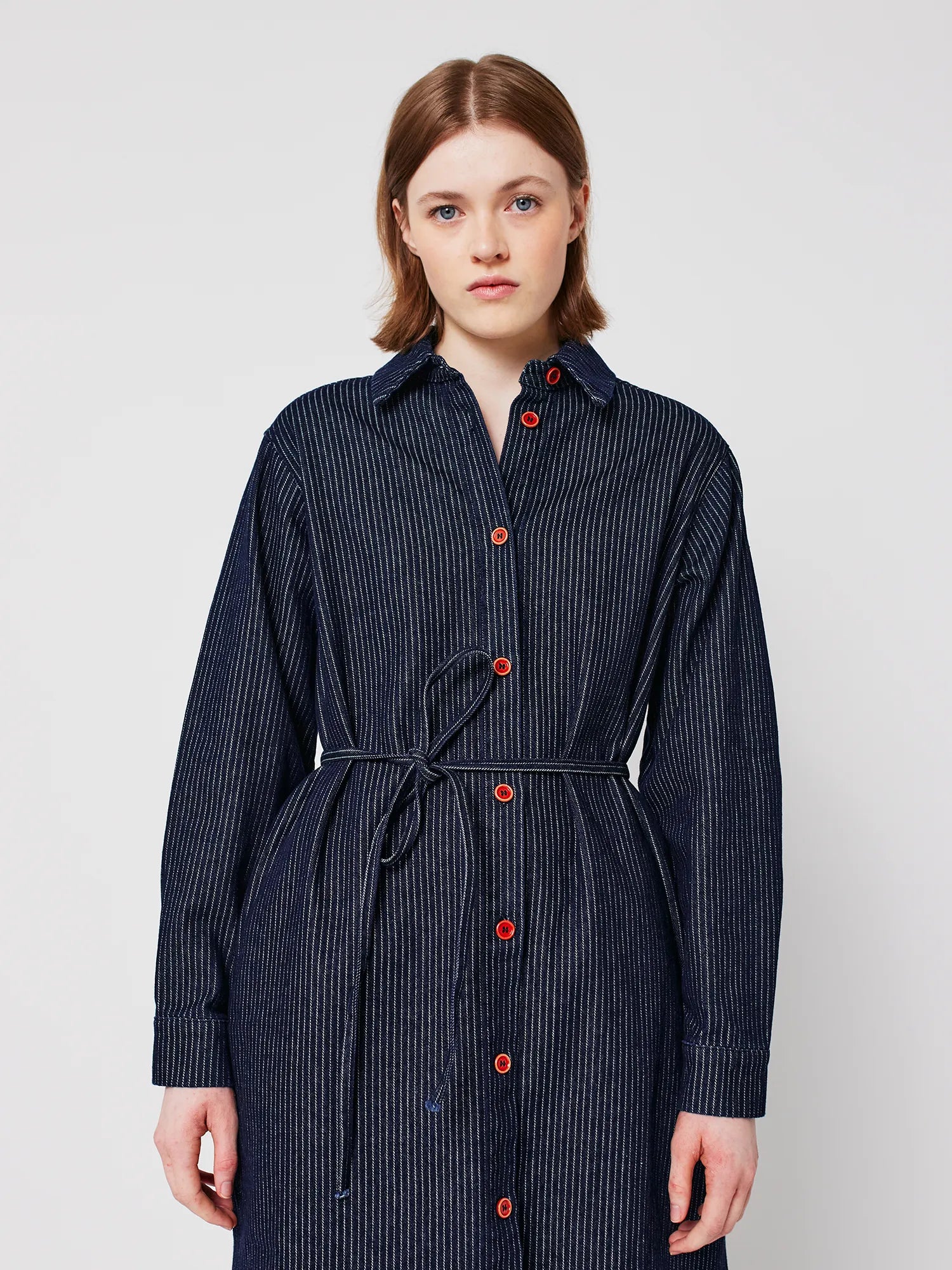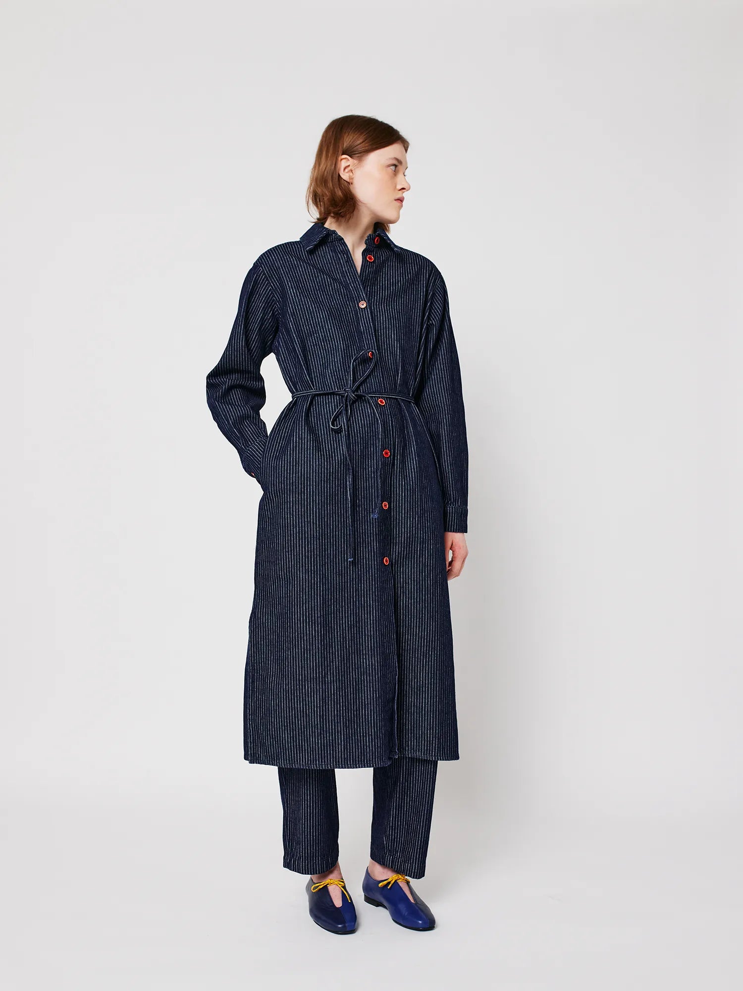 Vestit blau marí. Dissenyat amb longitud midi, teixit no elàstic, teixit de pes mitjà i dissenyat amb butxaques.