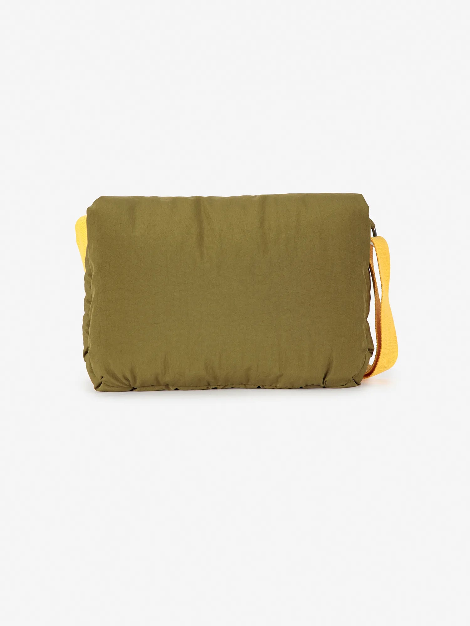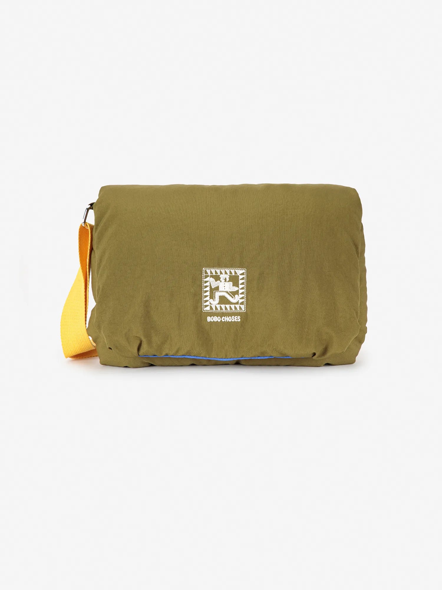 Bossa de mà caqui. Dissenyada amb tancament de botó a pressió. Fabricat a la Xina.