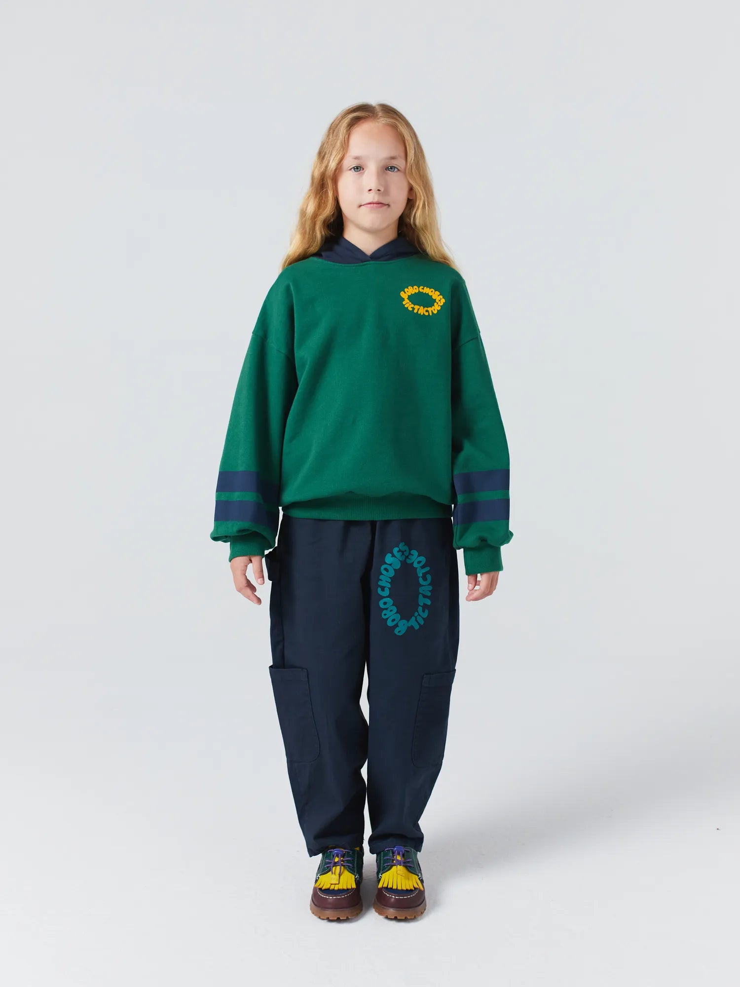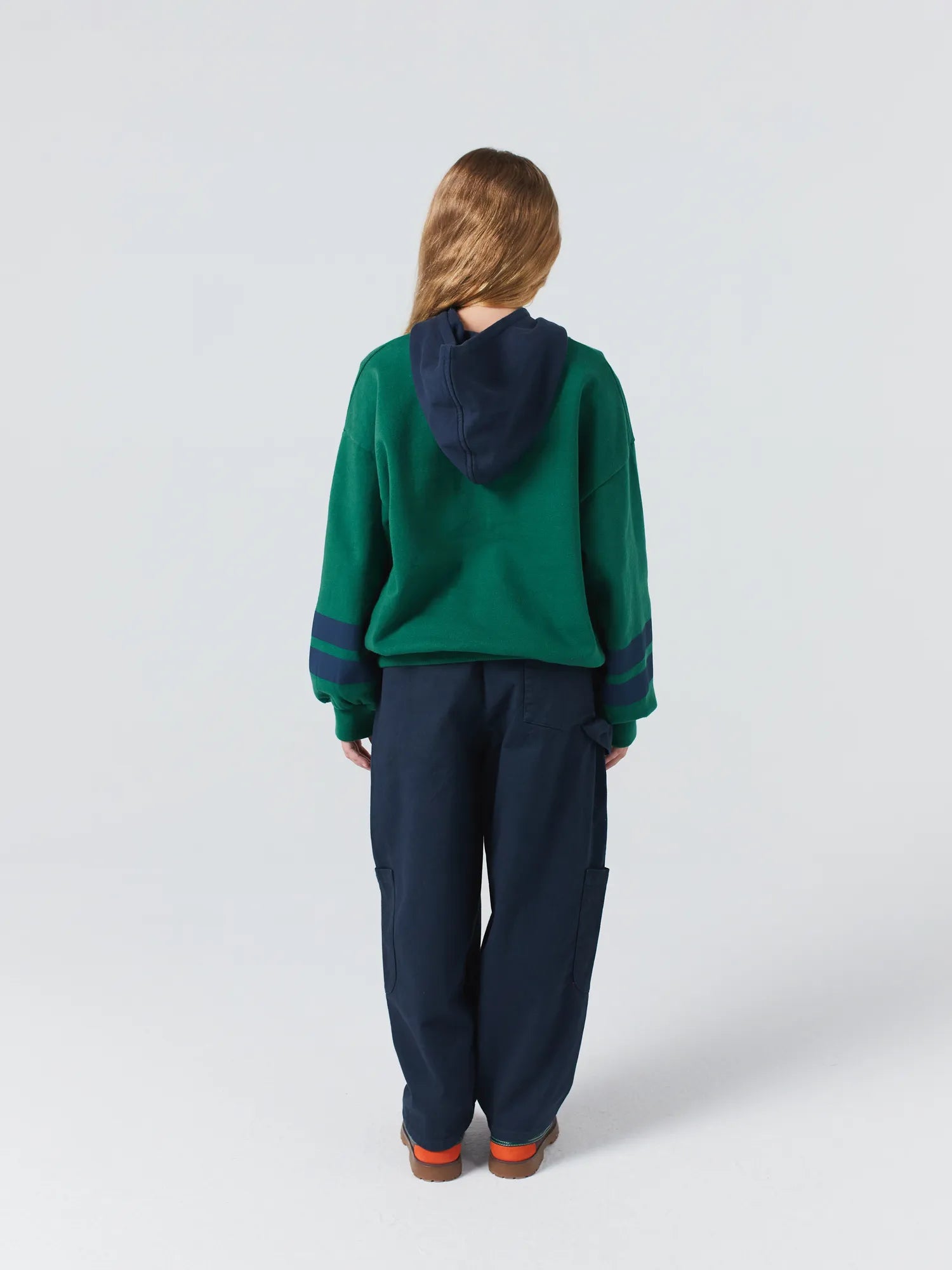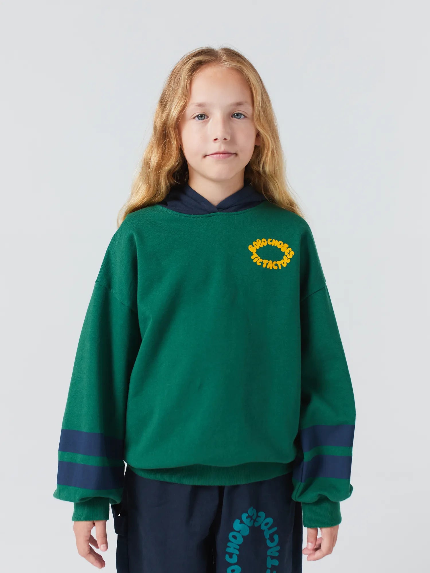 Dessuadora verda. Dissenyada de màniga llarga, amb caputxa, punys de canalé, ajust folgat i baix de canalé. Fabricat a Portugal.