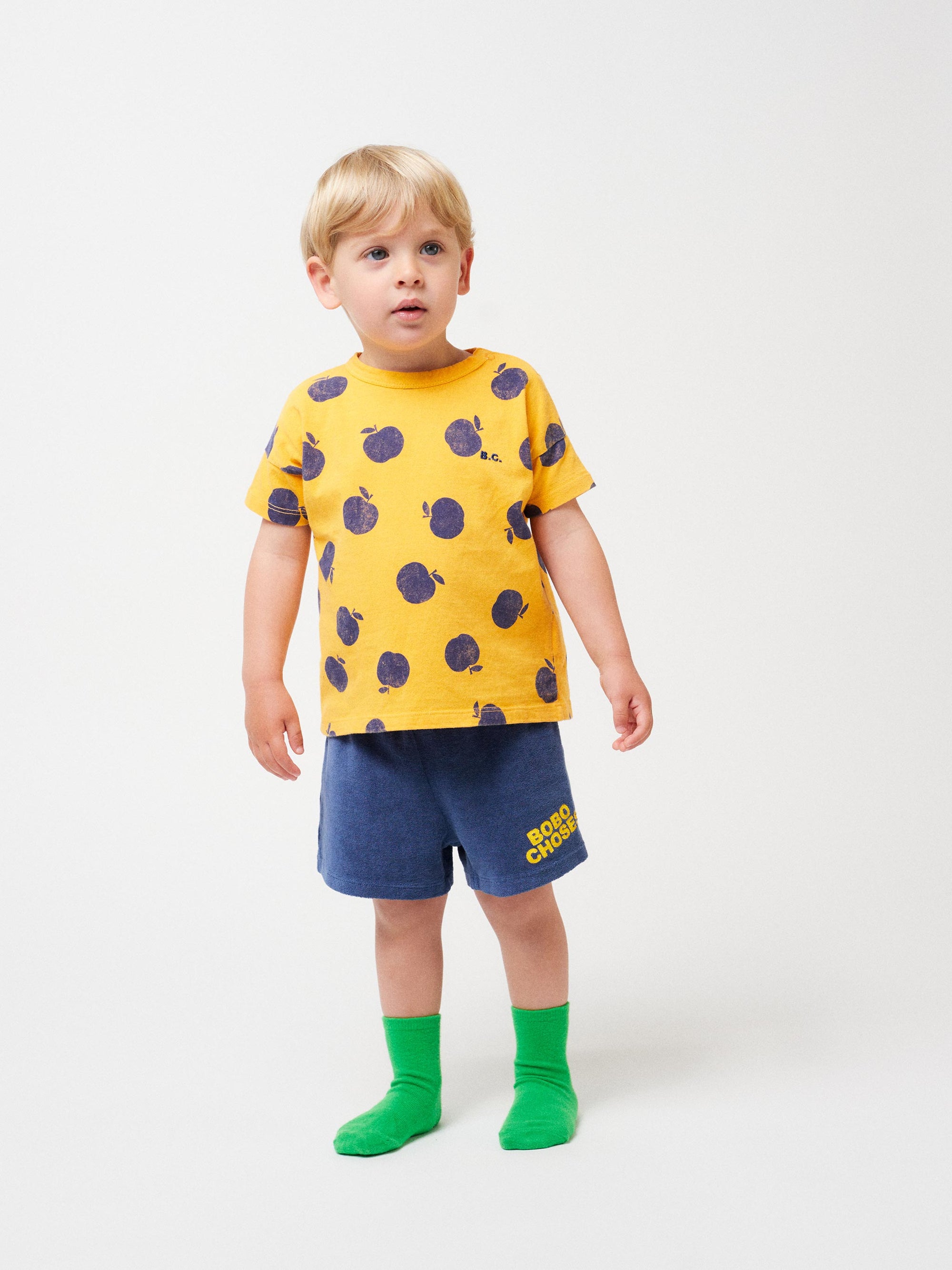El divertit color groc de la samarreta "Poma", amb un estampat ple de les emblemàtiques pomes de color blau nit, despertarà a l'instant la curiositat innata del teu nadó per descobrir el món. Amb l'objectiu de cuidar aquests petits exploradors, hem dissenyat aquesta peça per mantenir-los frescos i secs durant les seves aventures.
