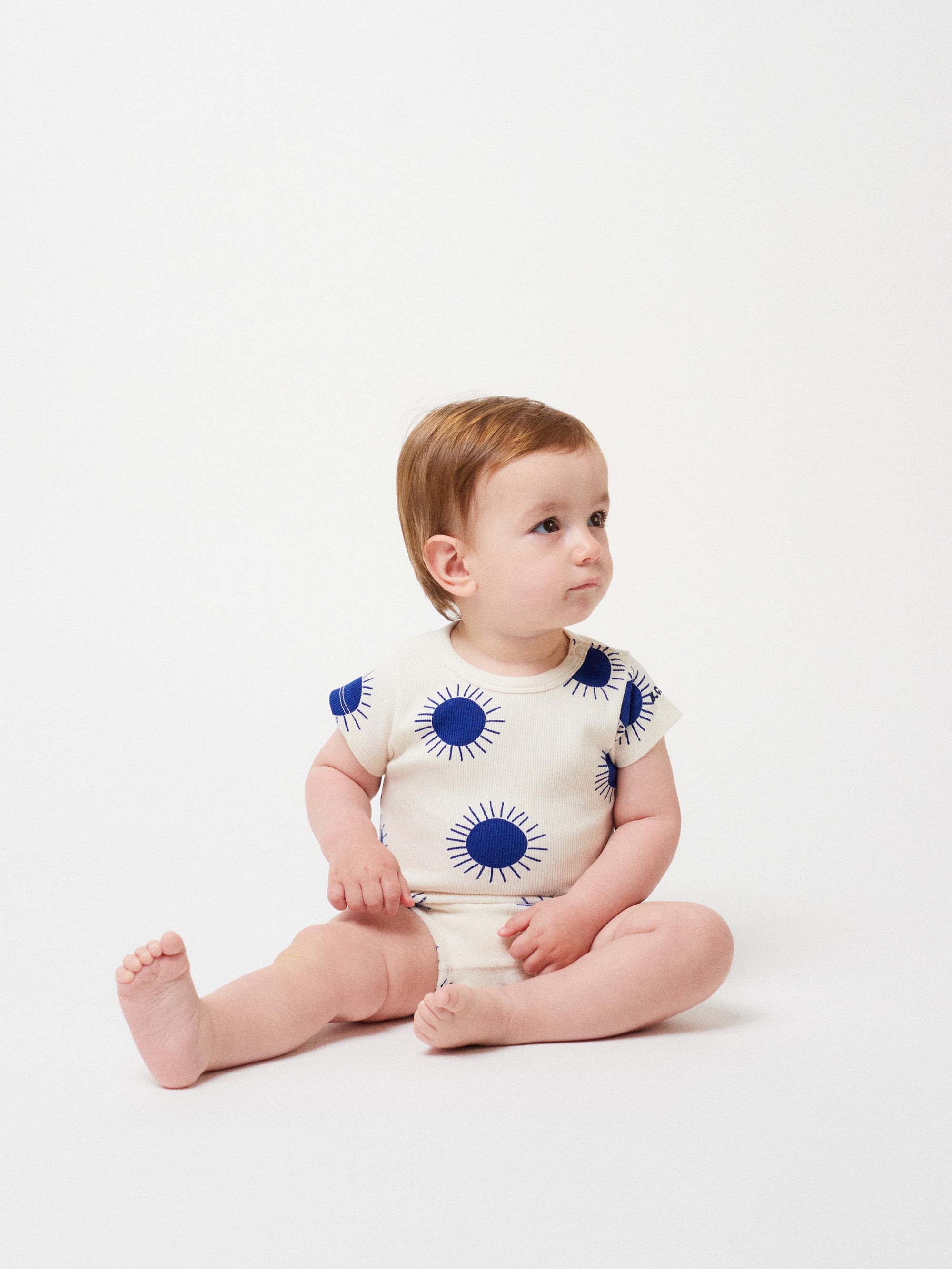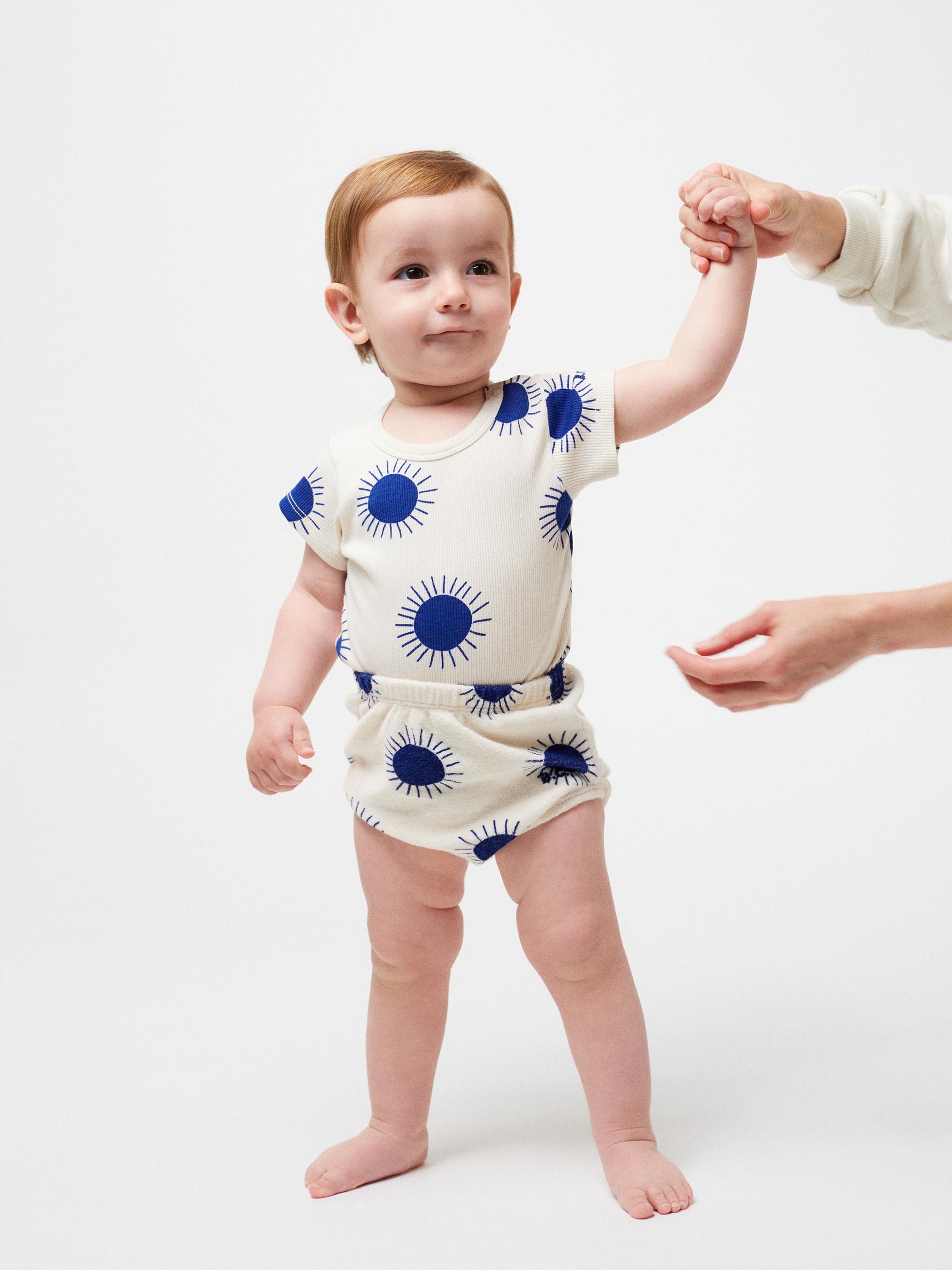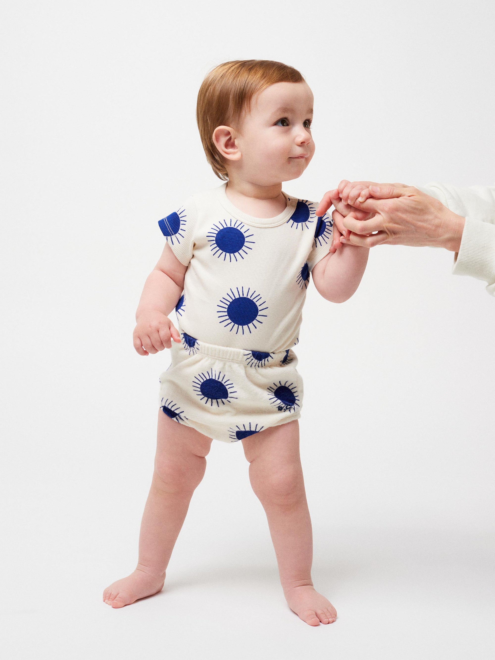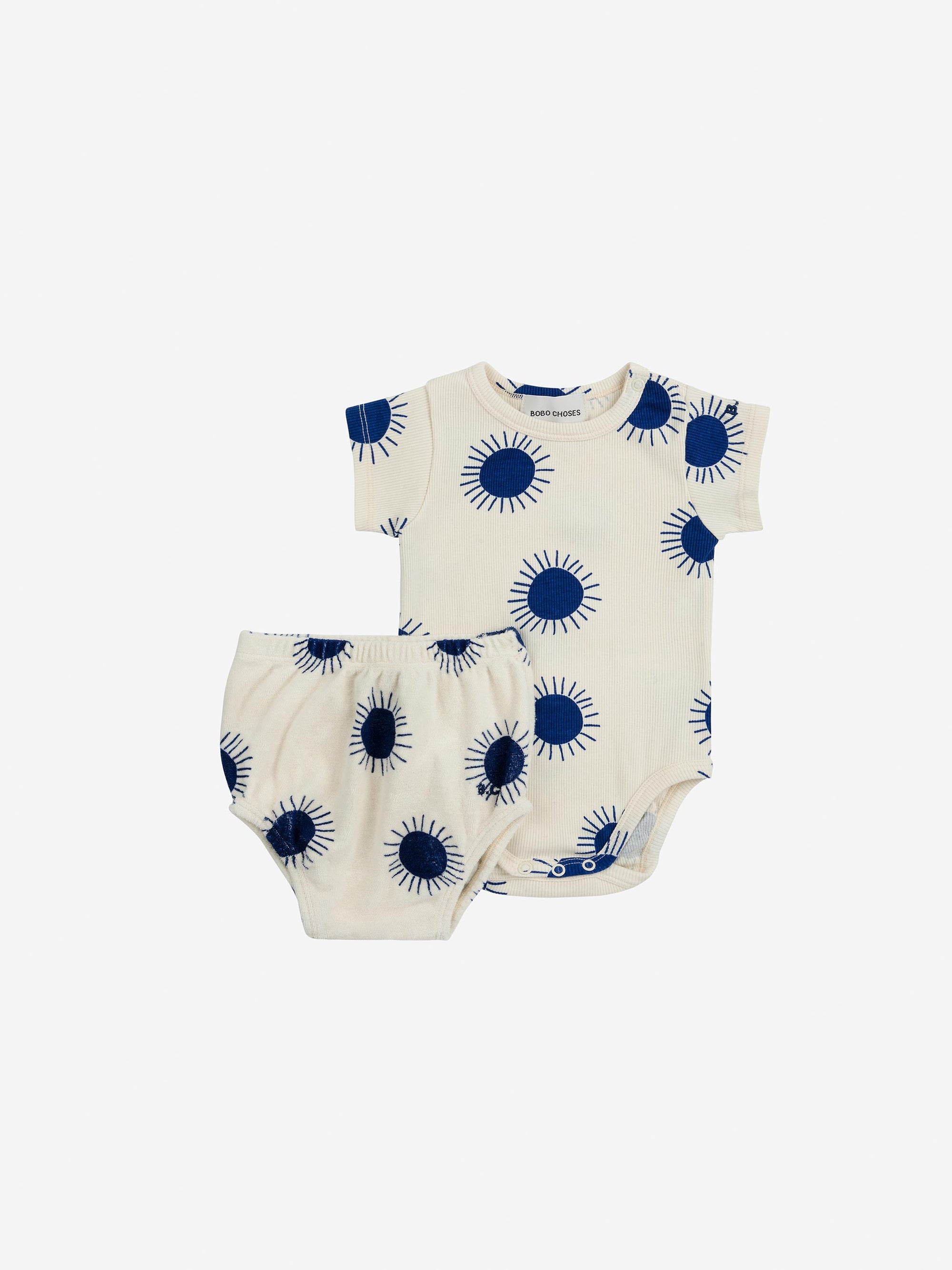 Descobreix el conjunt de bodi i pantalons "Sun" per a nadons, de color os i amb un estampat integral dels sols emblemàtics de color blau nit de Bobo Choses. Aquesta peça bàsica es mantindrà al seu lloc i proporcionarà als petits exploradors la llibertat de moviment que necessiten en aquesta etapa. Combina el conjunt amb altres peces per crear opcions plenes de color.