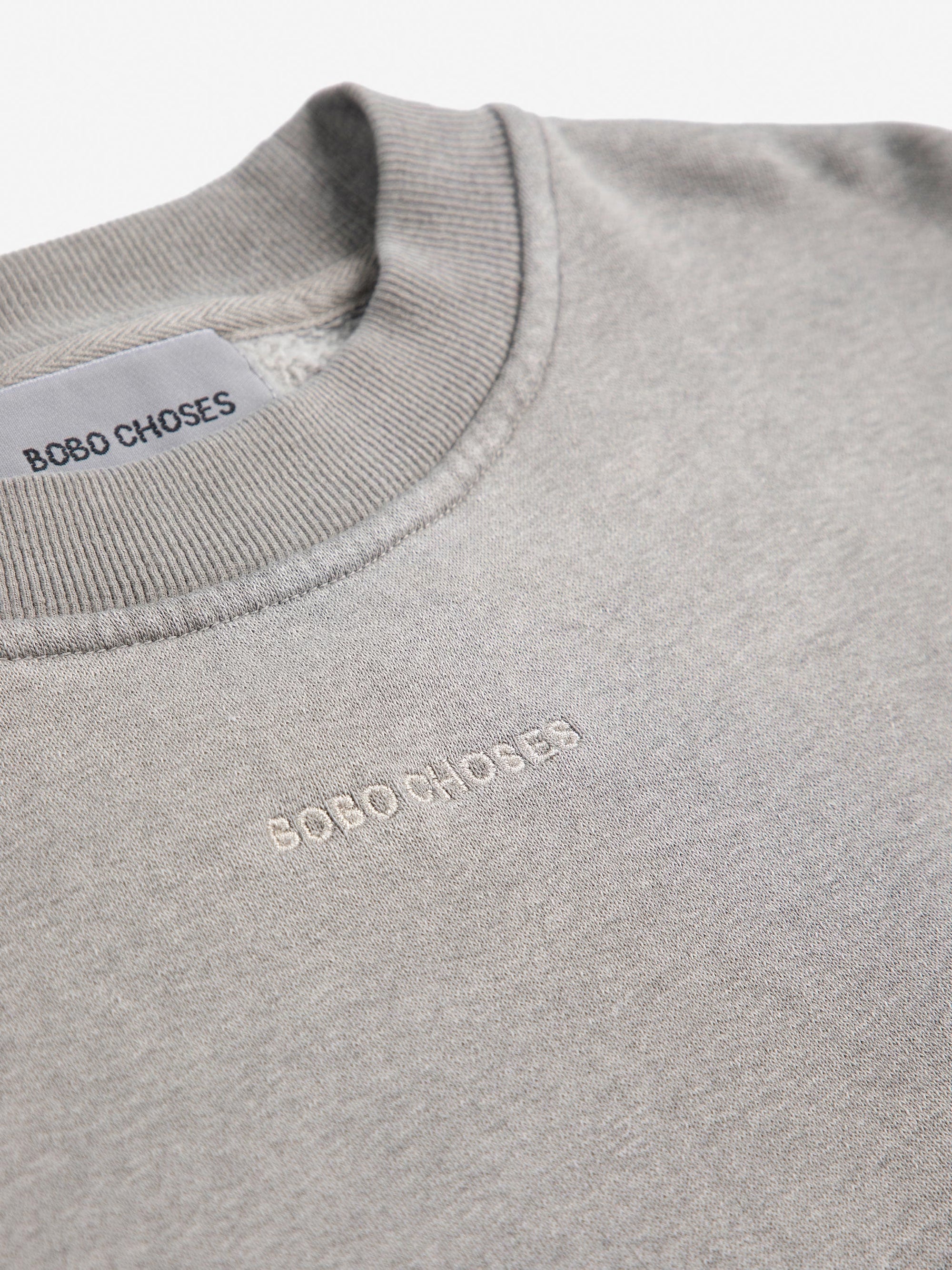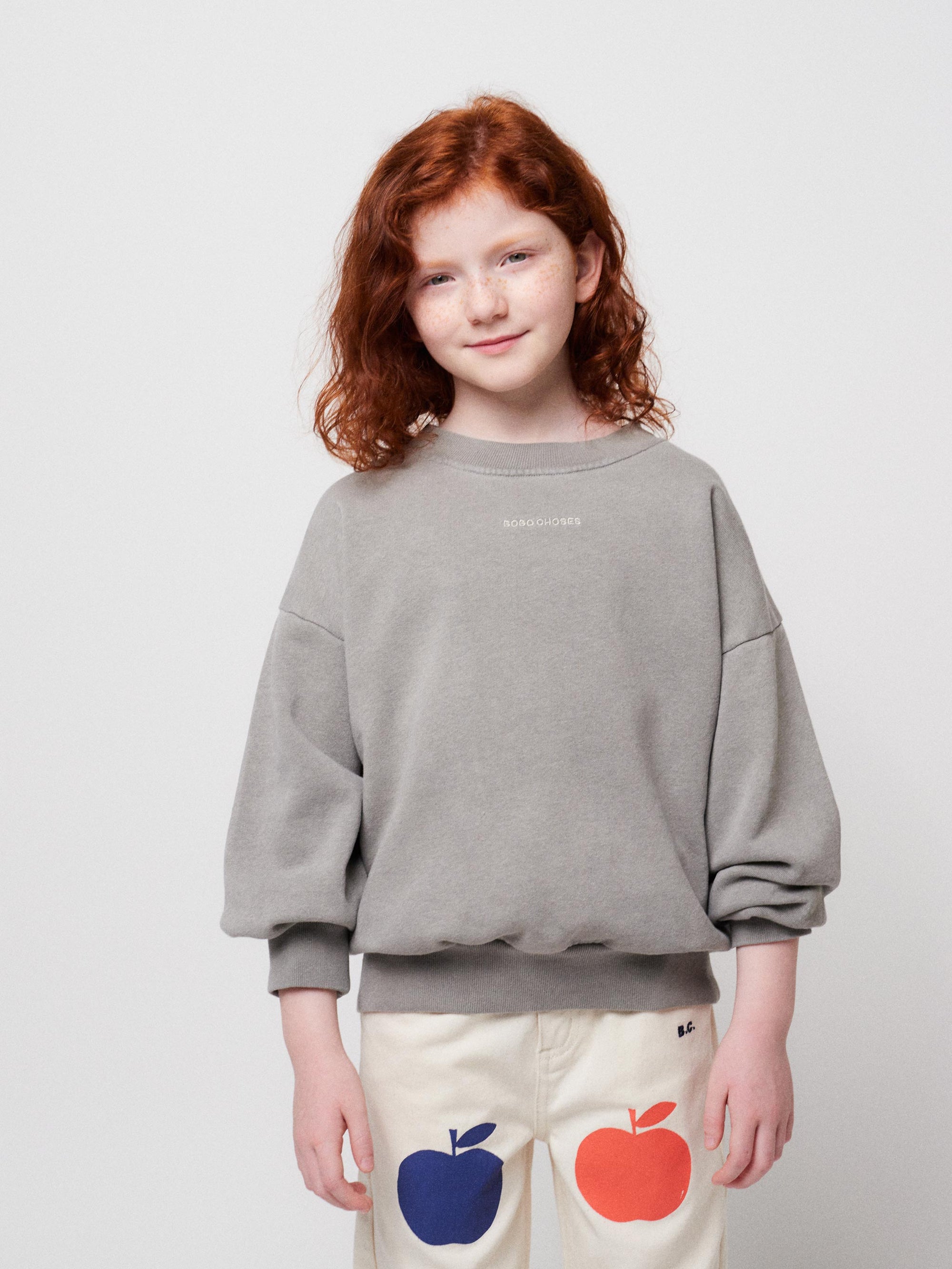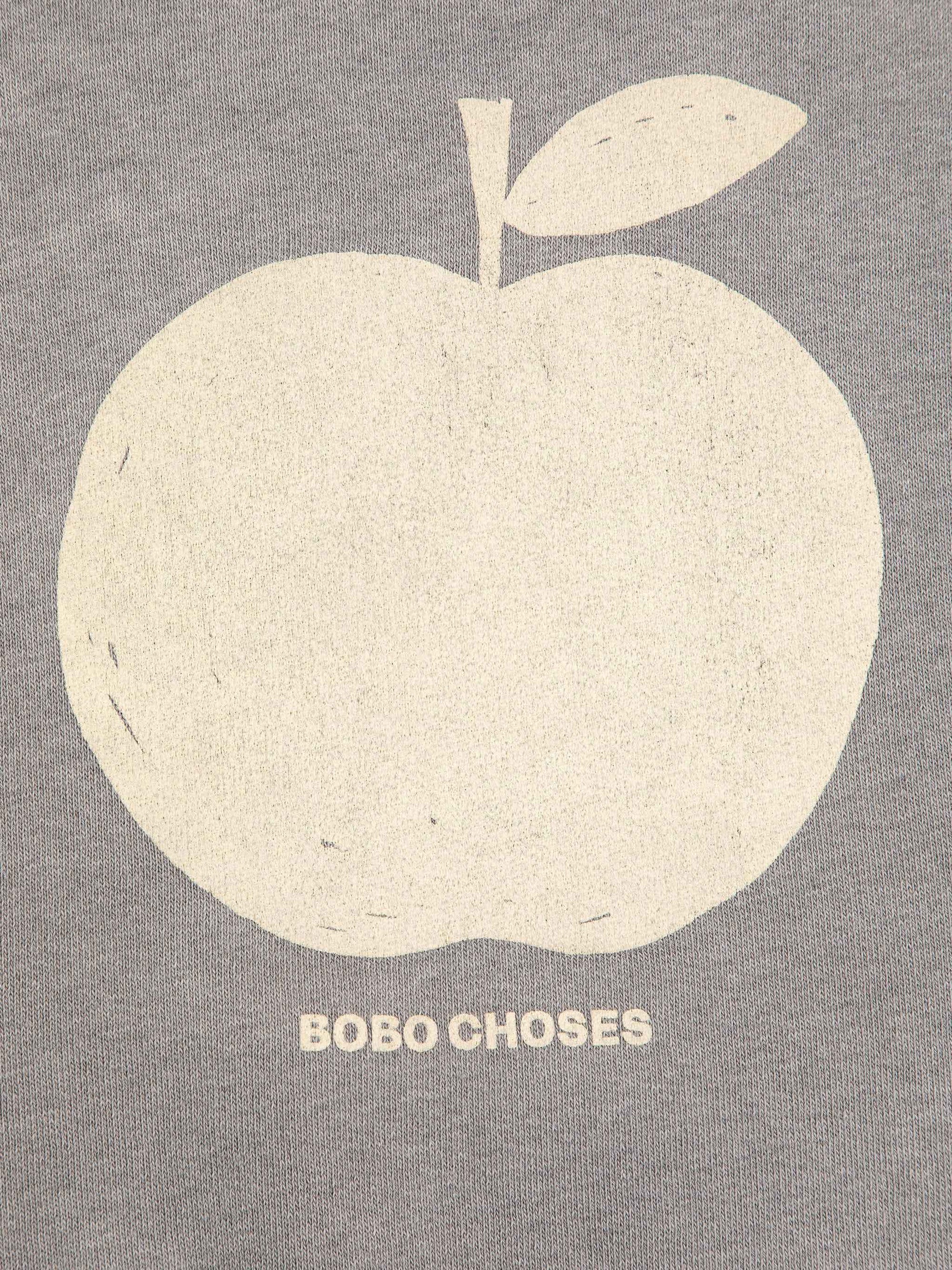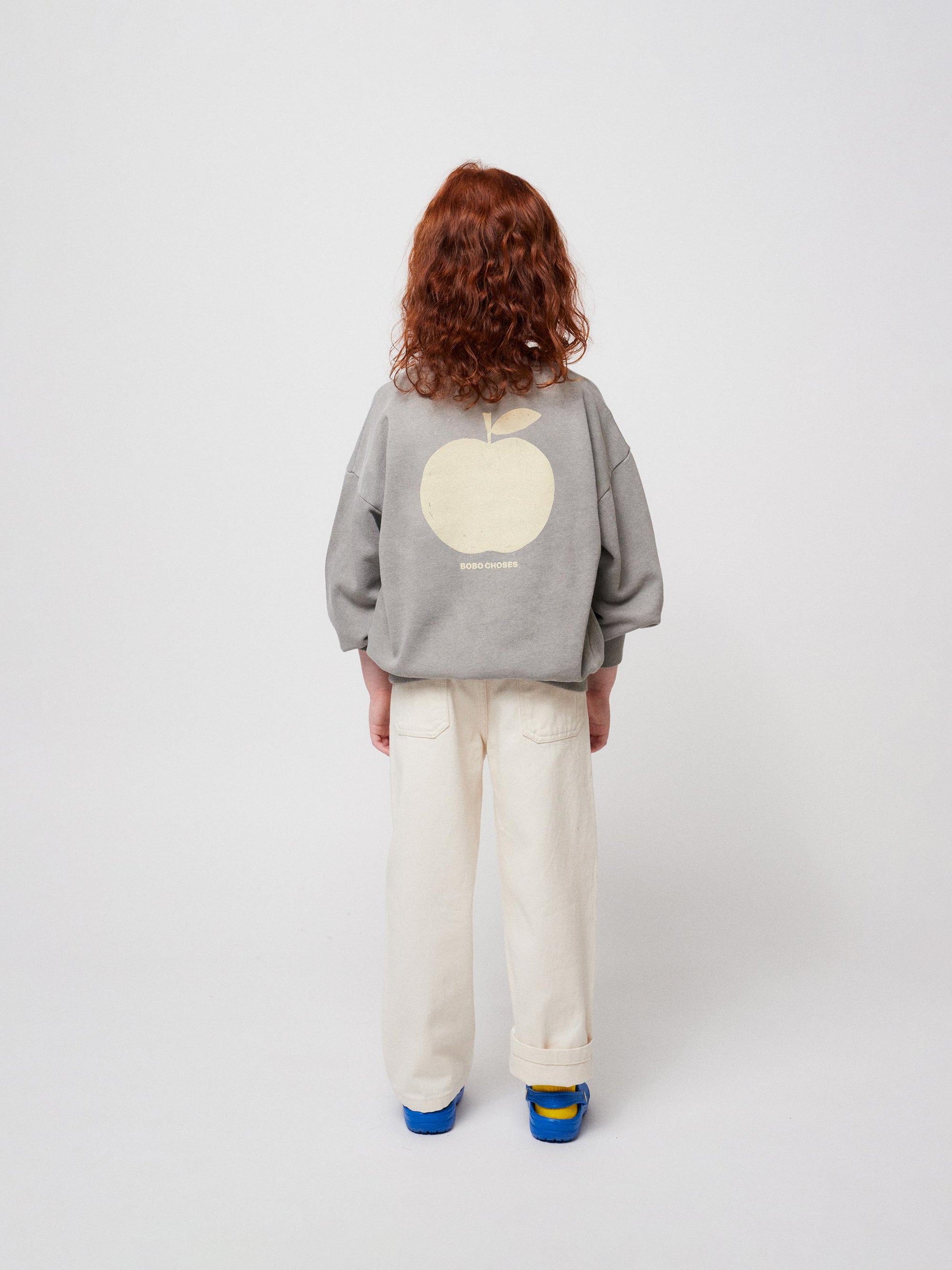 La dessuadora de màniga llarga de color gris Poma per a infants, feta de cotó orgànic amb certificat GOTS, és una peça de roba atemporal que inclou un estampat icònic de color blanquinós d'una gran poma al davant. El seu ajust folgat, amb punys i baix de canalé per mantenir-la al seu lloc, ofereix llibertat de moviment, mentre que l'interior de folre polar raspallat els manté calents.