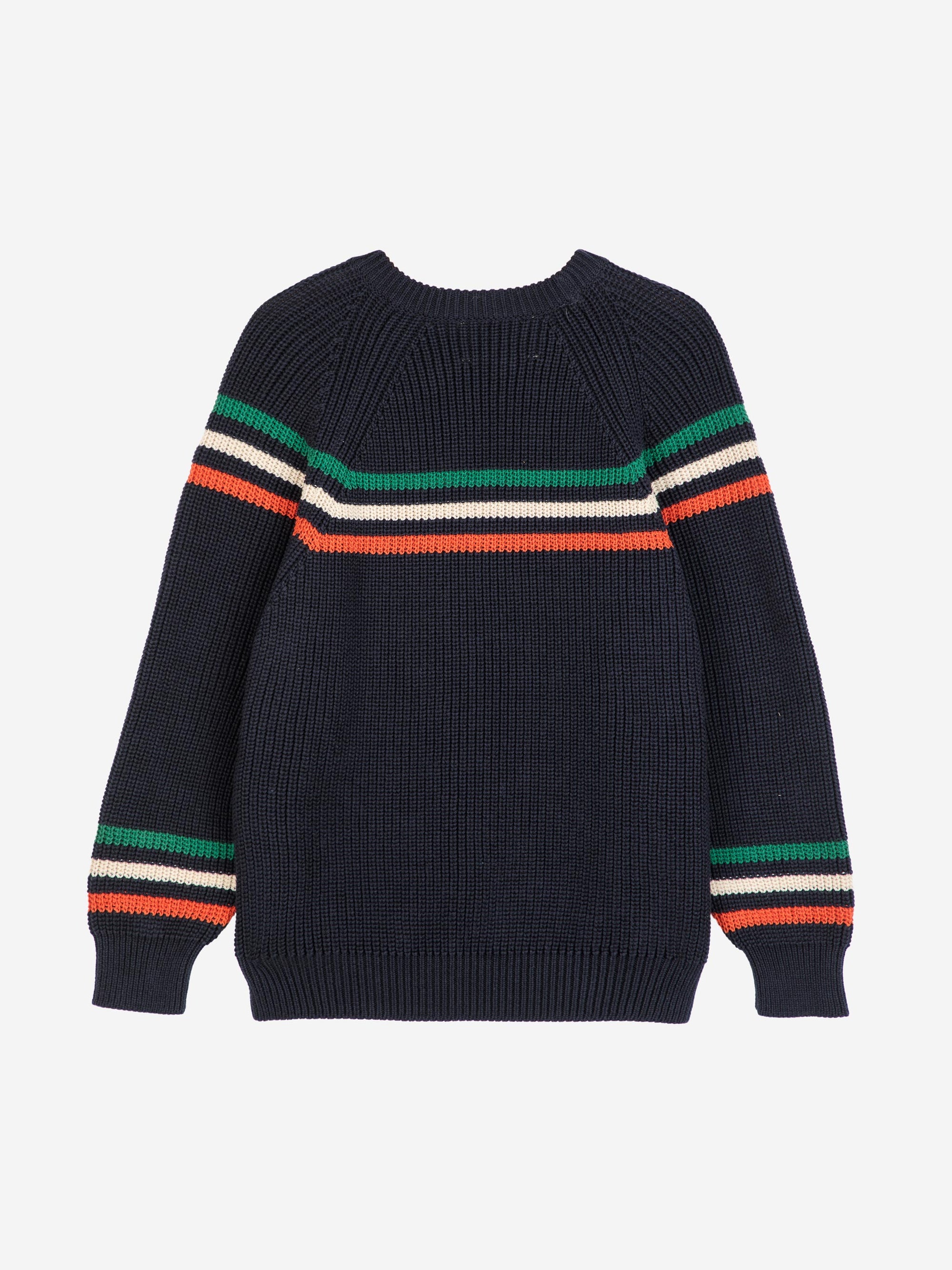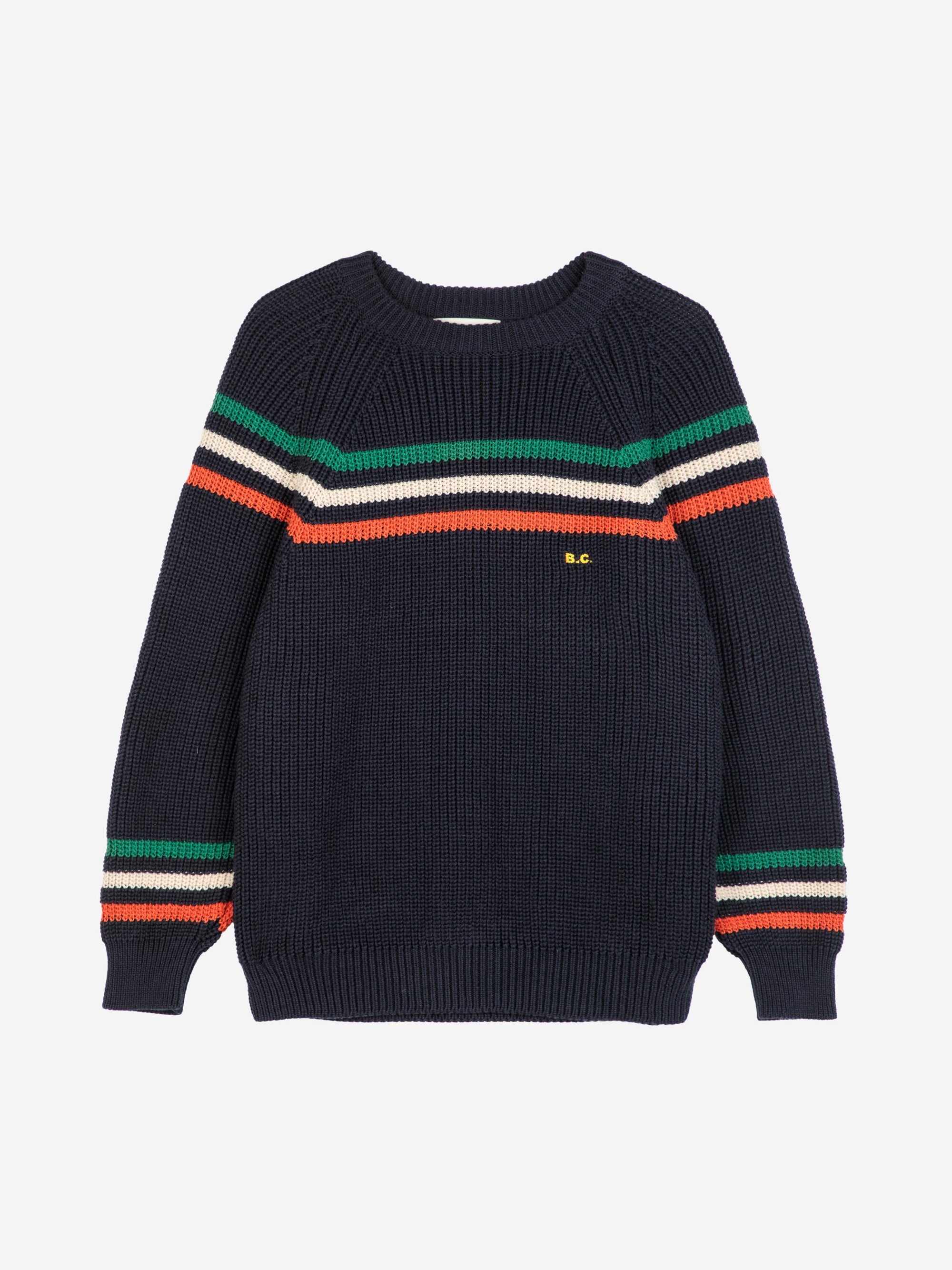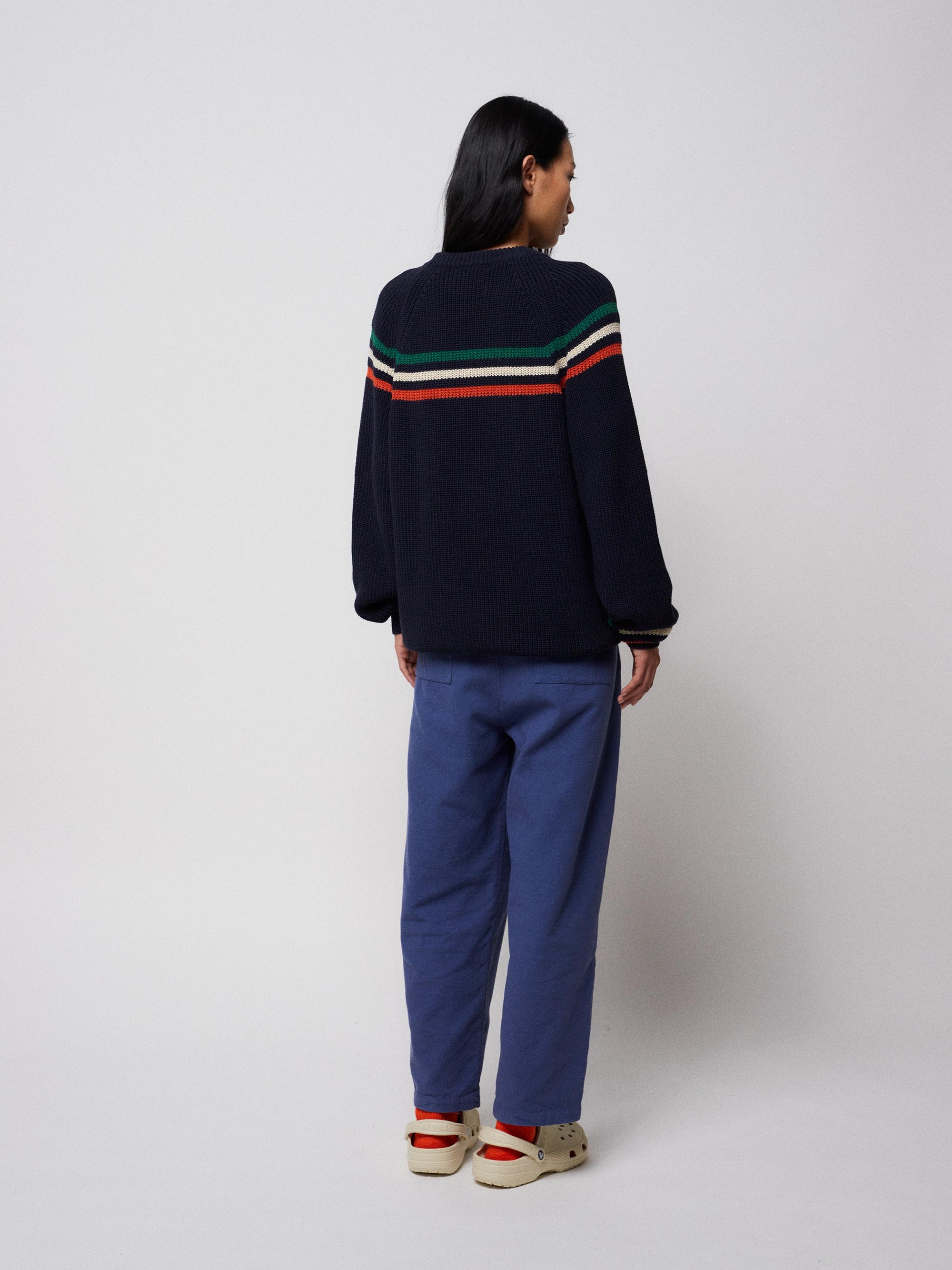 El jersei blau marí «BC Stripes» està confeccionat amb una mescla de cotó orgànic certificat OCS i viscosa circulose desenvolupada per PYRATEX®. Presenta un estampat en verd, blanc trencat i vermell en el pit i les mànigues, juntament amb un detall brodat. Amb la seva cort lleugerament folgada i el seu teixit elàstic, ofereix un ampli espai i comoditat durant tot el dia.