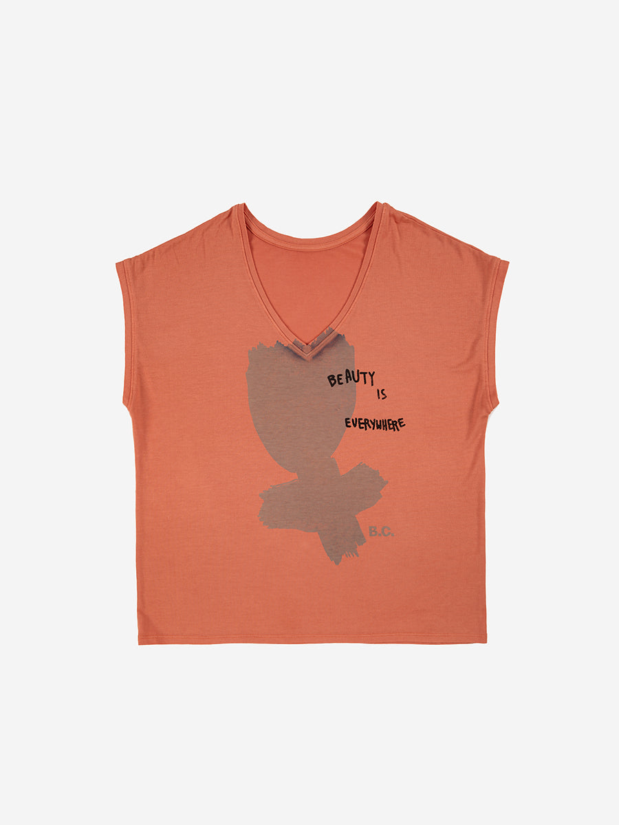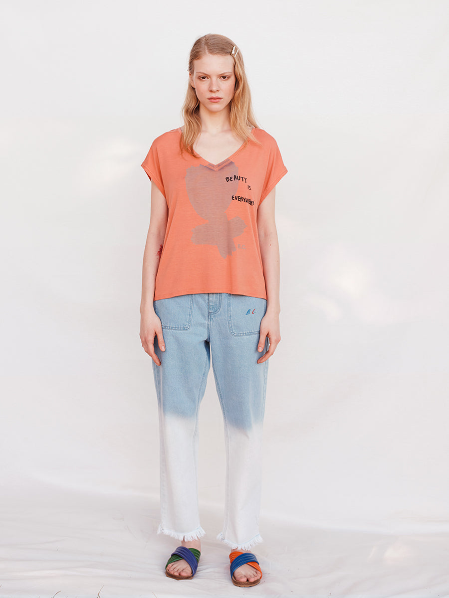 92% modal 8% elastane. salmon pink v neck t-shirt. Made in Spain This is an online exclusive item for Anthropologie. Beauty is everywhere!