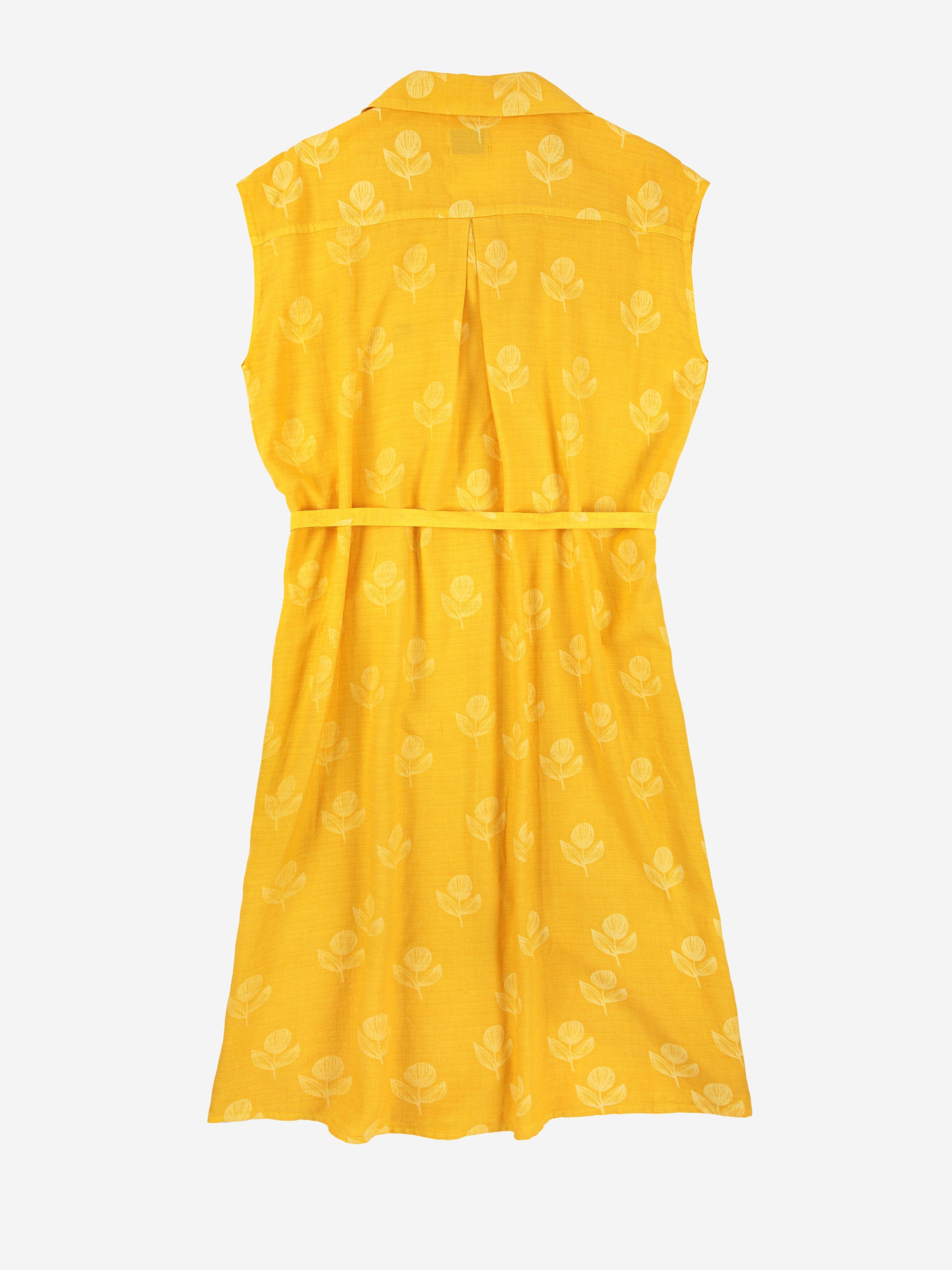 70% lyocell 30% linen yellow sleeveless dress. Designed with tailored collar, front button fastening, embroidery, side slit, beltloop and midi length. It has a loose fit. Made in Spain
