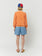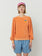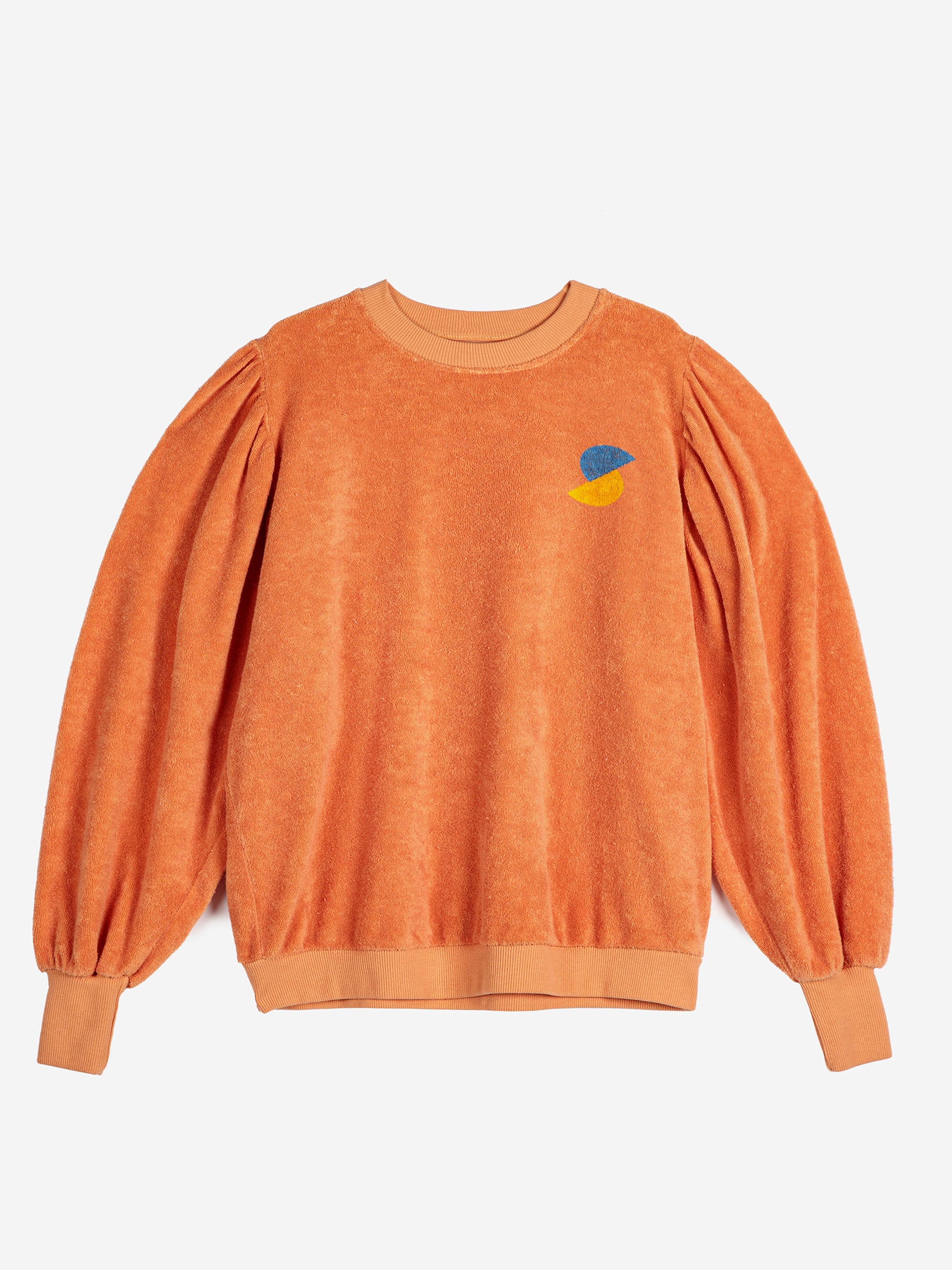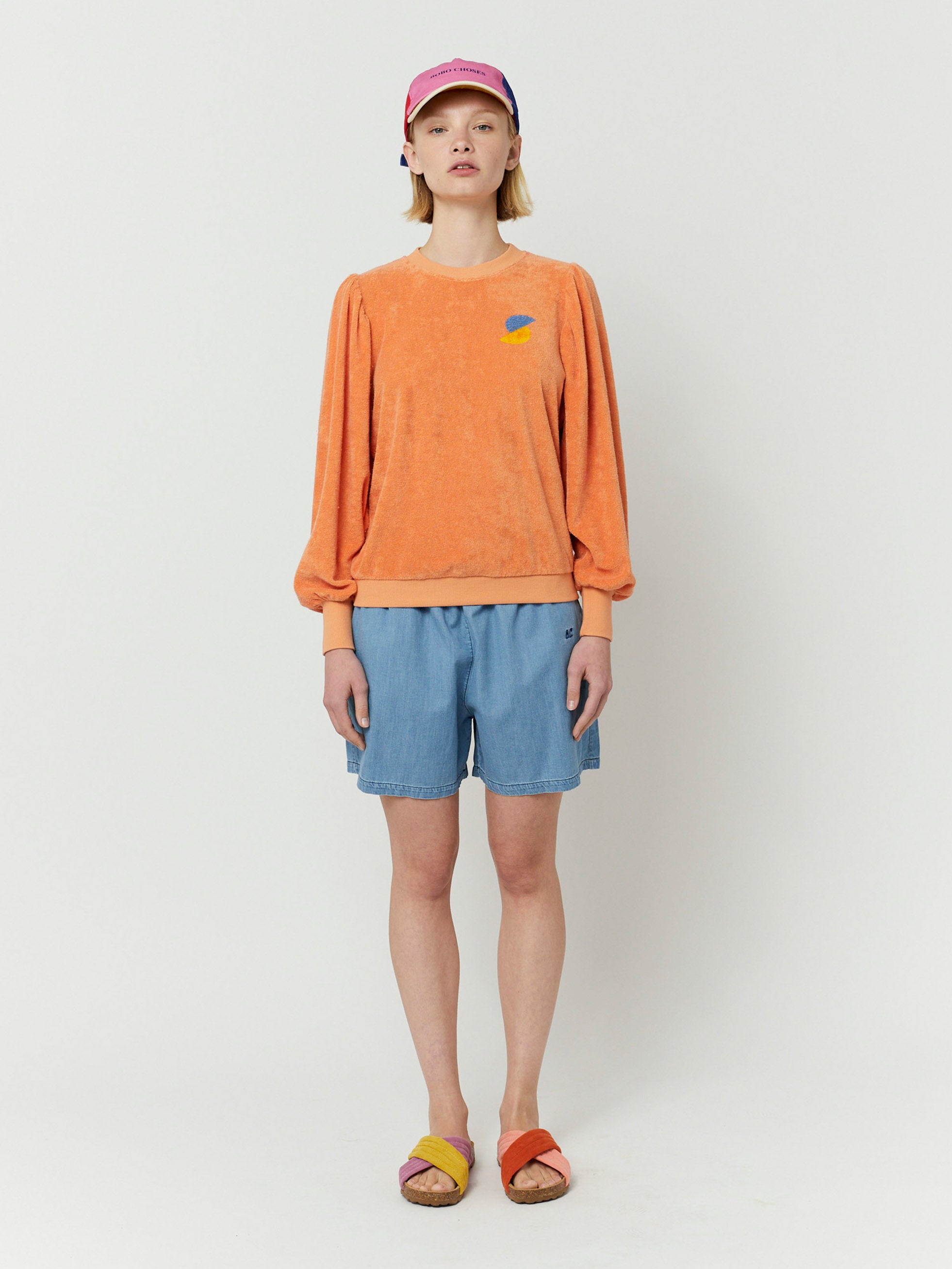 87% organic cotton 13% polyester peach round neck sweatshirt. Designed with long sleeves, ribbed cuffs and ribbed bottom. It has a cropped fit. Made in Spain