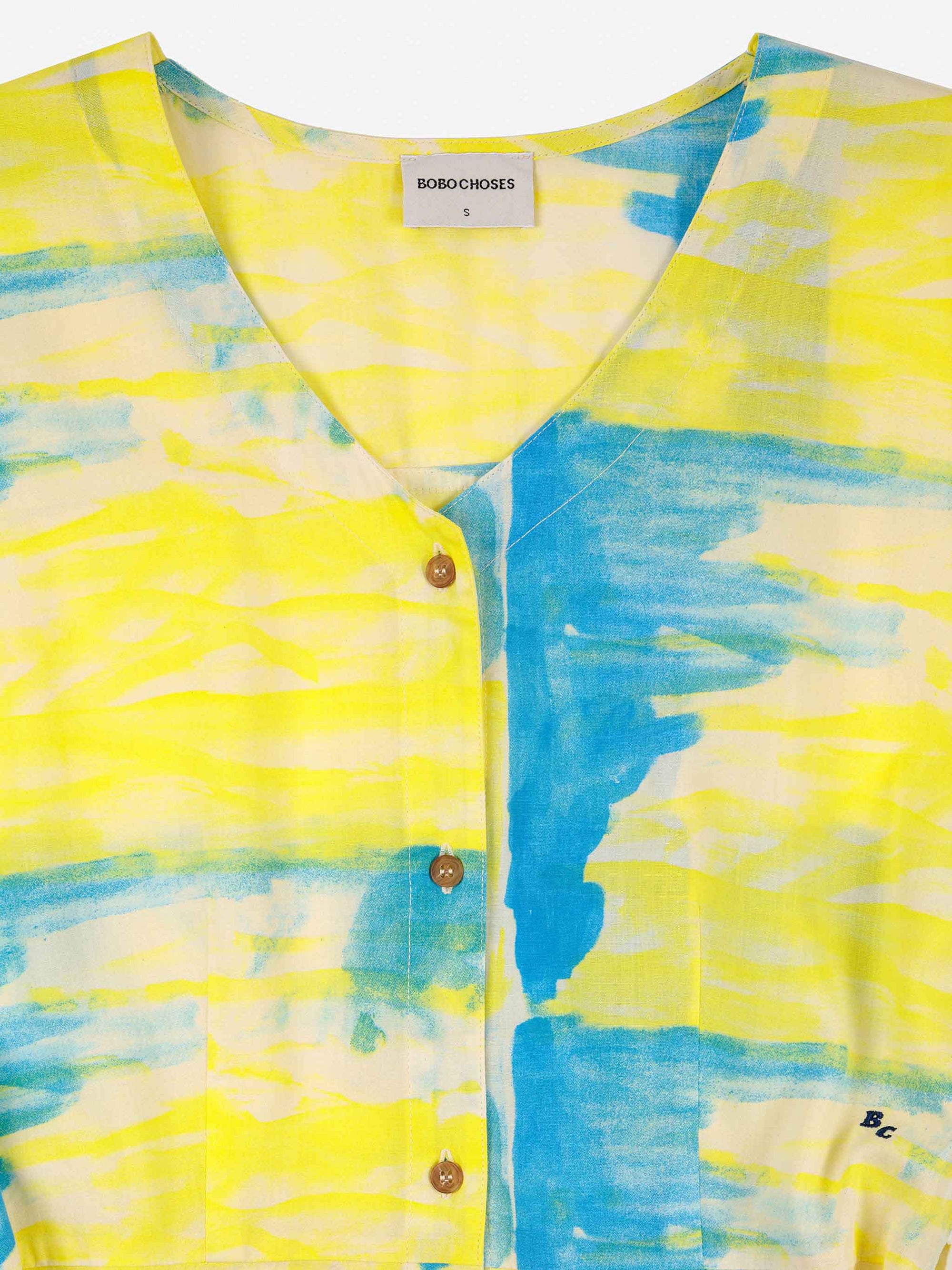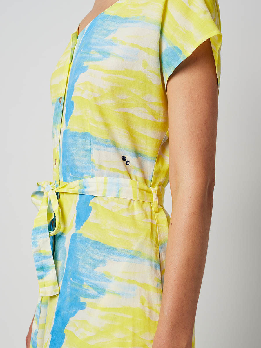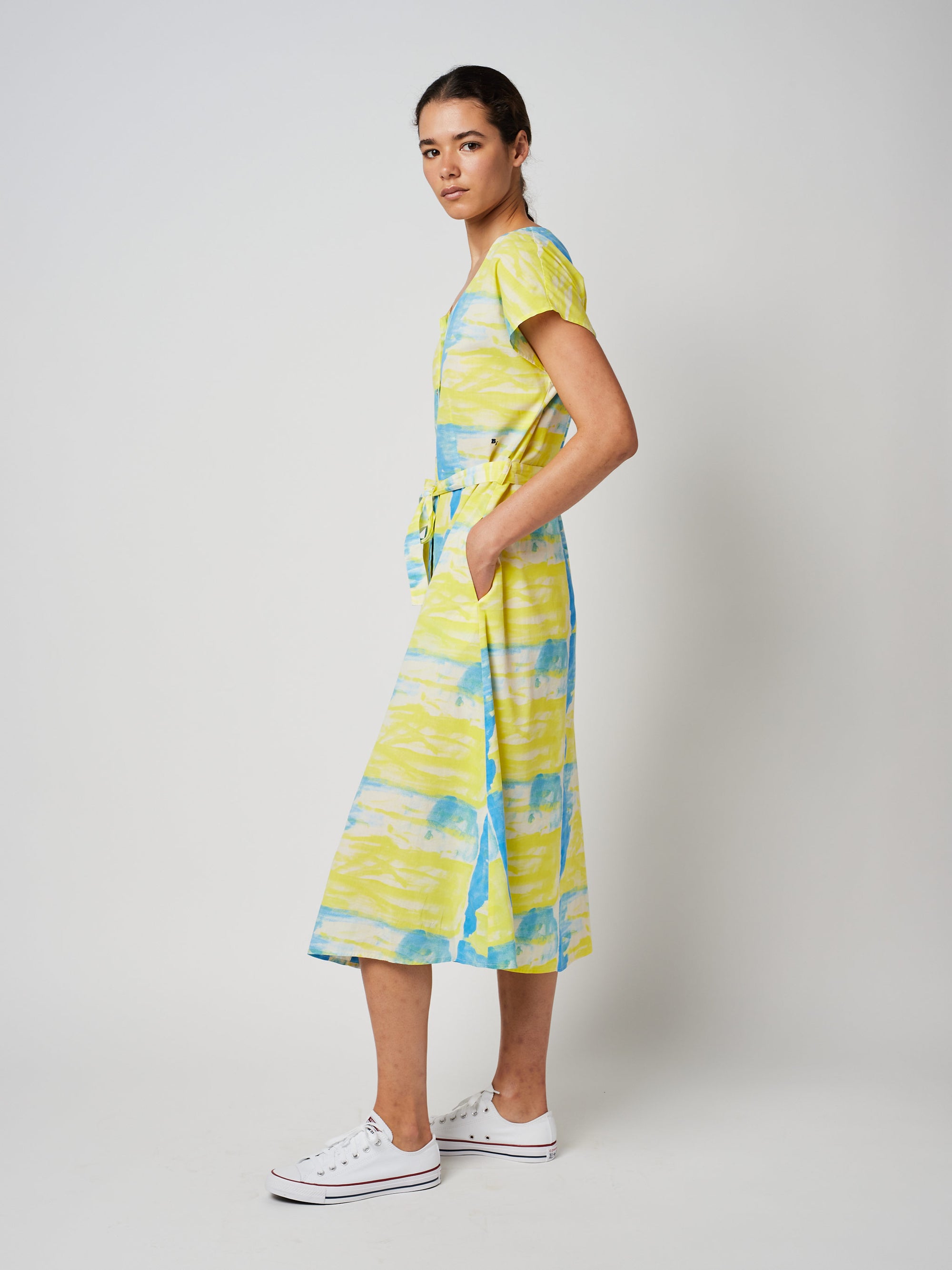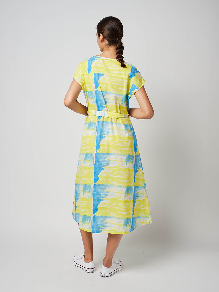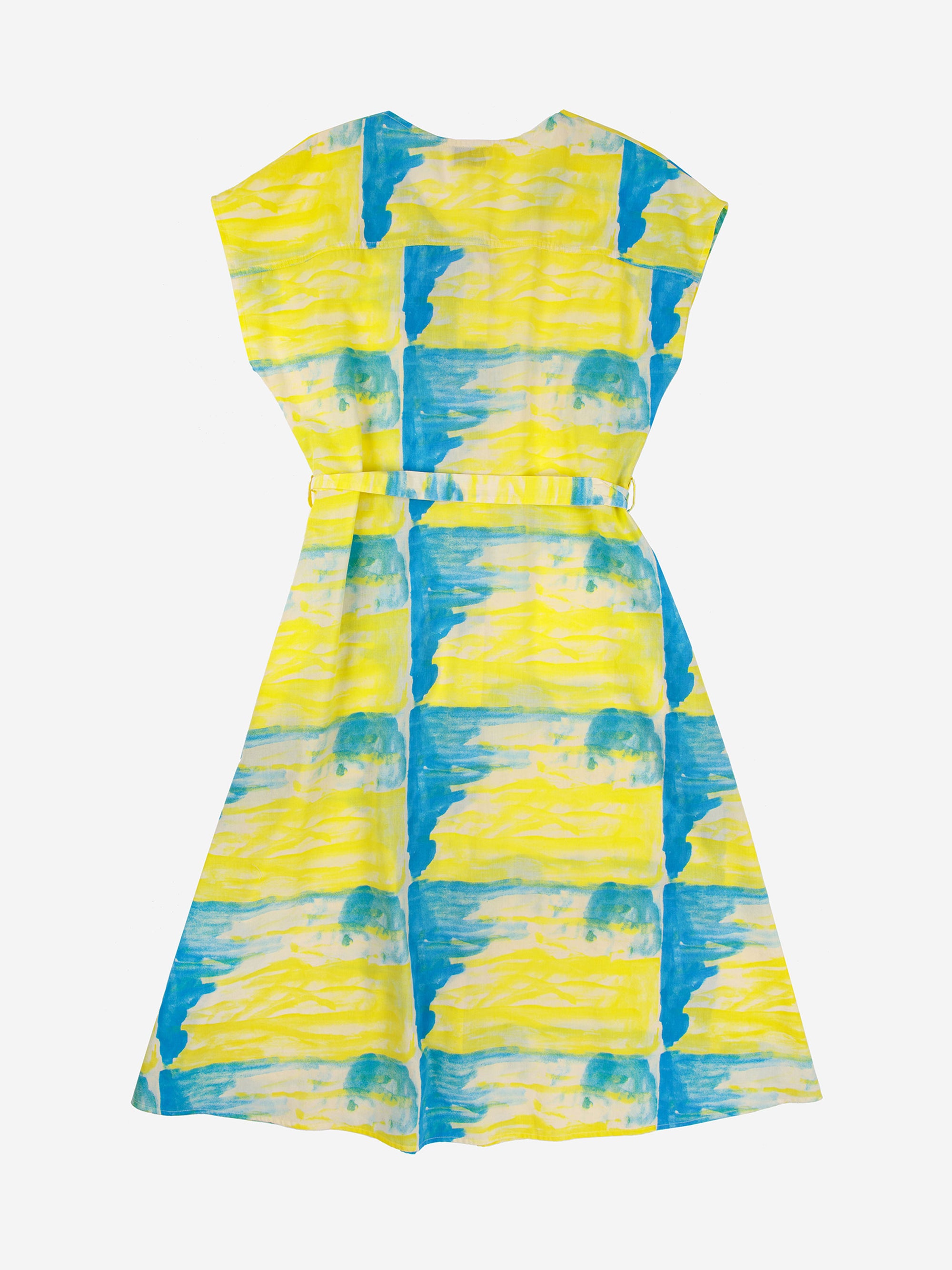 100% organic cotton multicolor short sleeve dress. Designed with v-neck, front button fastening, side pocket, beltloop and midi length. It has a evasé fit. Made in Spain