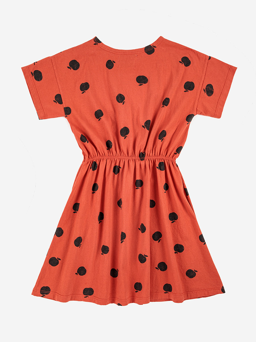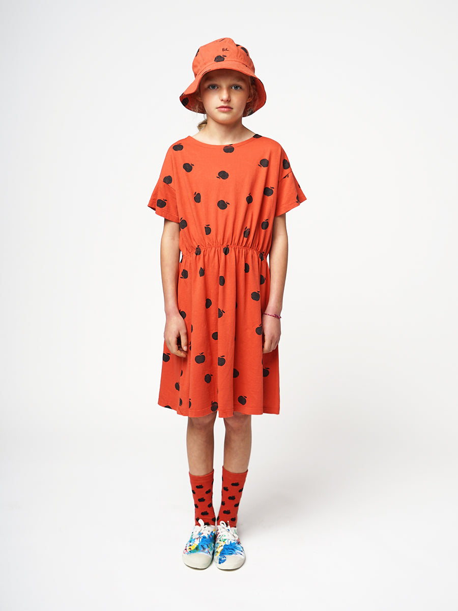 80% organic cotton 20% recycled cotton knee lenght dress. Designed with elasticated waistband and embroidery. It has an evasé fit. Made in Spain