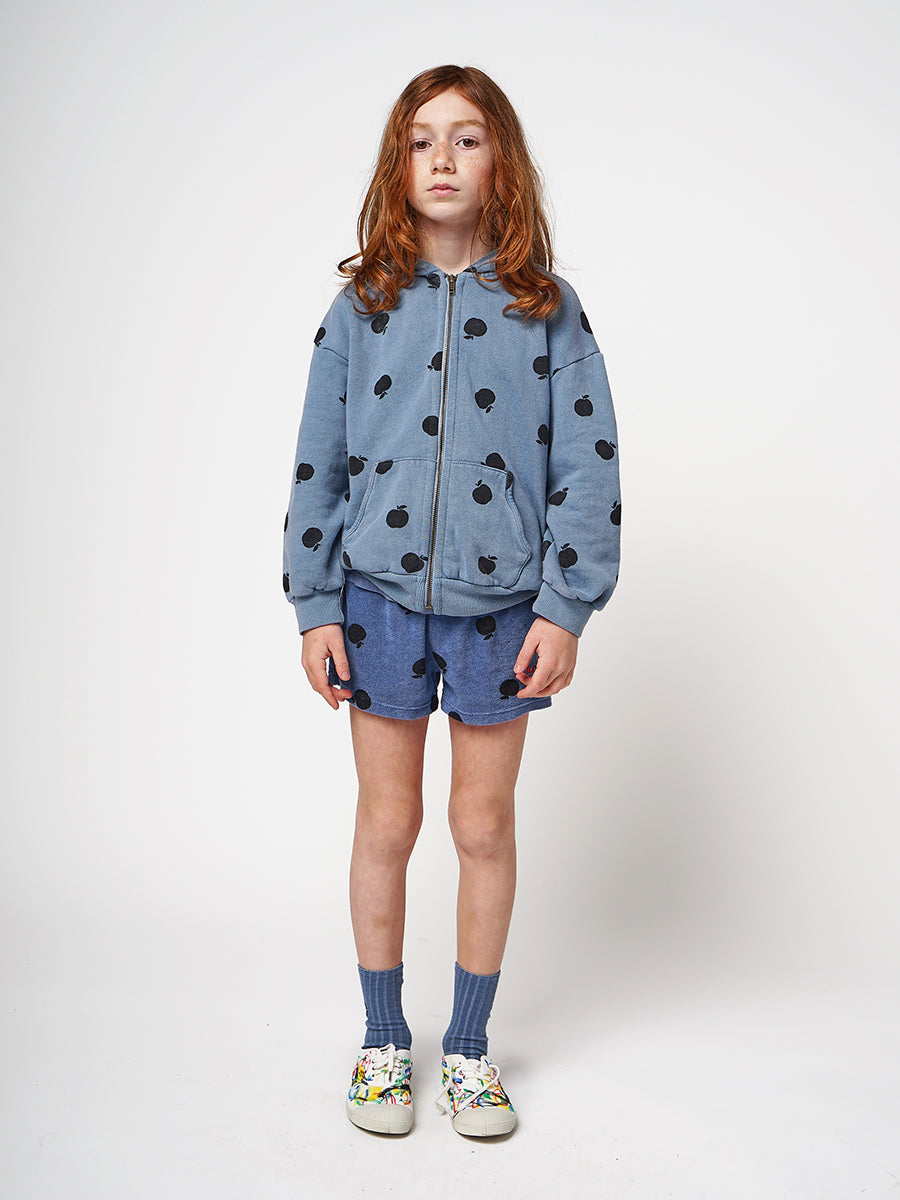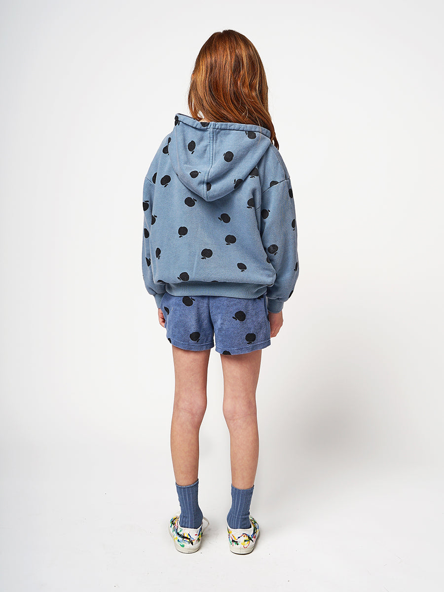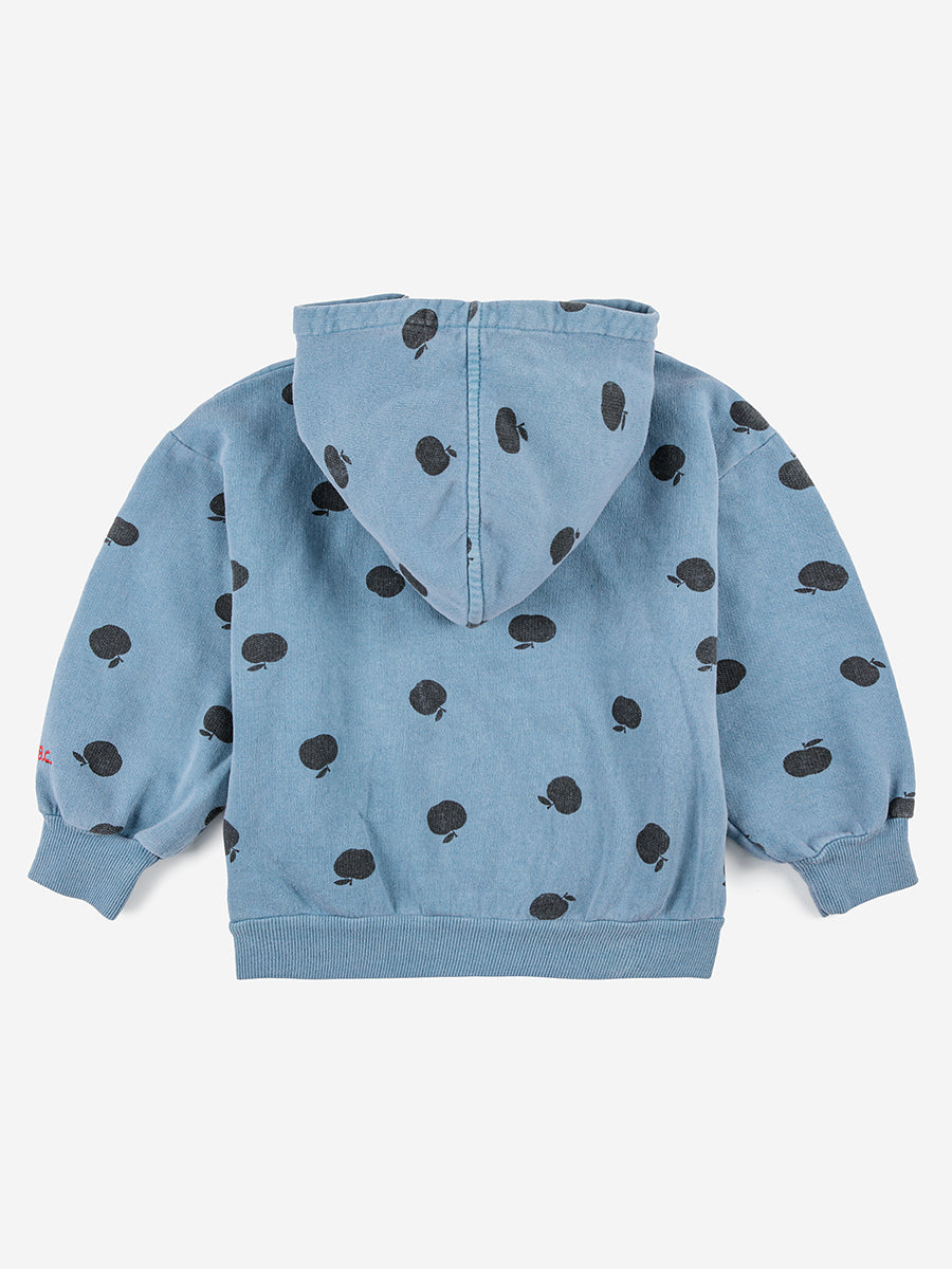 67% organic cotton 33% recycled cotton blue hooded sweatshirt. Designed with long sleeves, dropped shoulder, front zip fastening, ribbed cuffs, embroidery, ribbed bottom and kangaroo pocket. It has a loose fit. Made in Spain