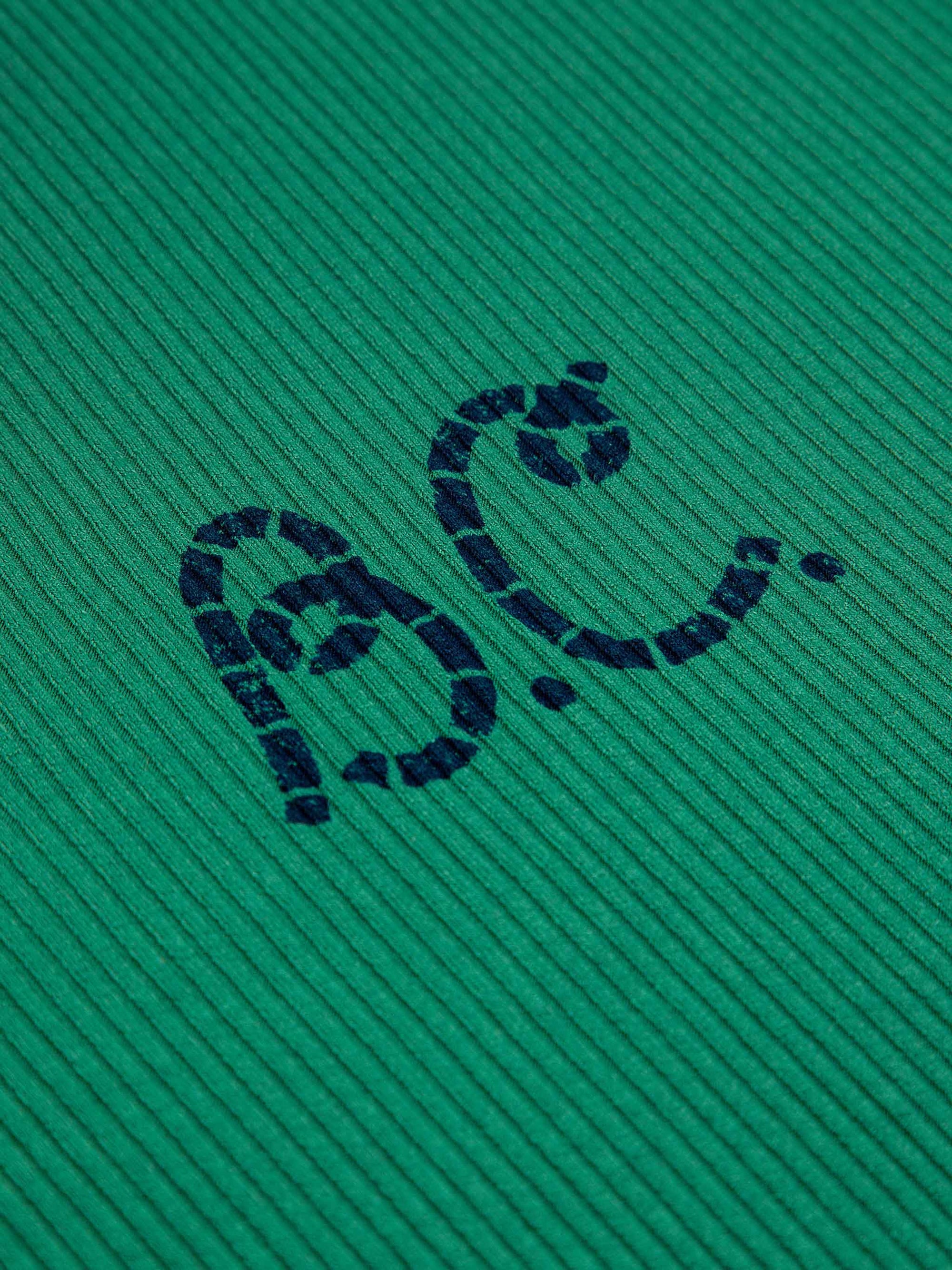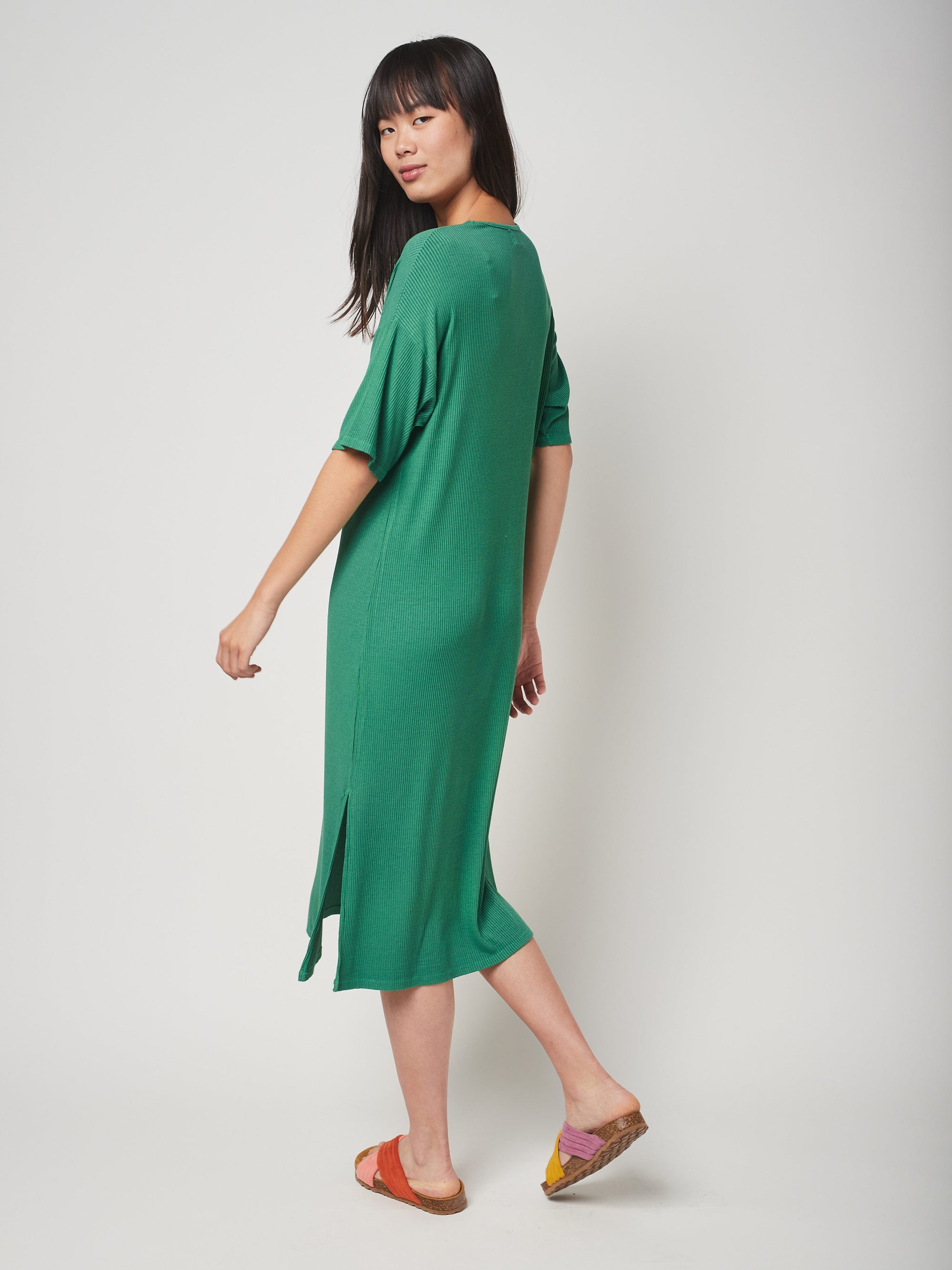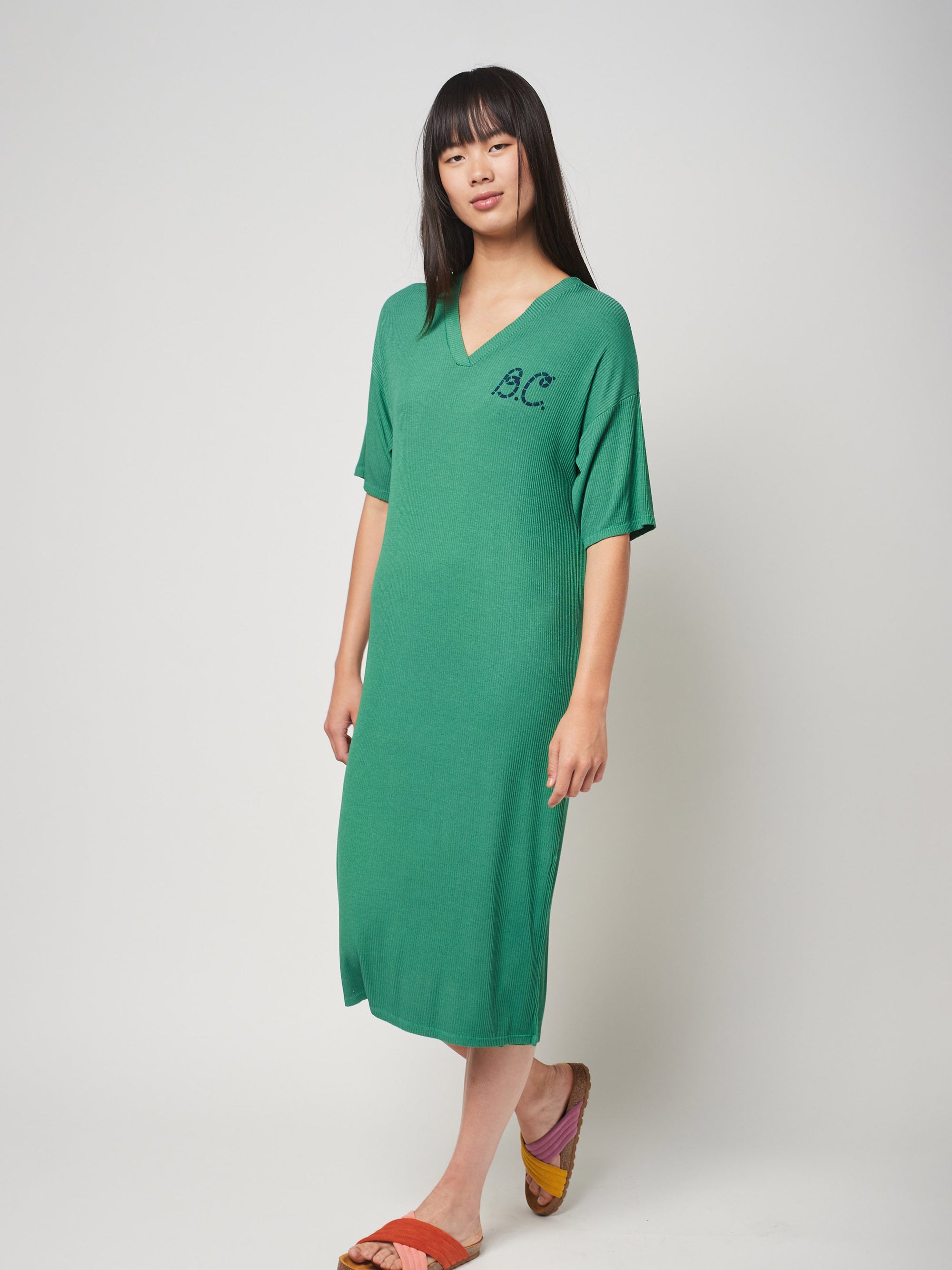 94% viscose 6% elastane green short sleeve dress. Designed with v-neck. It has a relaxed fit. Made in Spain