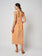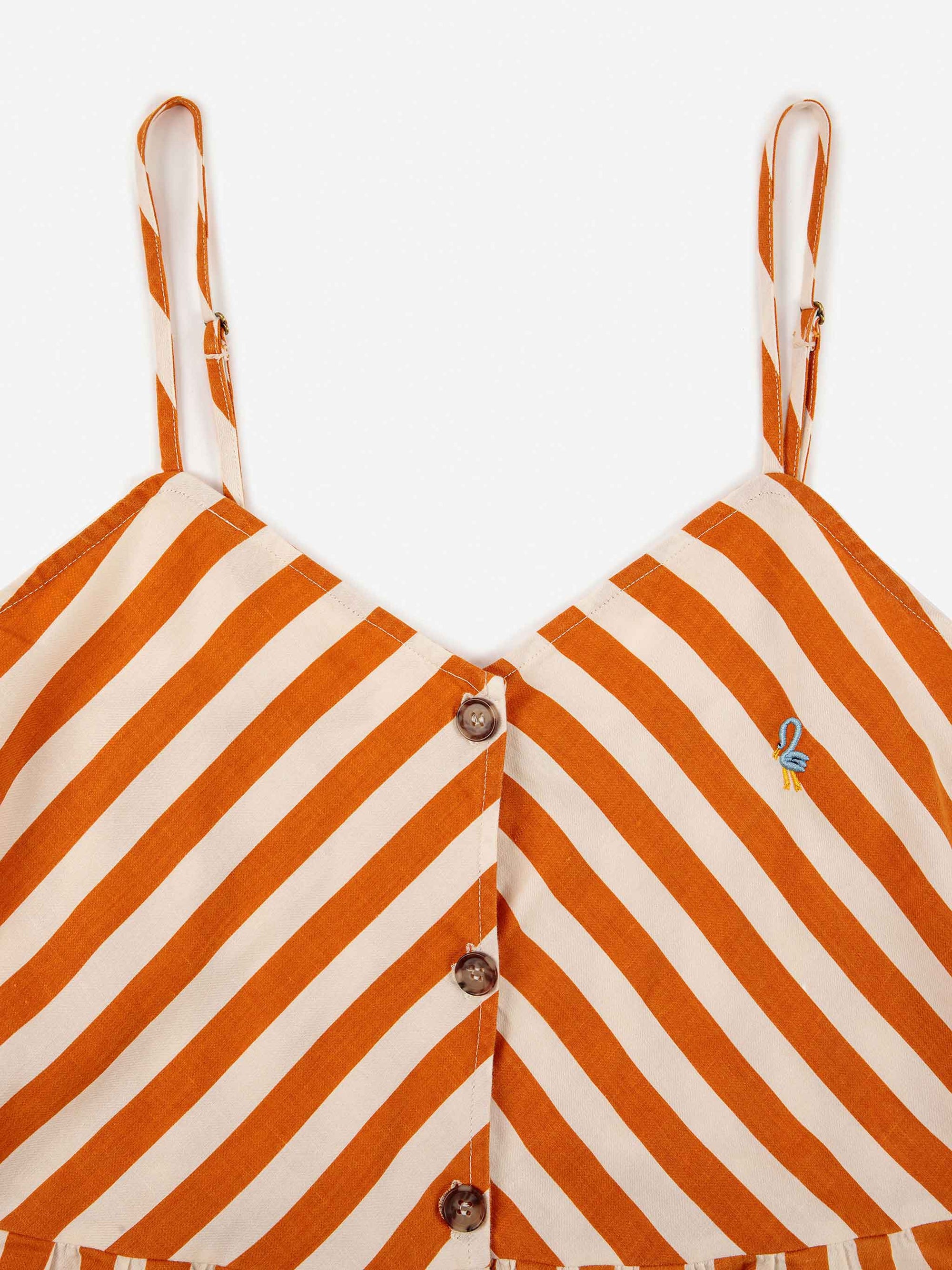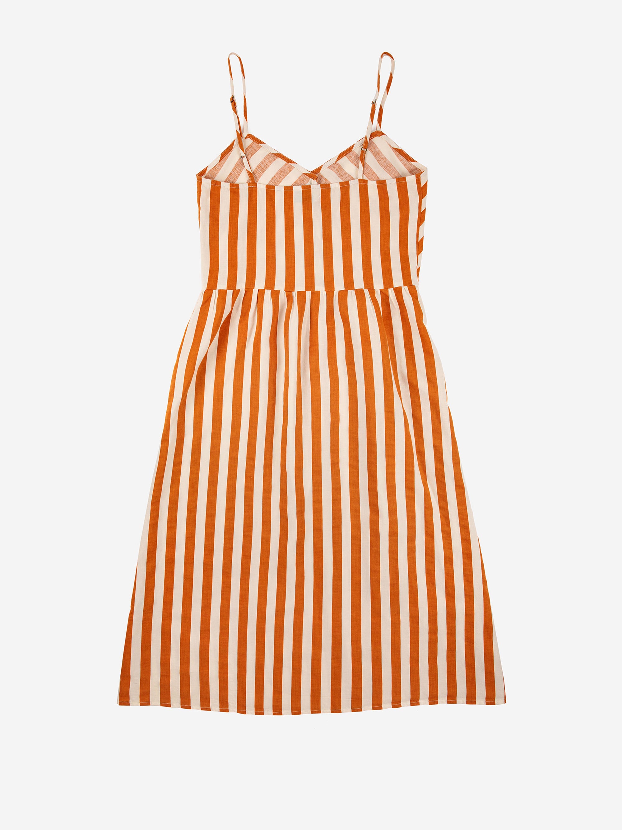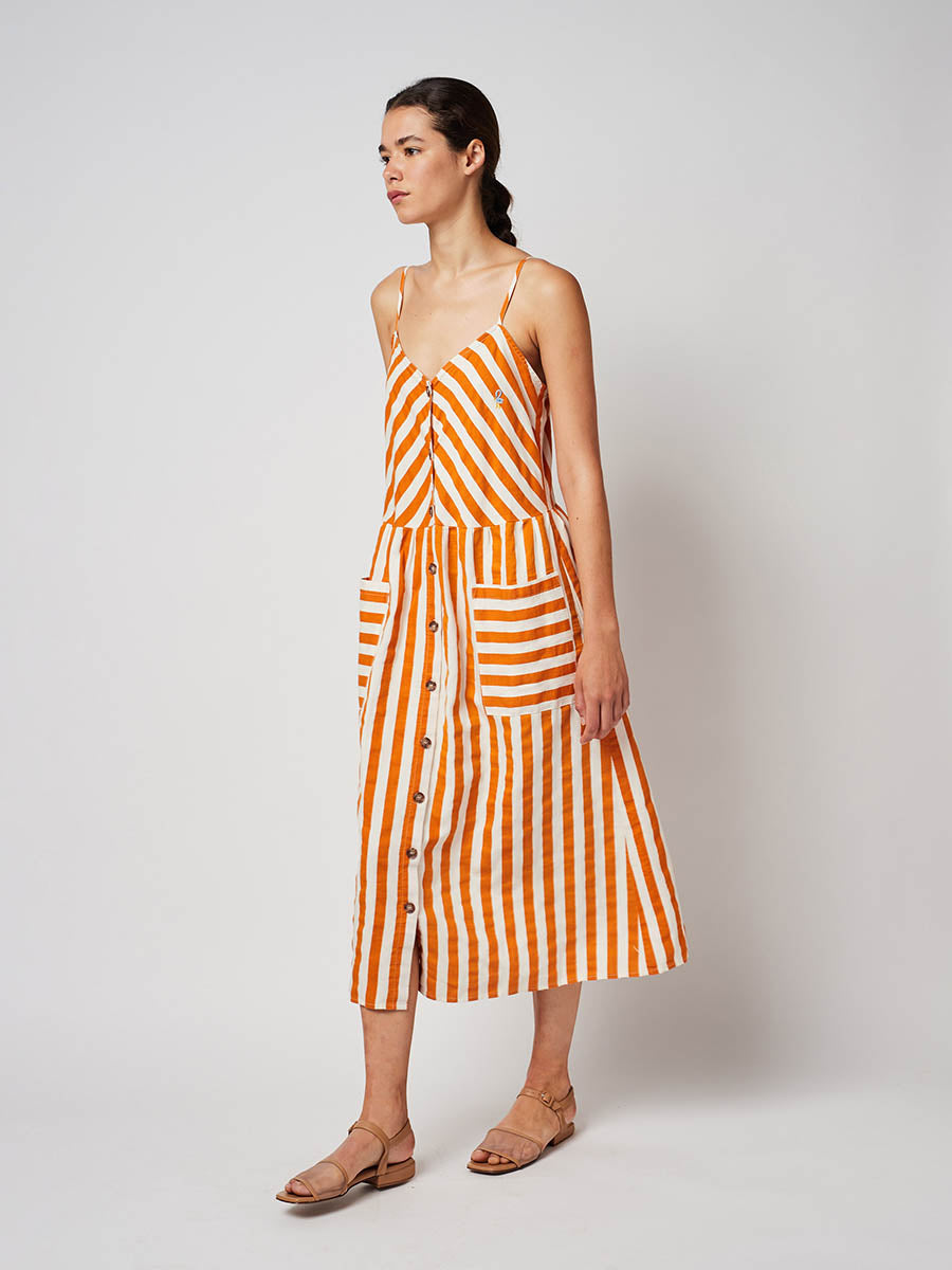 50% cotton 50% linen orange sleeveless dress. Designed with v-neck, adjustable straps, front button fastening, embroidery, midi length and patch pocket. It has a evasé fit. Made in Spain