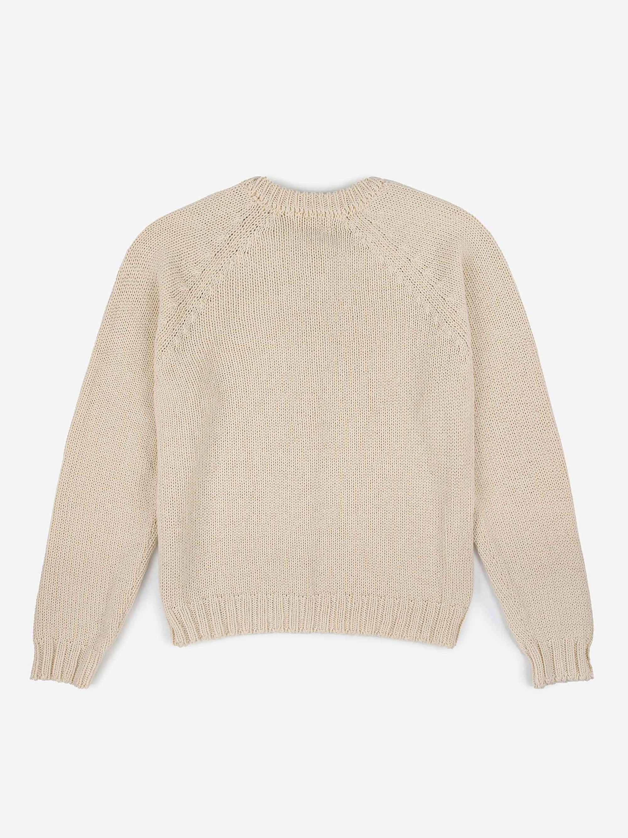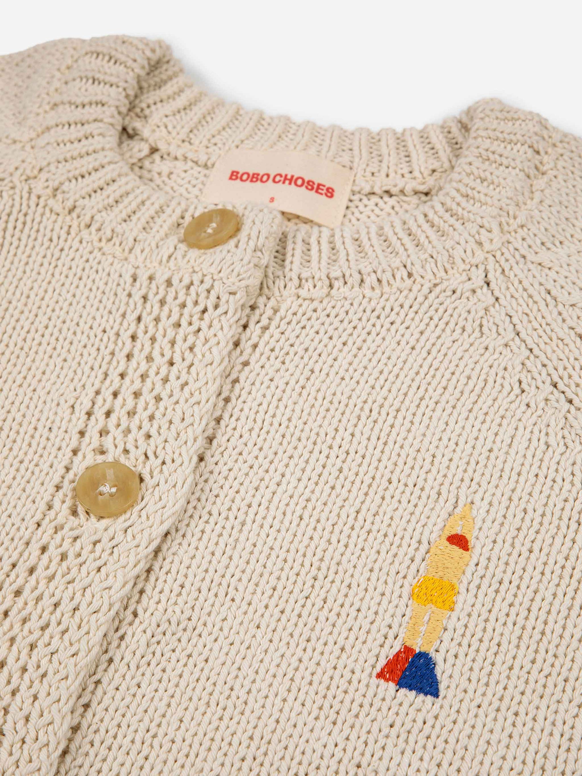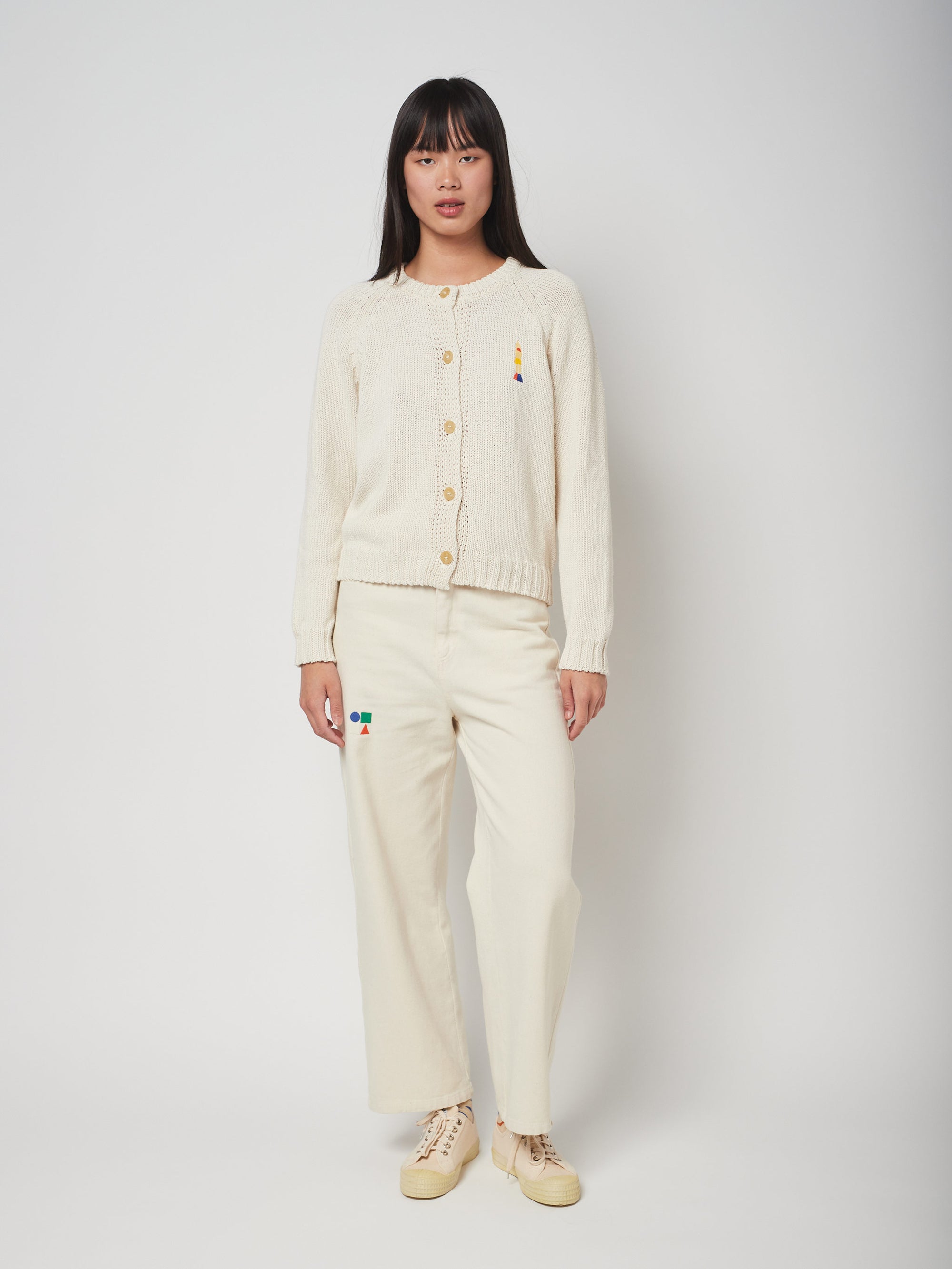 80% cotton 20% polyester offwhite long sleeve cardigan. Designed with front button fastening, ribbed cuffs, embroidery, ribbed bottom and round neck. It has a cropped fit. Made in Spain