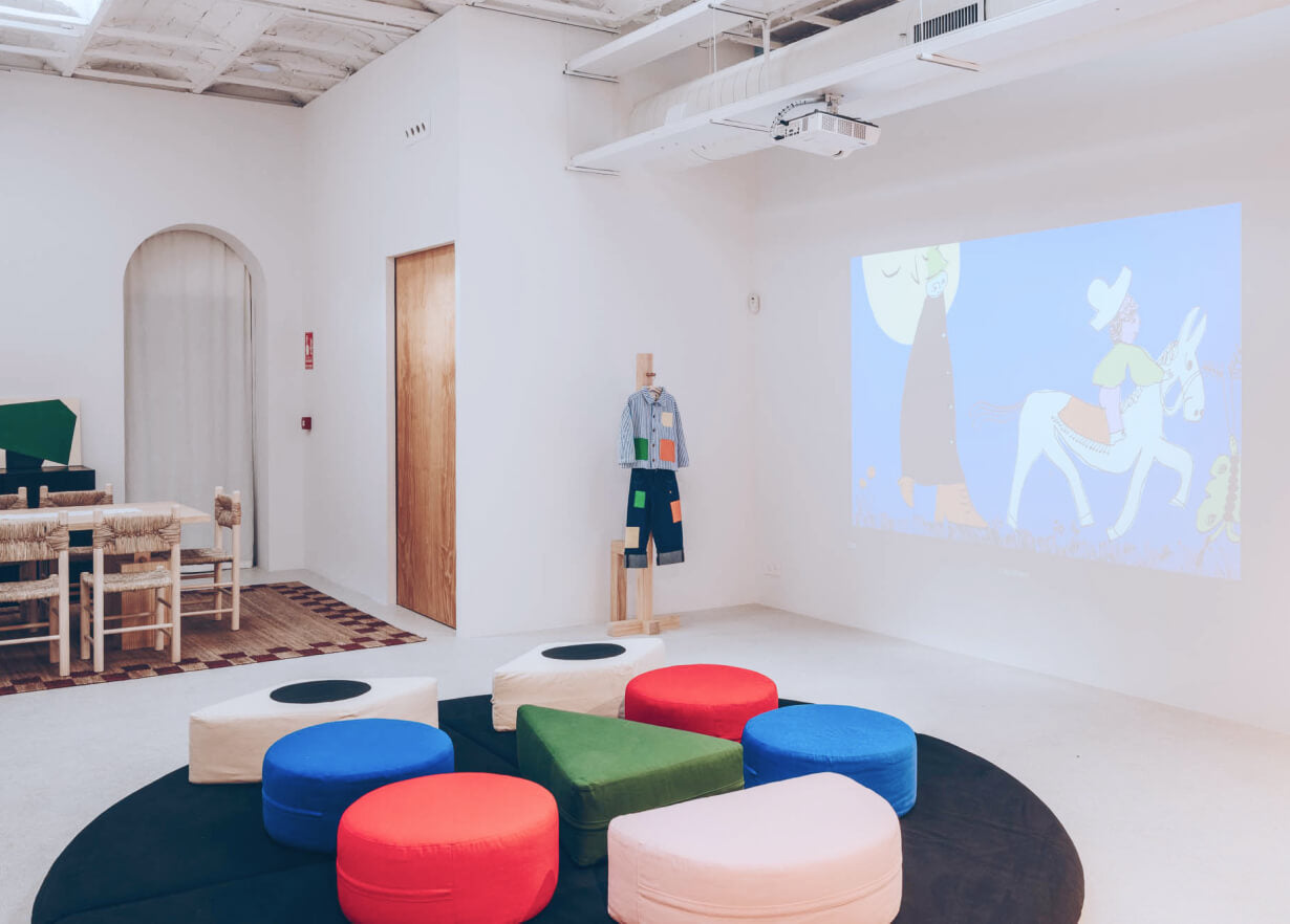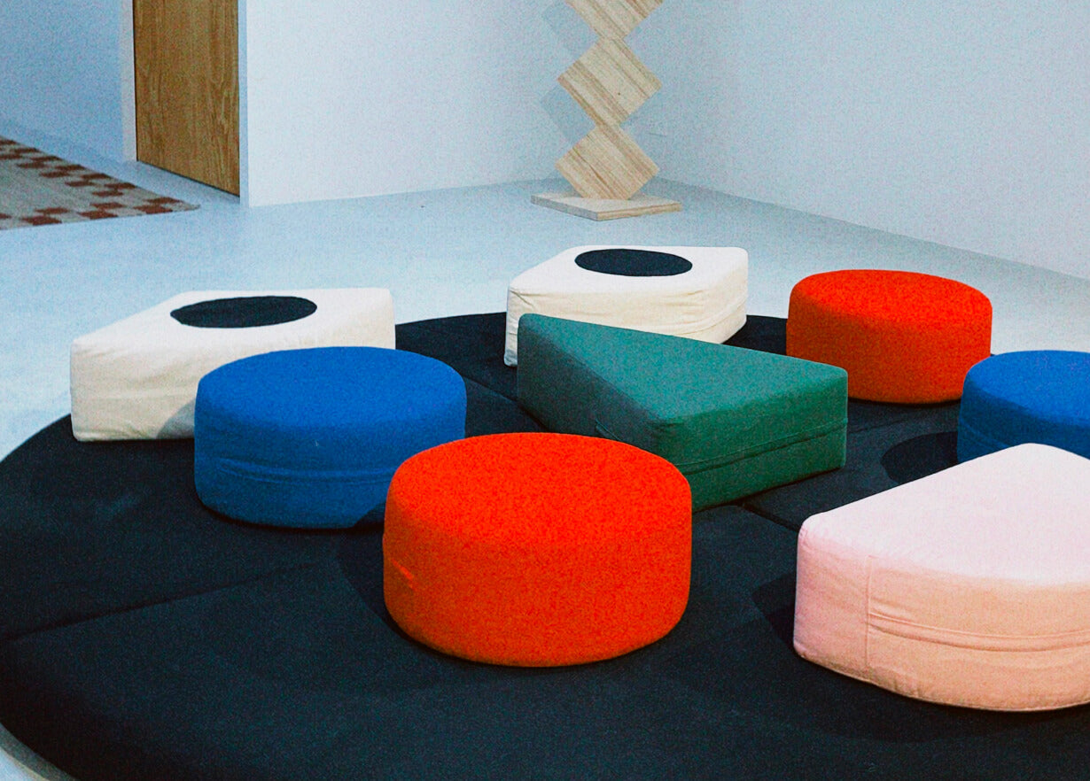 Bunte Kissen erwecken die Figur von Bobo Choses zum Leben. Es ist ein Ort zum Spielen, Auseinandernehmen und Erschaffen von Meisterwerken.