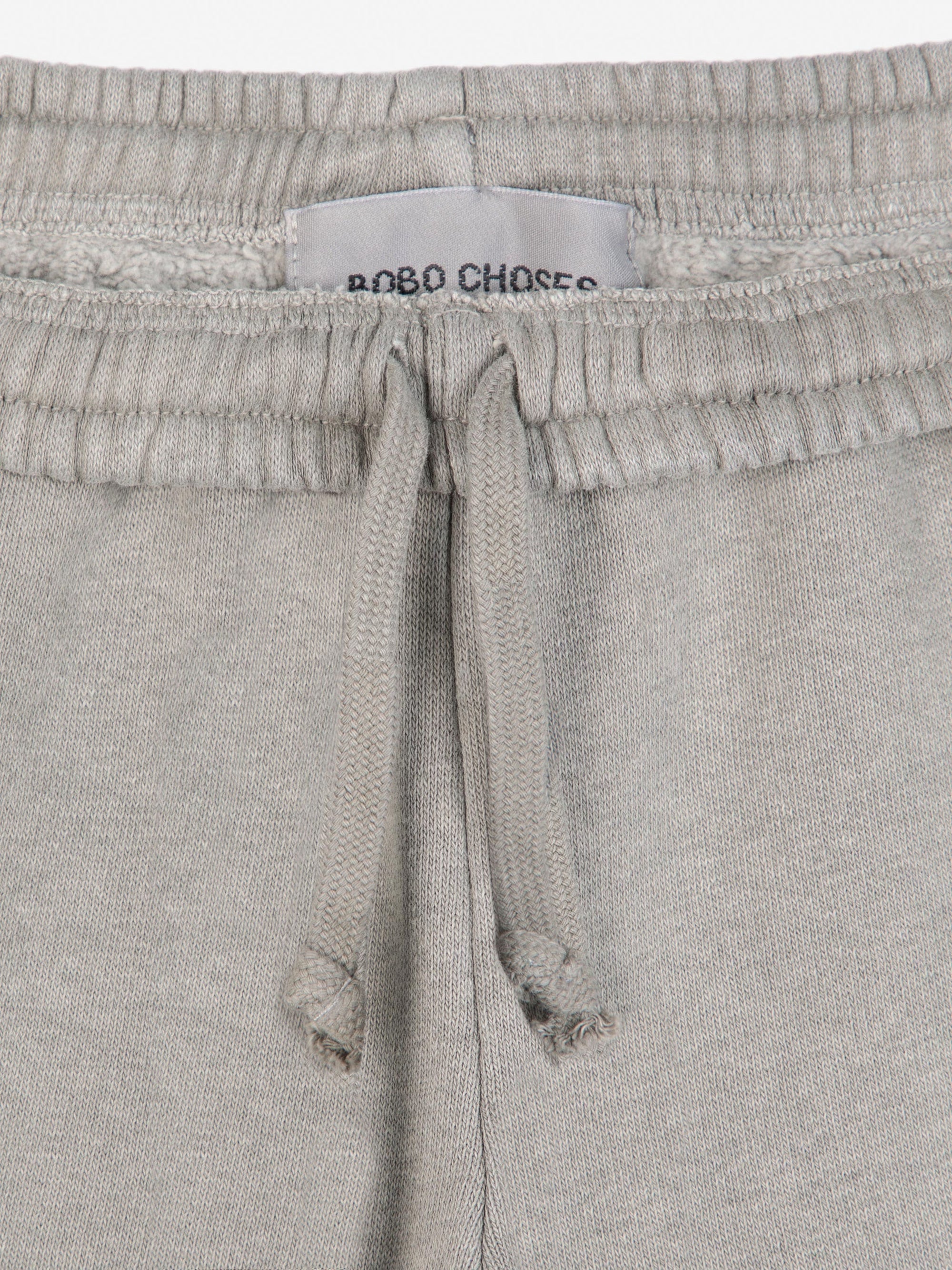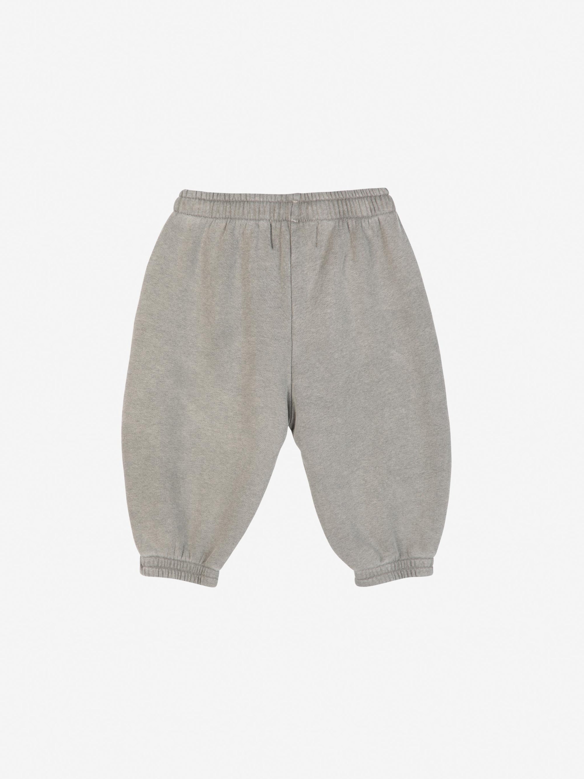 Die Baby-Jogginghose „Poma“ in Grau mit ikonischen Illustrationen in Cremeweiß auf den Knien wird aus GOTS-zertifizierter Bio-Baumwolle gefertigt. Der Gummibund und die Rippbündchen sorgen dafür, dass die Jogginghose nicht rutscht, während Babys ihre Umgebung erkunde. Die knöchellange, weite Passform hält warm und schützt.