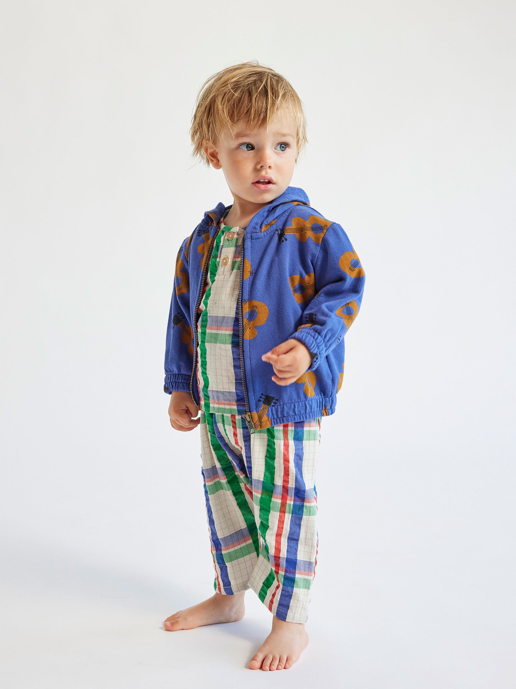 100% organic cotton navy blue sweatshirt. Designed with hooded, long sleeves, dropped shoulder, front zip fastening, ribbed cuffs, loose fit, ribbed bottom and fleece. Made in Spain.