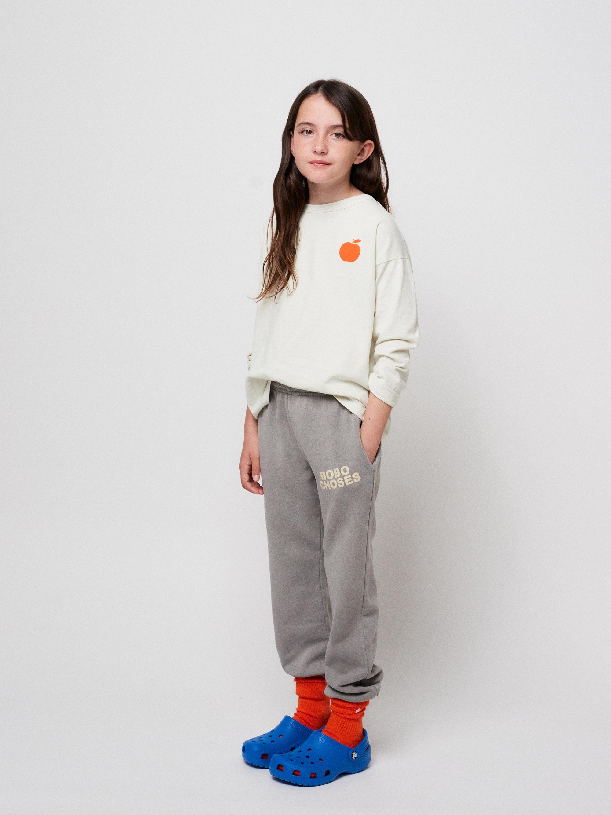 The long grey jogging pants for kids are a timeless and easy-to-wear piece. Crafted from GOTS-certified organic cotton, they feature an inner brushed fleece for added warmth. The loose fit, along with an elasticated waistband and bottom, offer all-day comfort. Practical patch and seam pockets complete the design.