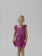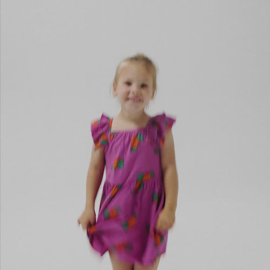 Purple dress. Designed with straps, evasé fit, over knee length, square neck and single handles. Made in Spain.