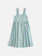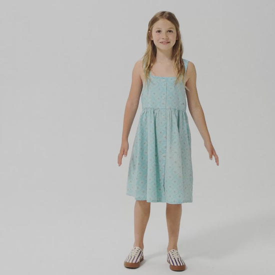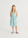 Light blue dress. Designed with front button fastening, gathering detail, embroidery, evasé fit, over knee length, square neck and wide shoulder straps. Made in Spain.