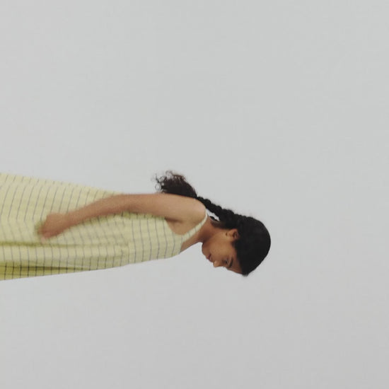 Yellow dress. Designed with front button fastening, gathering detail, embroidery, evasé fit, over knee length, square neck and wide shoulder straps. Made in Spain.