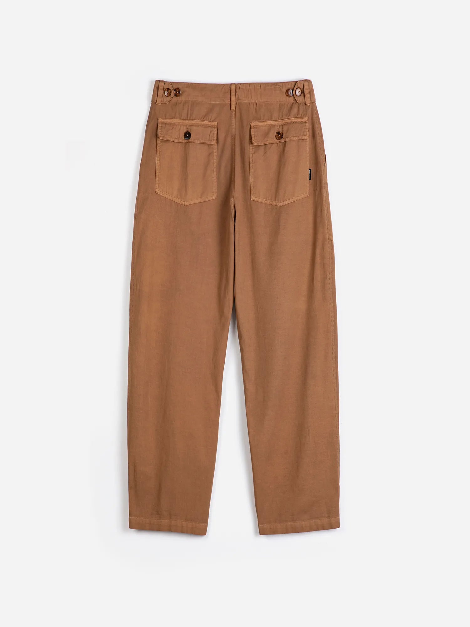 Brown pants. Designed for a relaxed fit, mid-rise, cut for a straight-leg fit, designed for a comfortable fit, non stretchy fabric, fluid and designed with pockets. Fits true to size, take your normal size. Made in Spain.