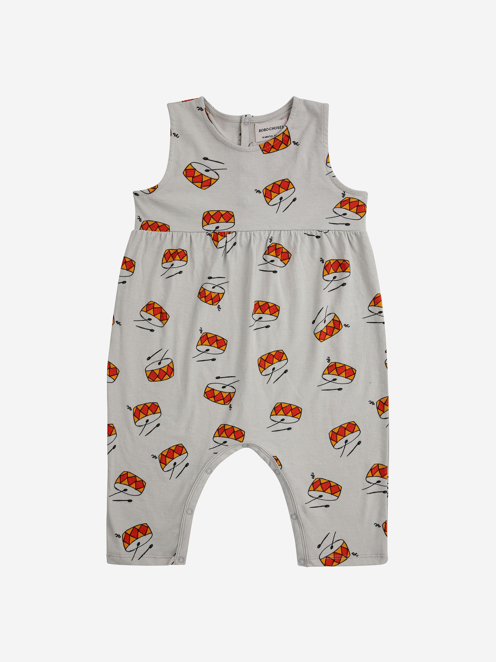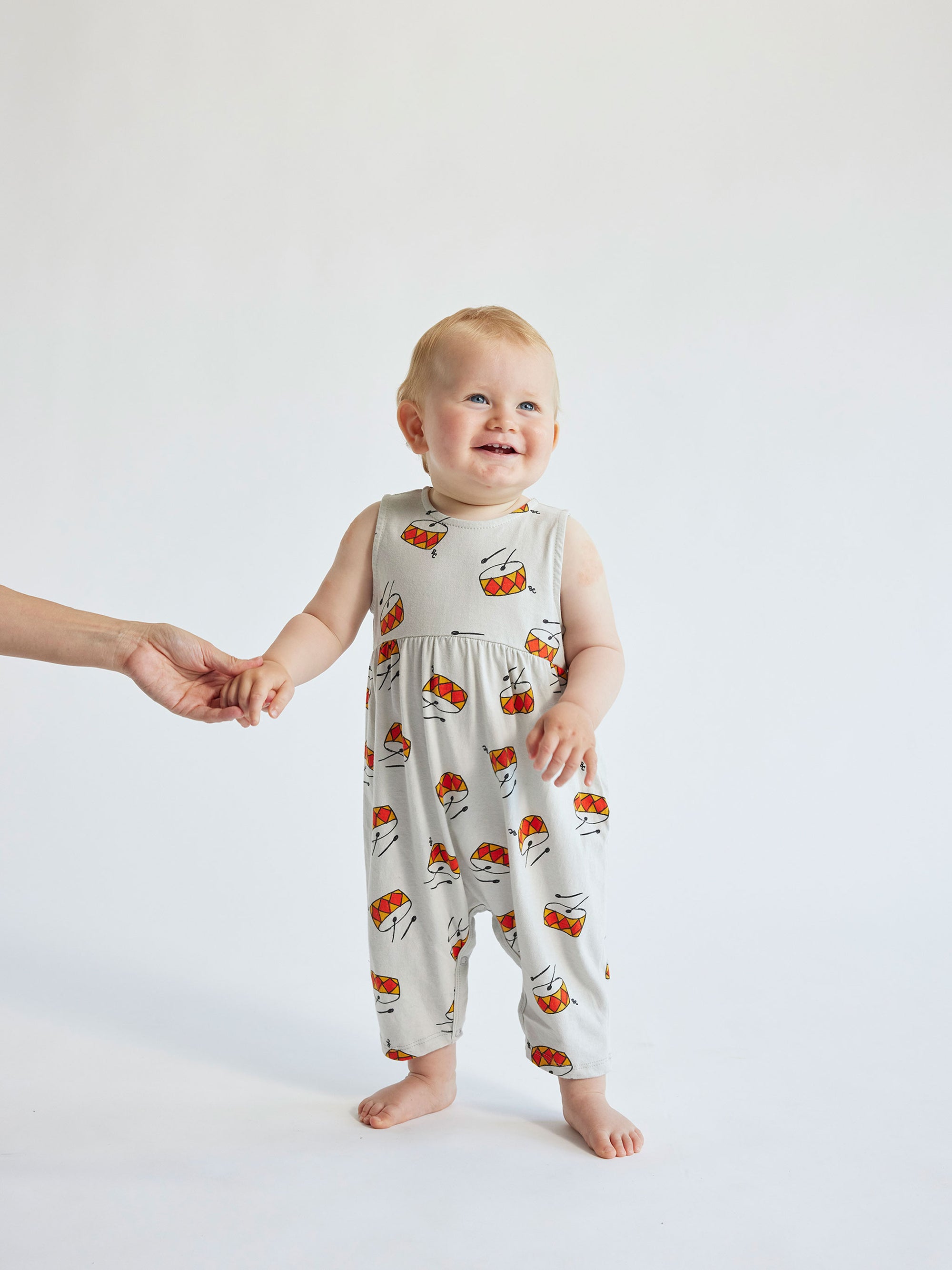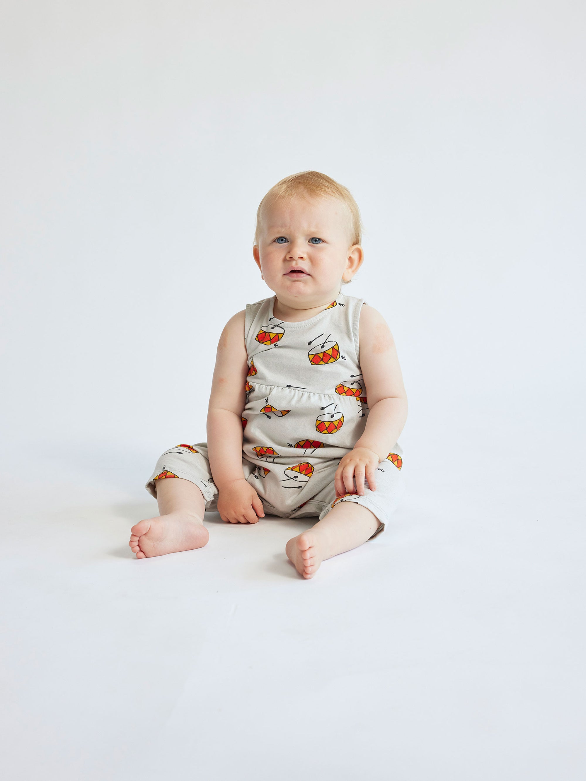 100% organic cotton beige overall. Designed with sleeveless, back snap fastening, crotch snap fastening, gathering detail, loose fit and wide round neck. Made in Spain.