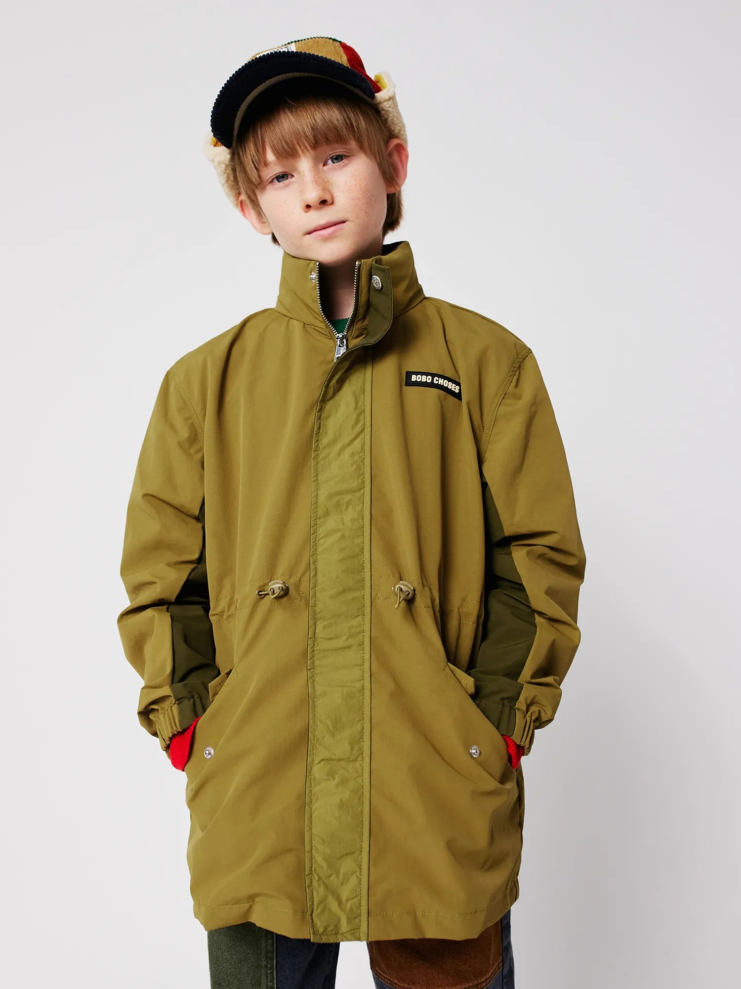 Khaki raincoat. Designed with hooded, long sleeves, adjustable waistband, front snap fastening, zipped, elasticated cuffs, over knee length, flap pocket and relaxed fit. Made in China.