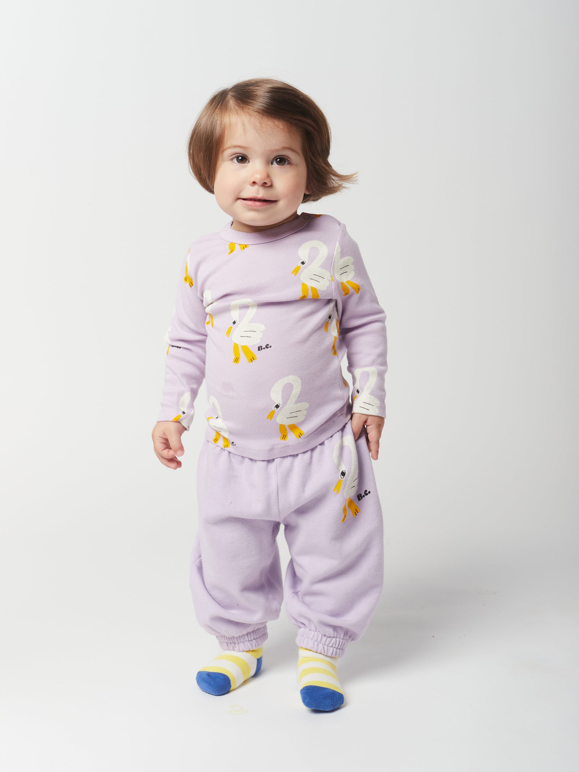 100% organic cotton lavender jogging pants. Designed with elasticated cuffs and elasticated waistband. It has a baggy fit. Made in Spain