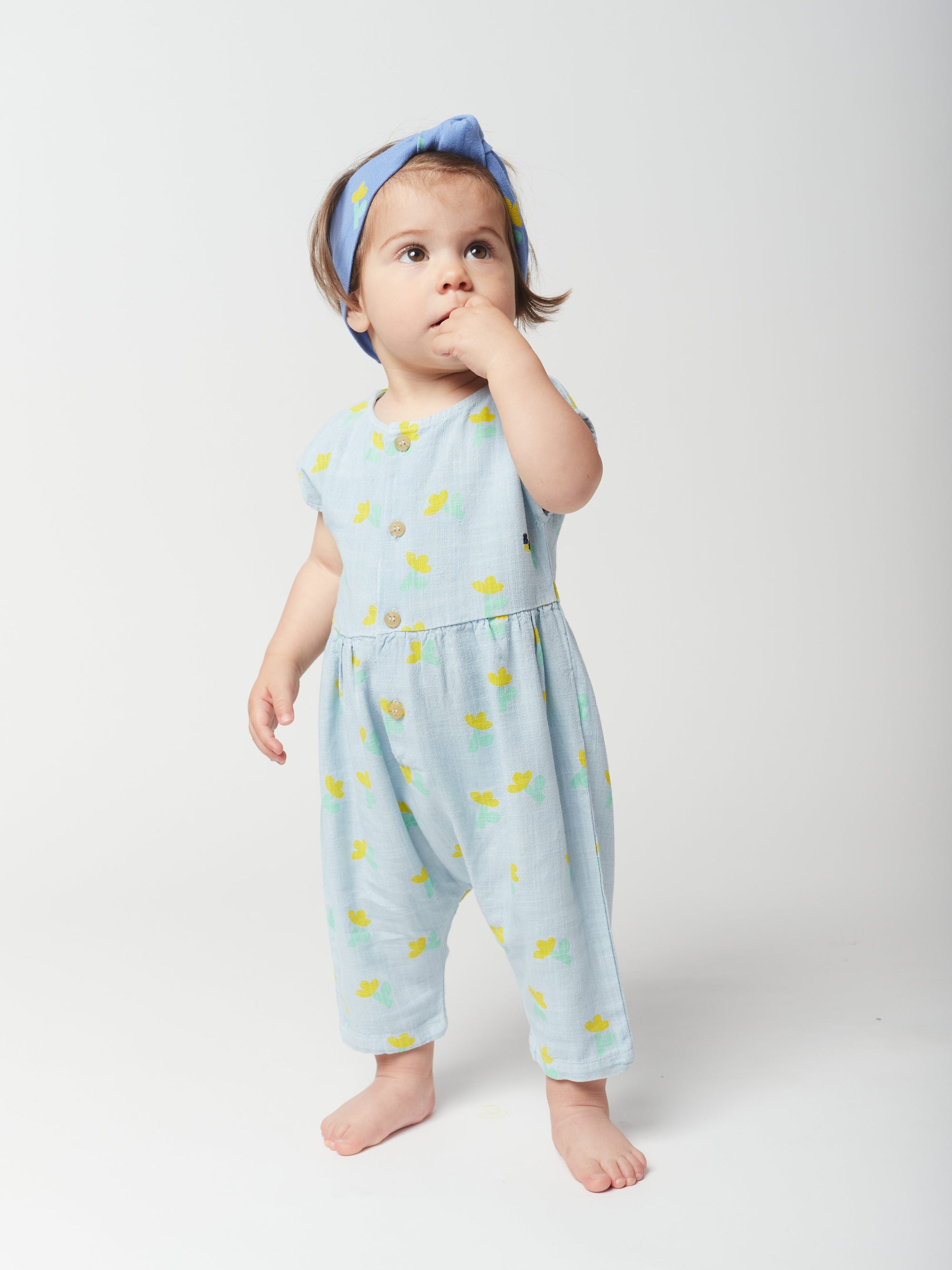 80% viscose 20% linen light blue short sleeve overall. Designed with short sleeves, front button fastening, crotch snap fastening and embroidery. It has a baggy fit. Made in Spain