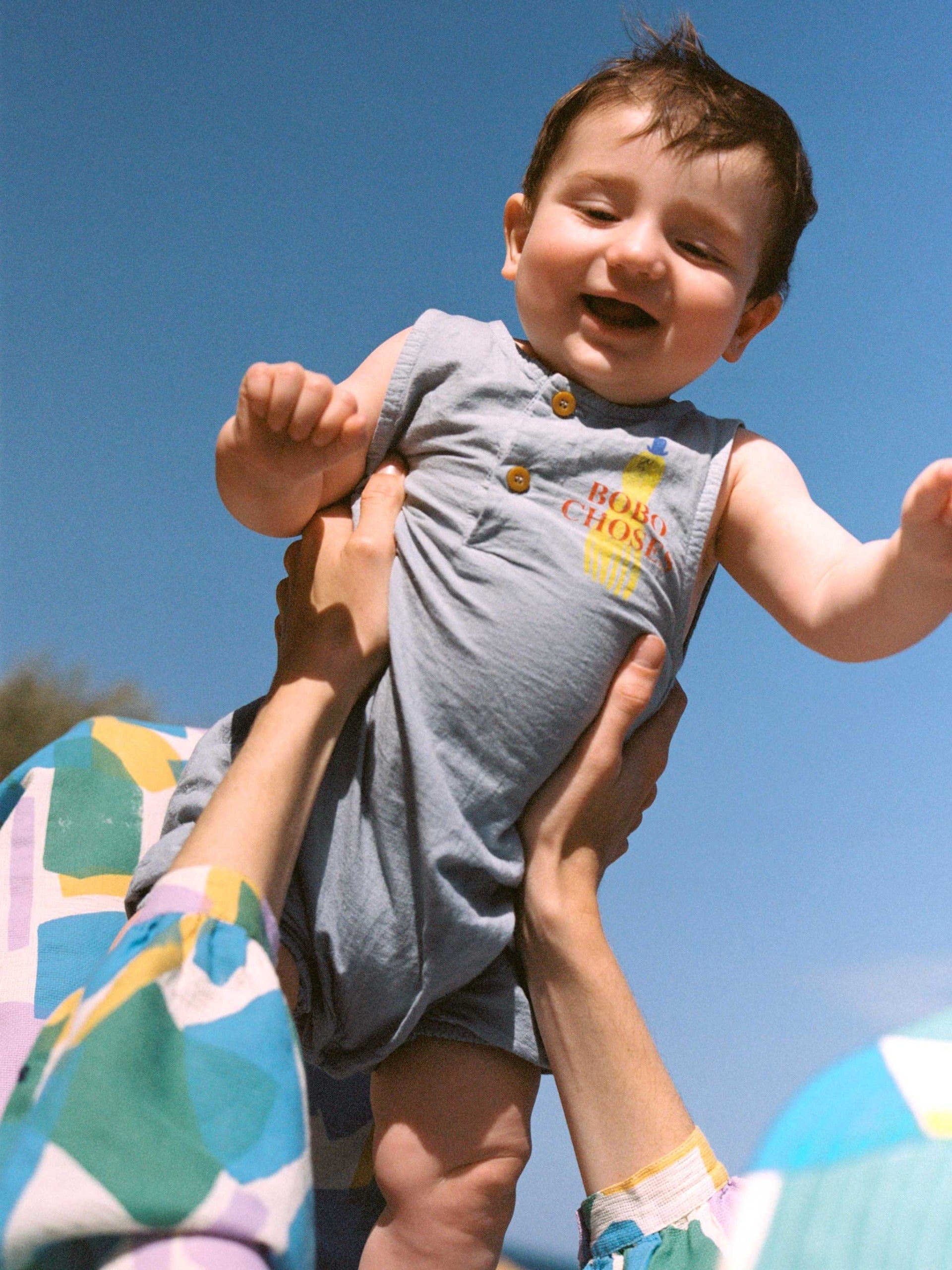 100% organic cotton light blue sleeveless playsuit. Designed with sleeveless, front button fastening and crotch snap fastening. It has a baggy fit. Made in Spain