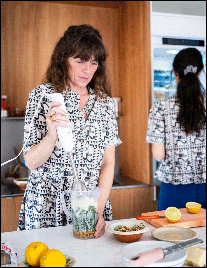 2. Put them in a blender and add the walnuts, cheese, lemon juice, olive oil, chili, and salt. Add a little of the cooking water if the pesto is too thick. Taste and adjust salt, acidity, and texture.