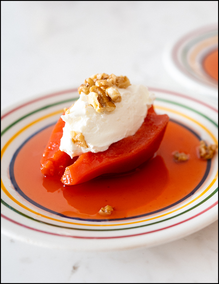 Place one quince half per person with a few tablespoons of syrup. Add a spoonful of labneh in the cavity and sprinkle with toasted walnuts.