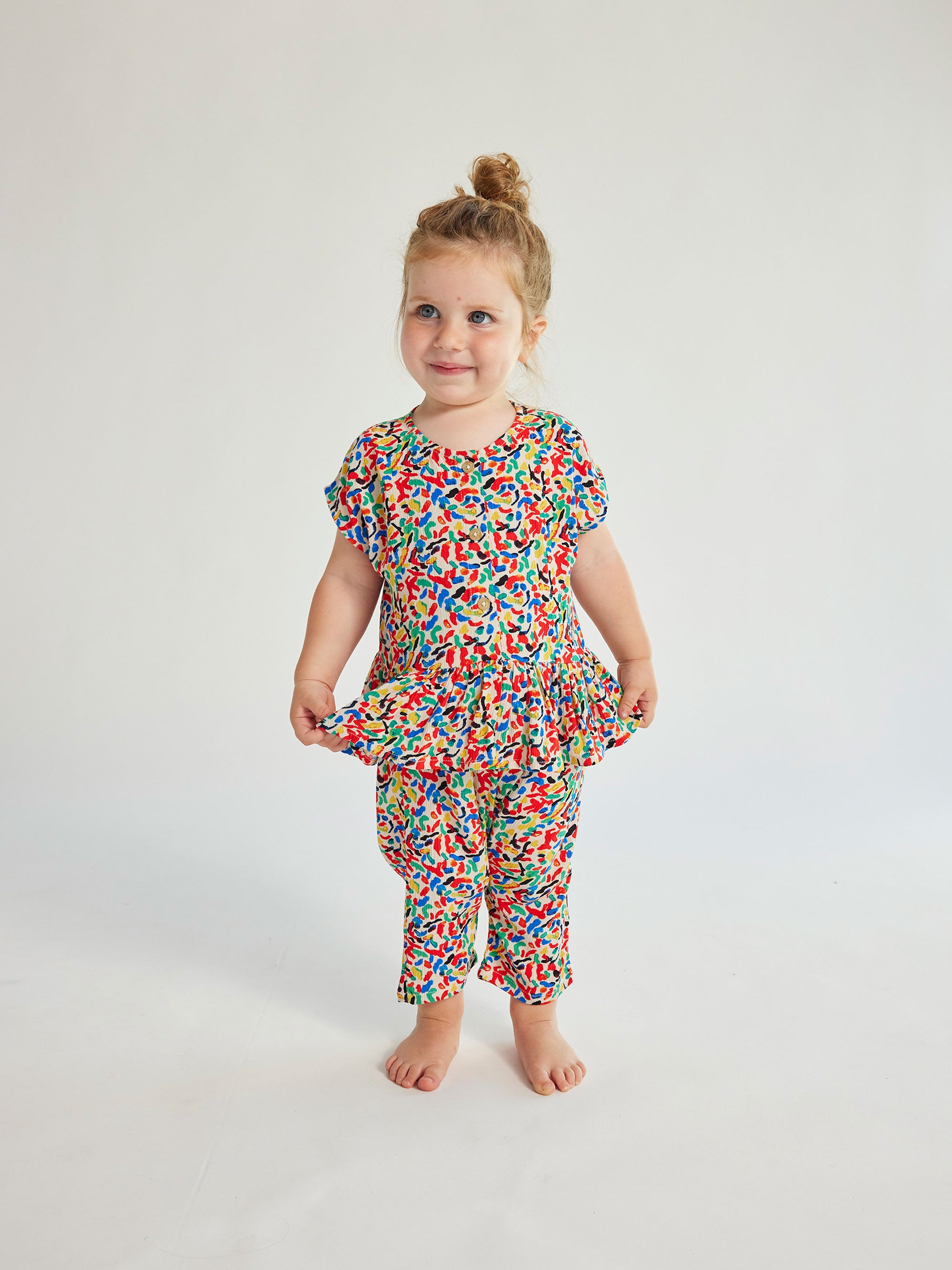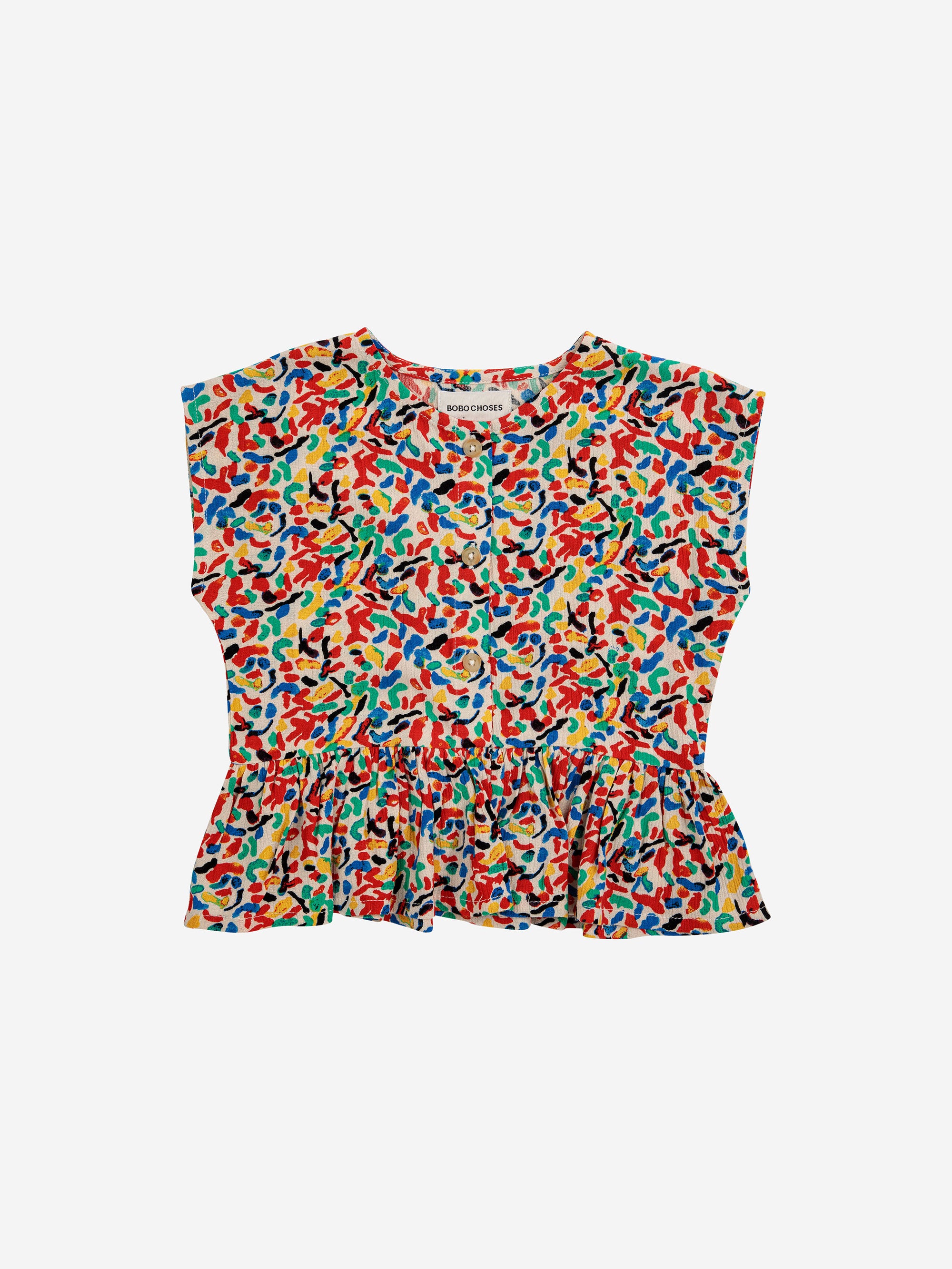 100% viscose multicolor shirt. Designed with sleeveless, back button fastening, round neck, ruffle hem and relaxed fit. Made in India.