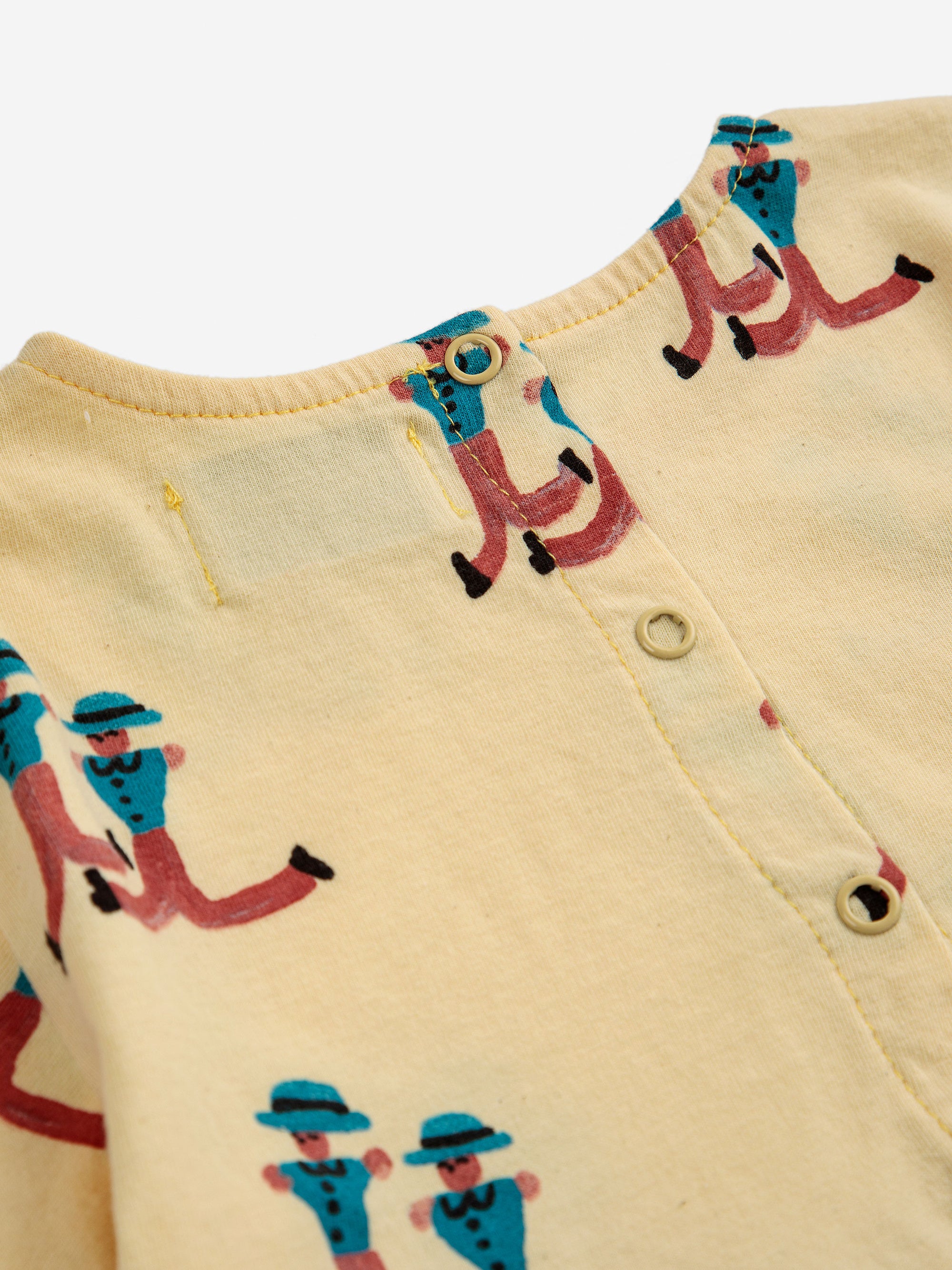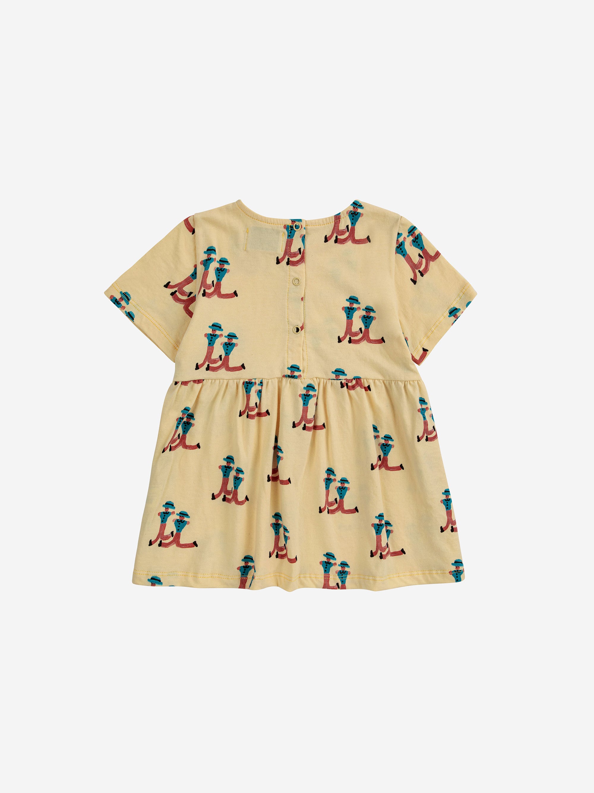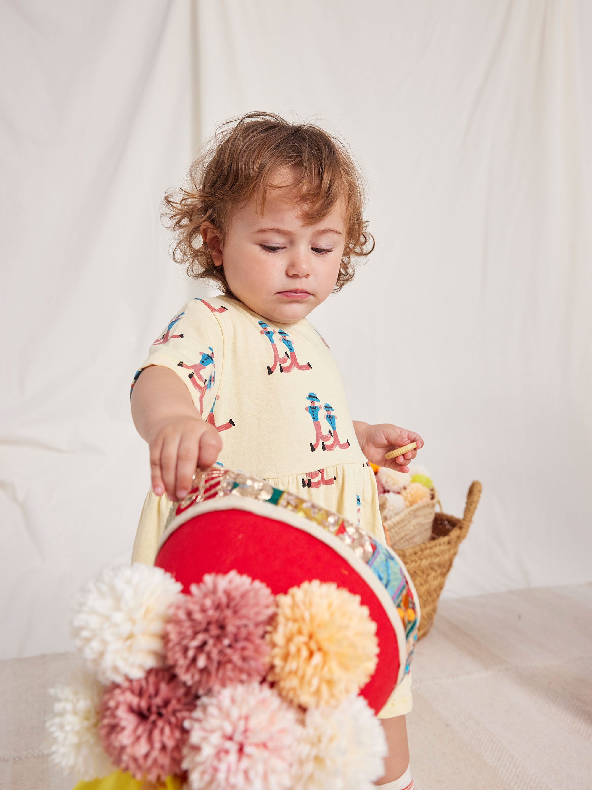 100% organic cotton light yellow dress. Designed with short sleeves, dropped shoulder, back snap fastening, evasé fit, short and round neck. Made in Spain.