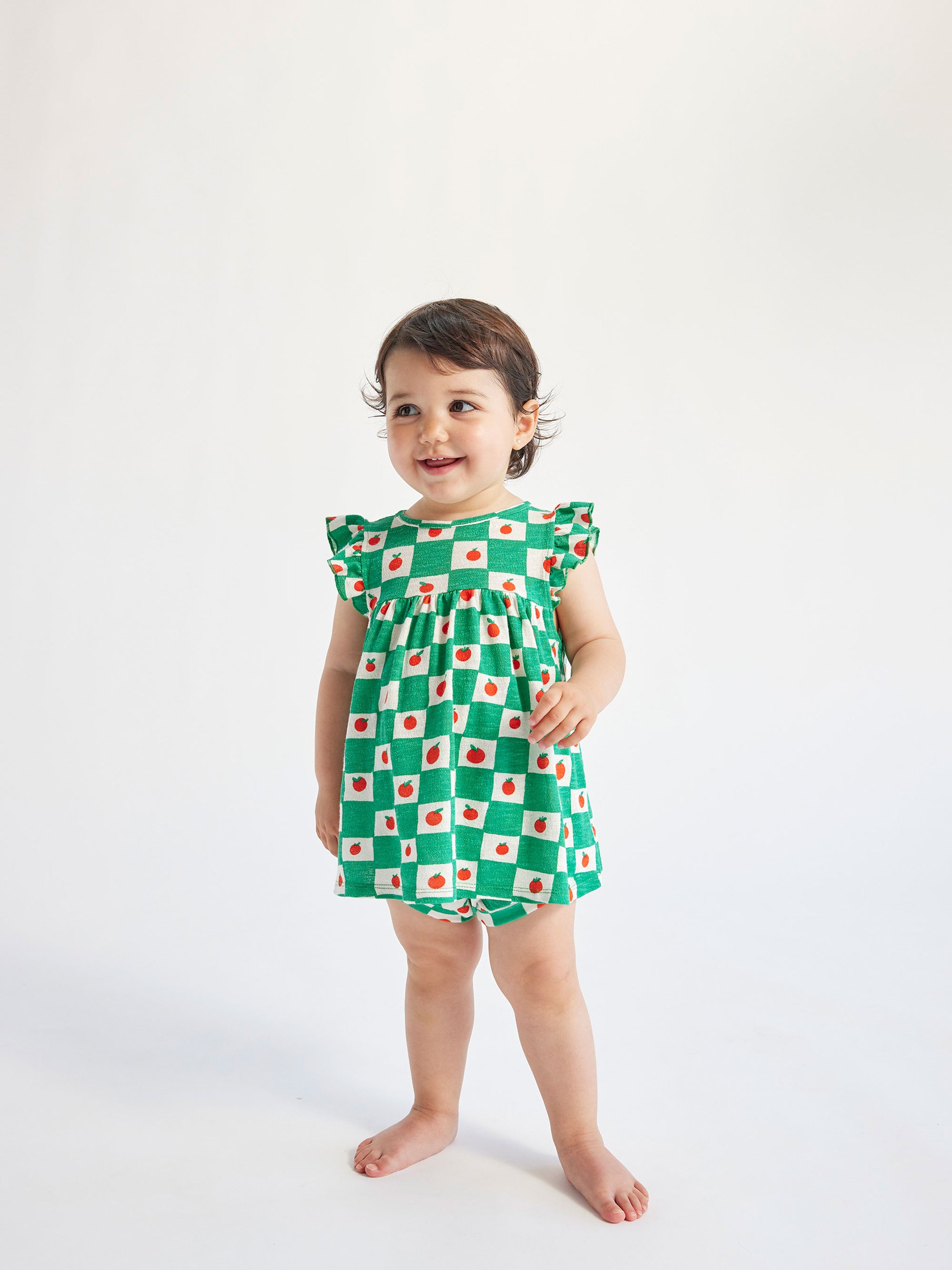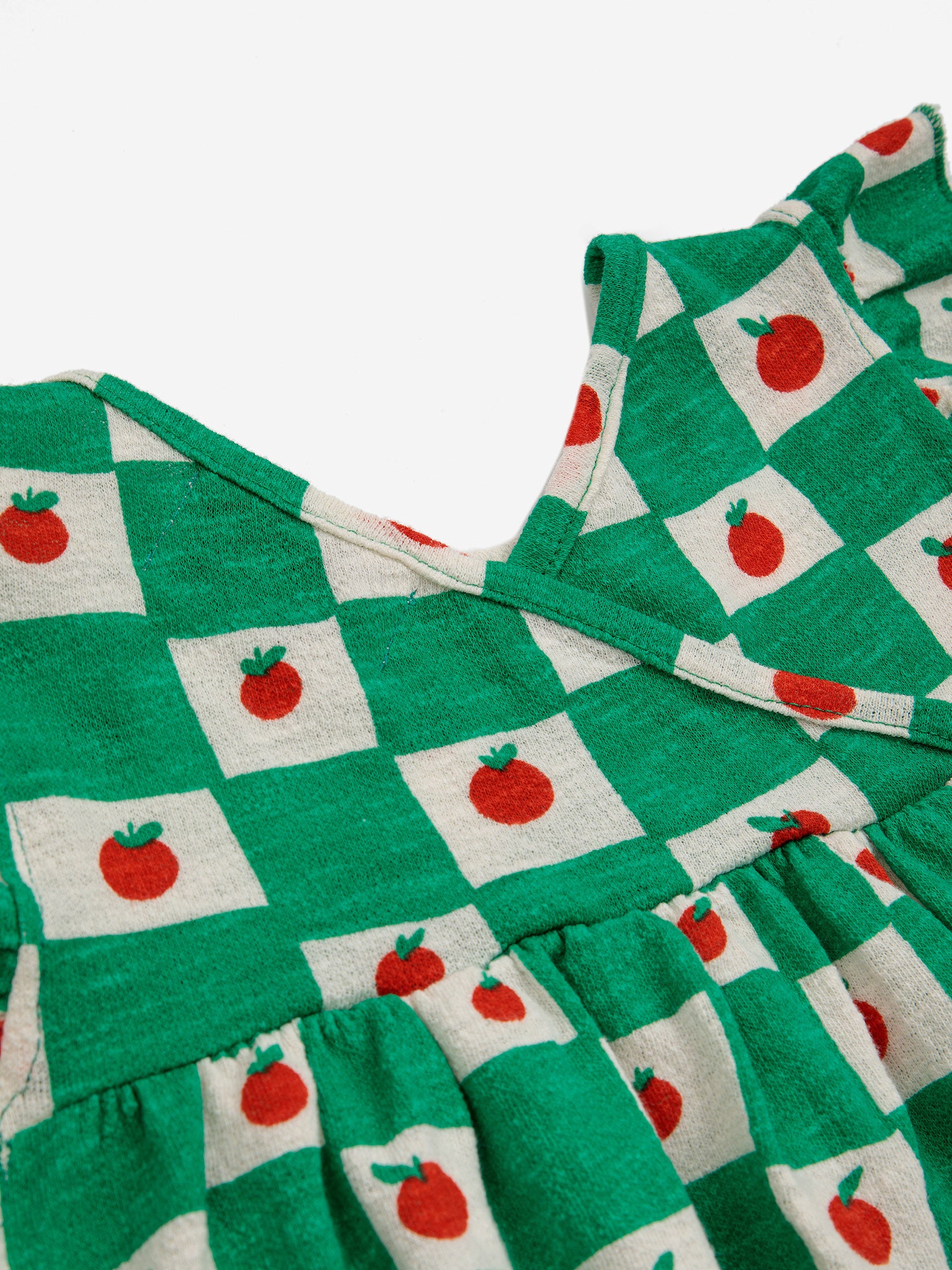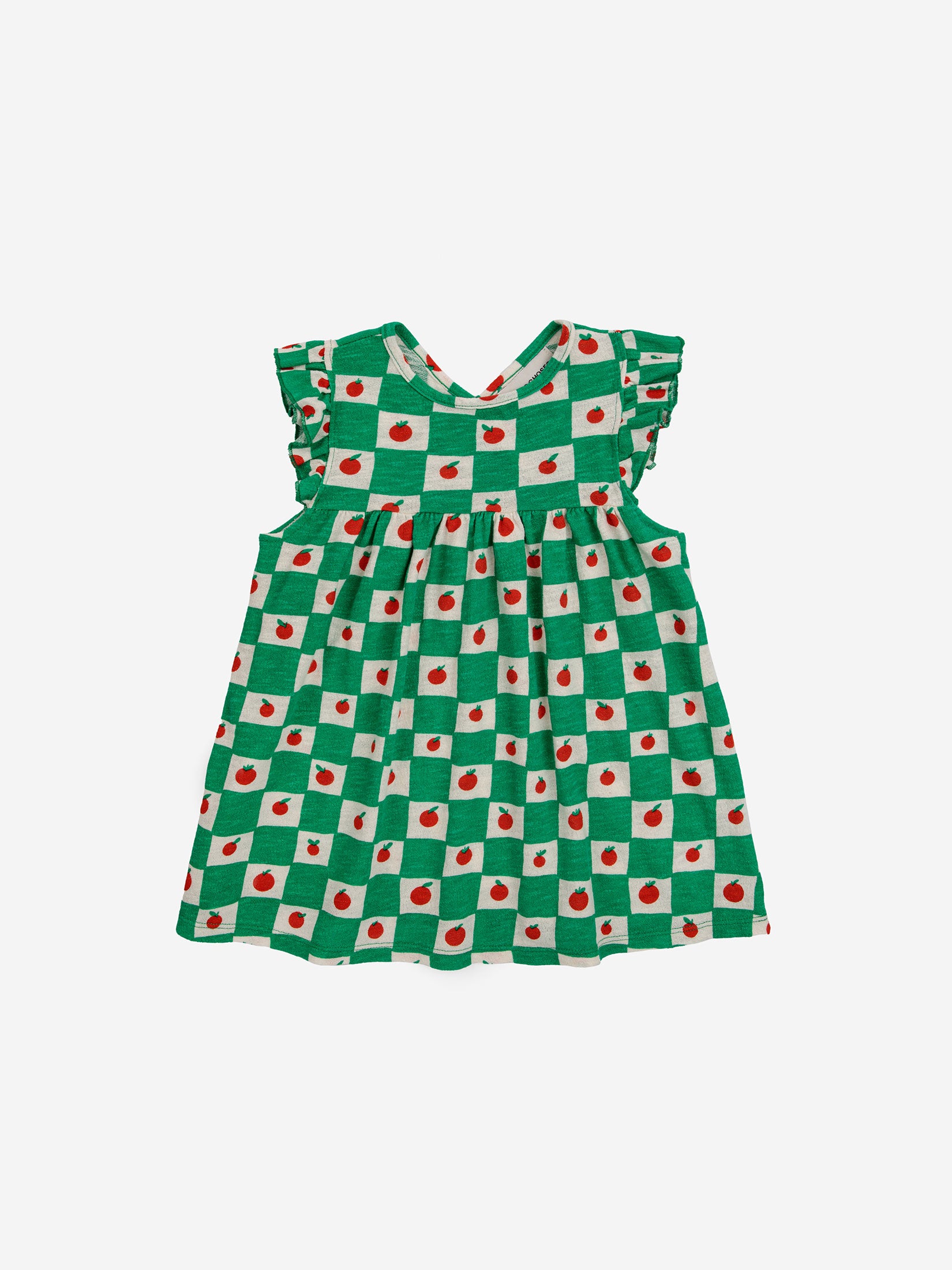 100% organic cotton offwhite dress. Designed with sleeveless, gathering detail, evasé fit, round neck and ruffled detailing. Made in Spain.