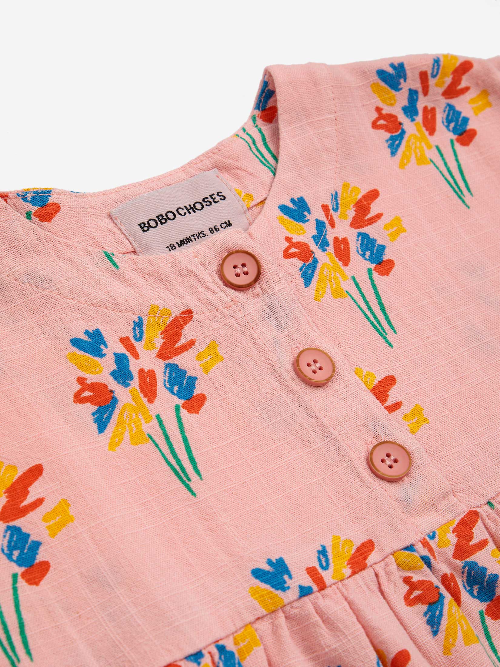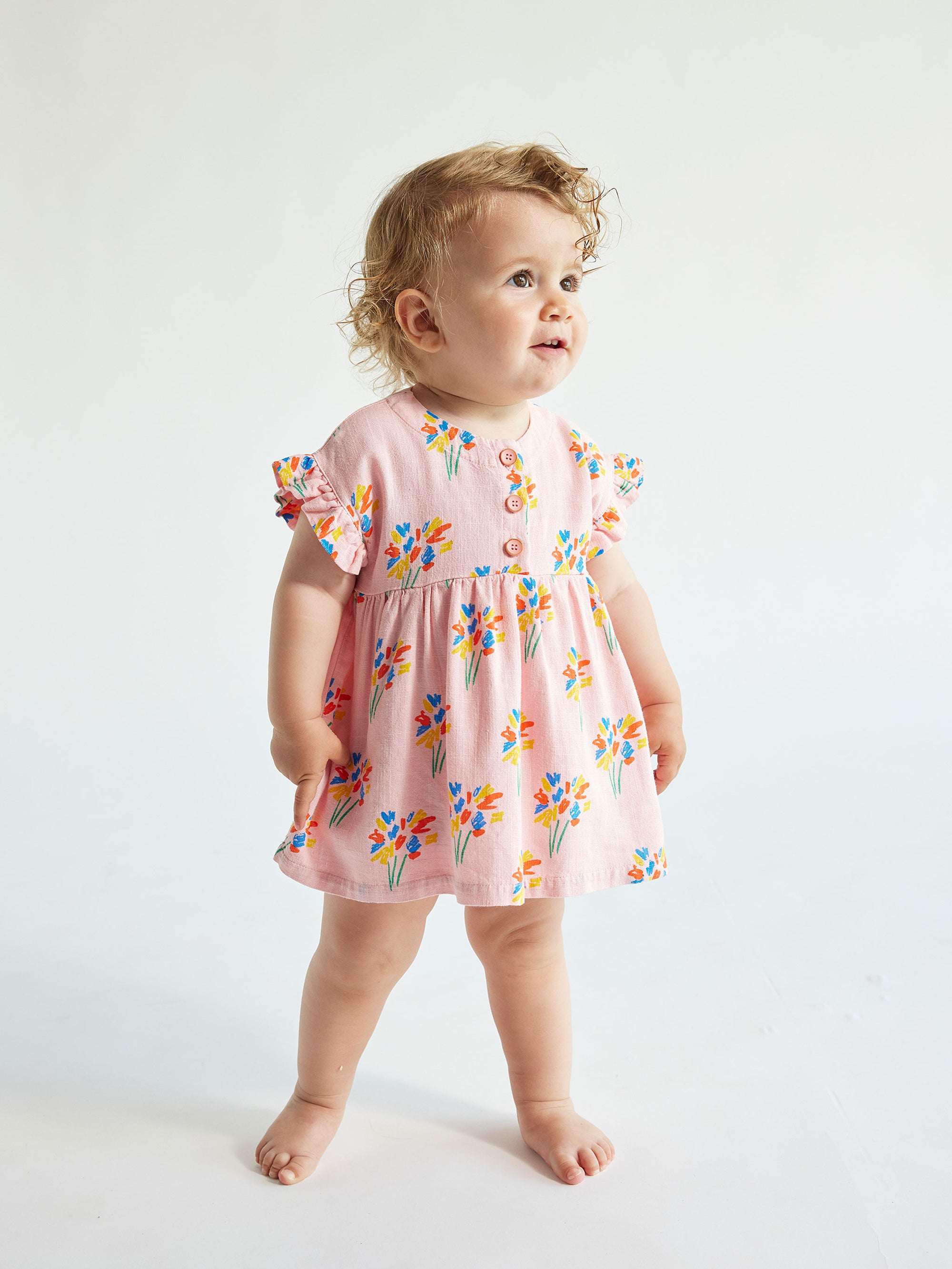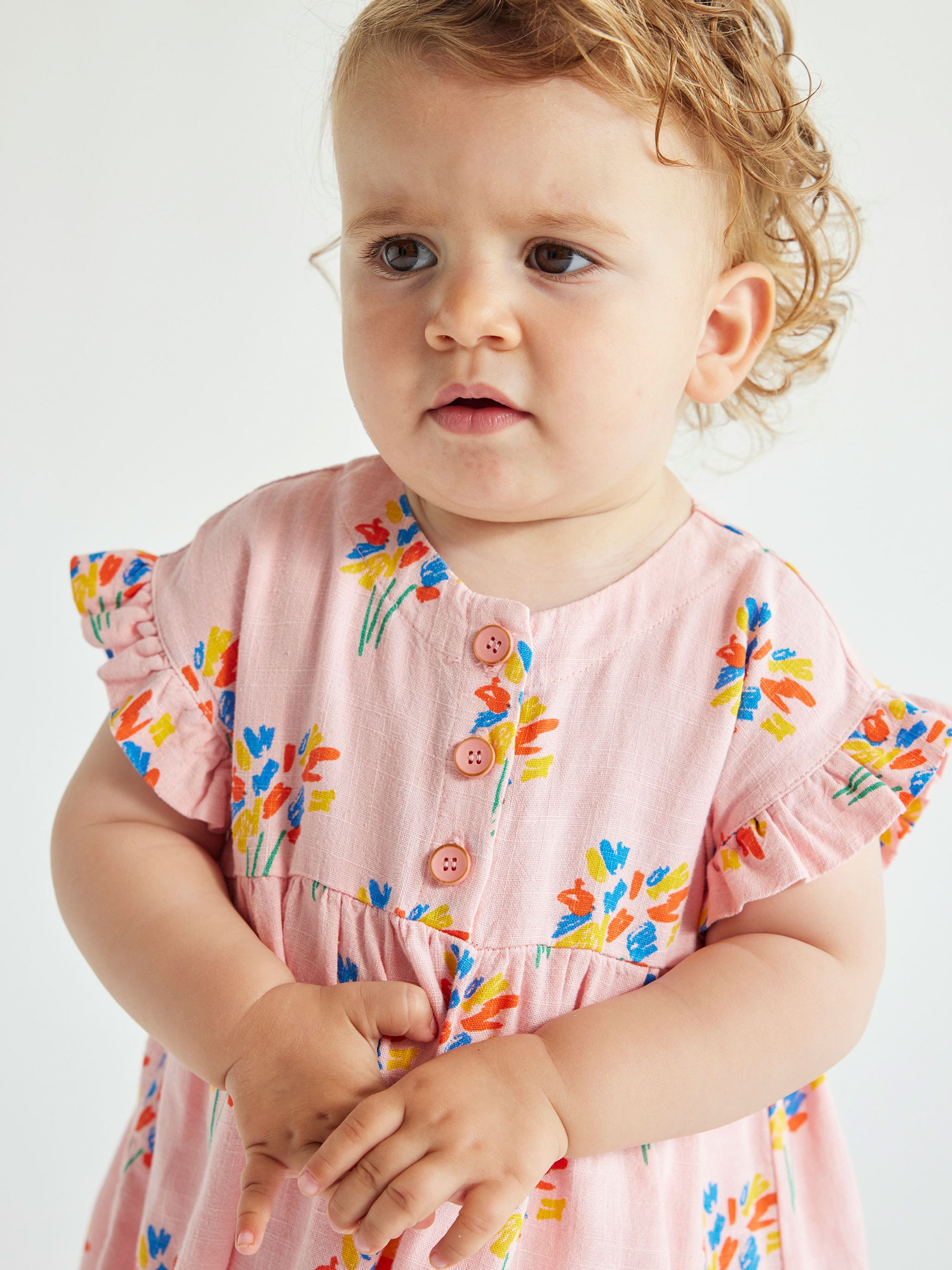 85% viscose, 15% linen pink dress. Designed with sleeveless, gathering detail, evasé fit, round neck and ruffled detailing. Made in Spain.