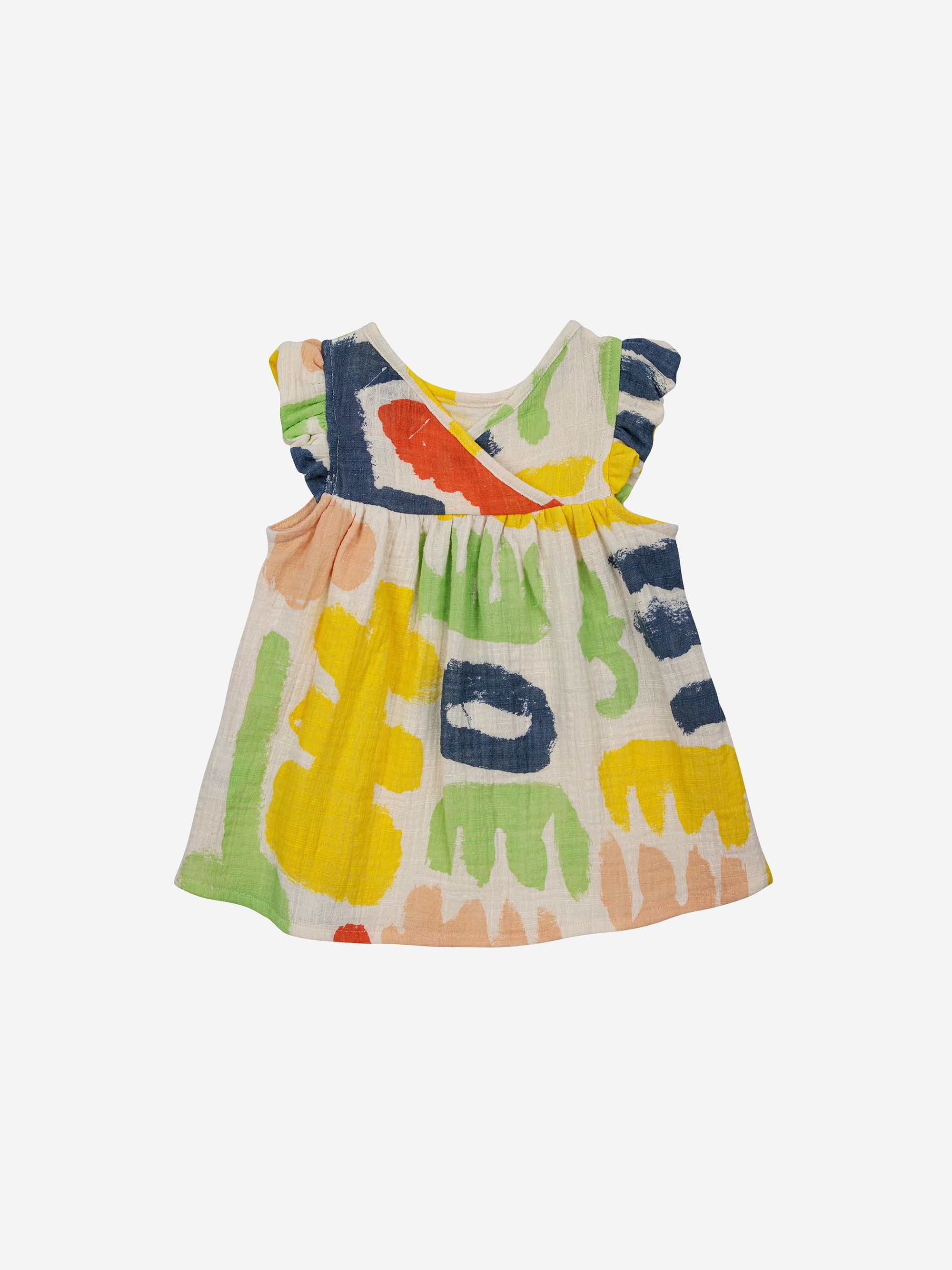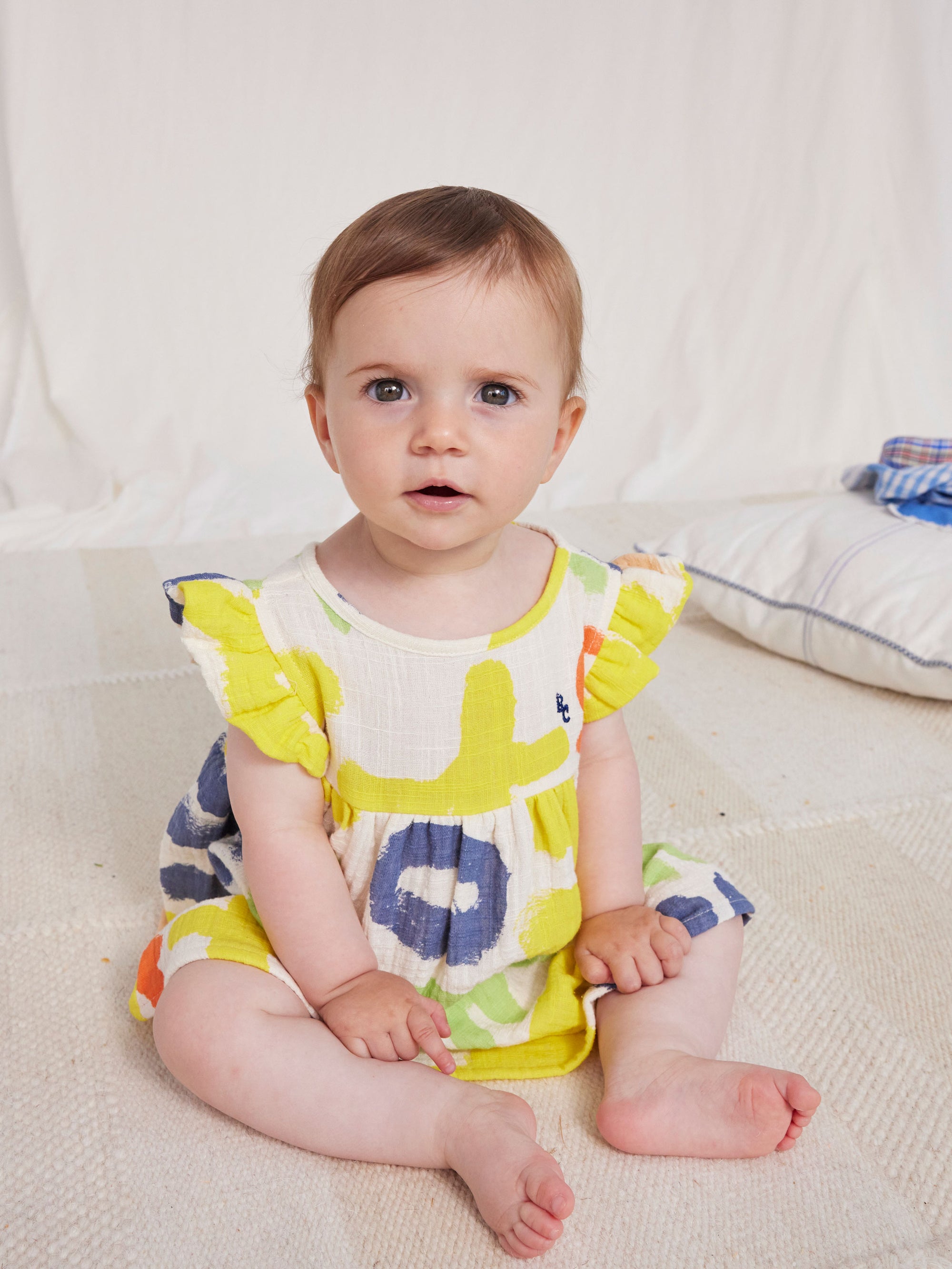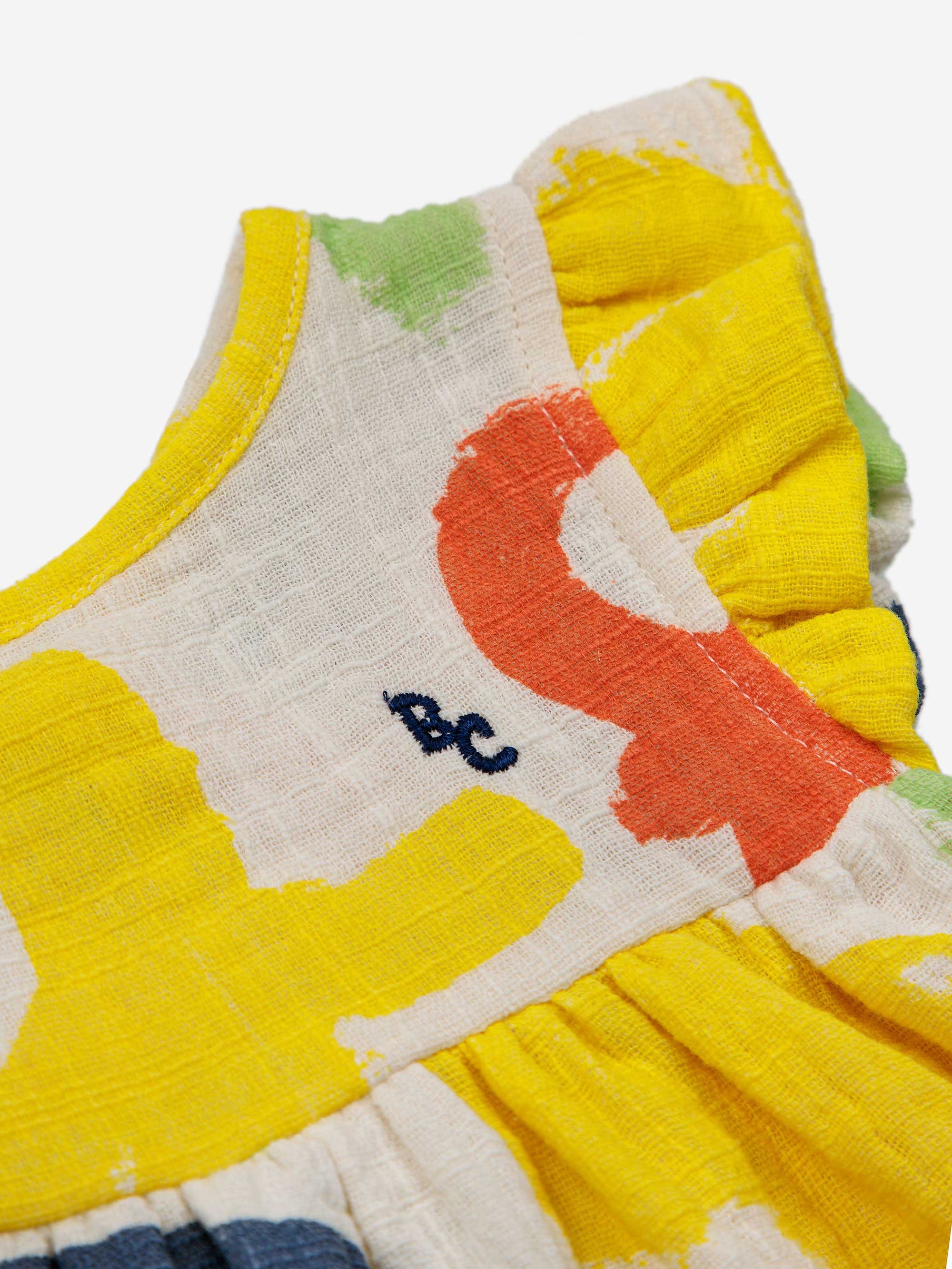 100% BCI cotton offwhite dress. Designed with sleeveless, gathering detail, embroidery, evasé fit and ruffled detailing. Made in Spain.