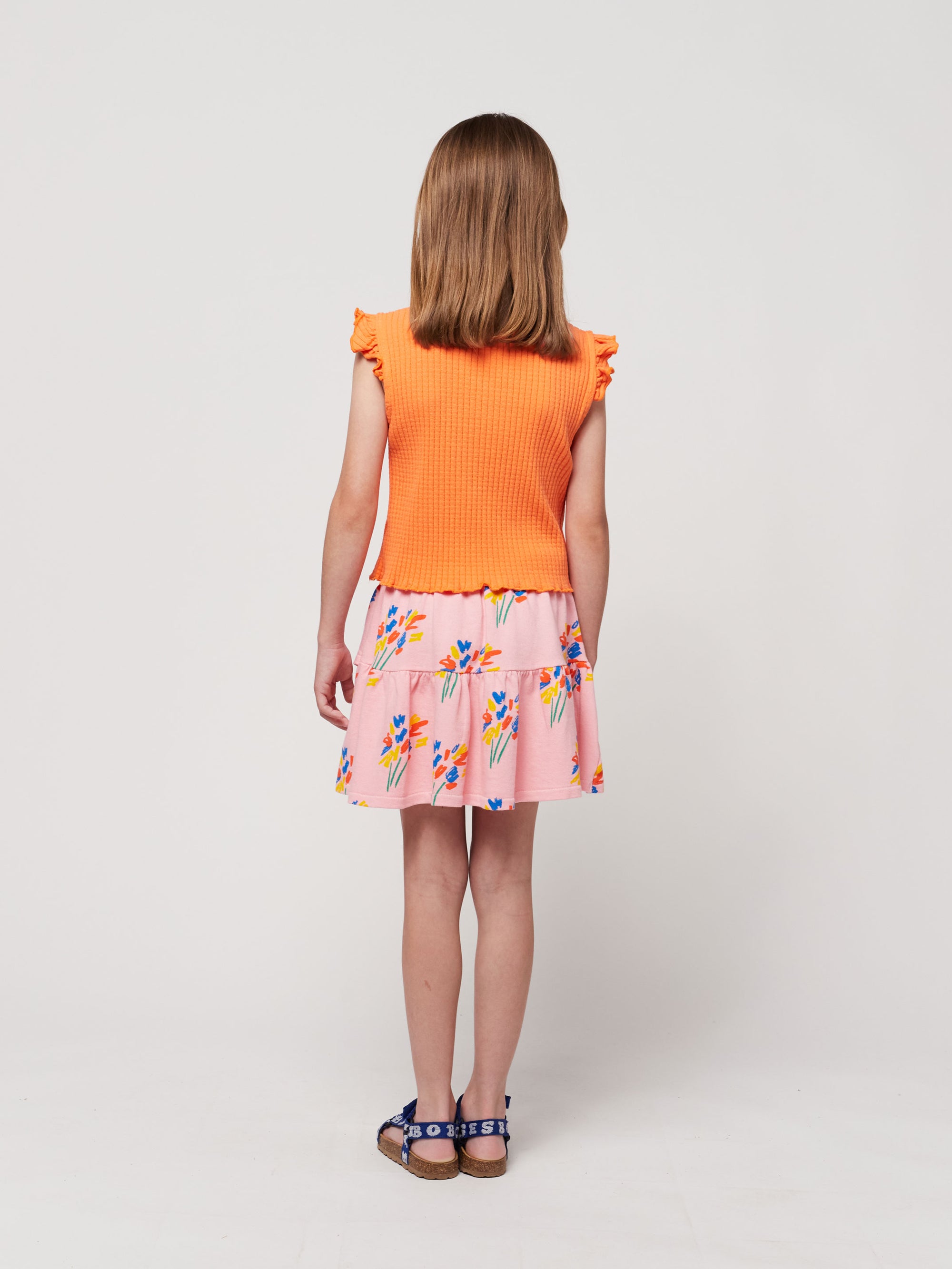 100% organic cotton pink skirts. Designed with elasticated waistband, embroidery, evasé fit, short, fleece and ruffled detailing. Made in Spain.