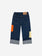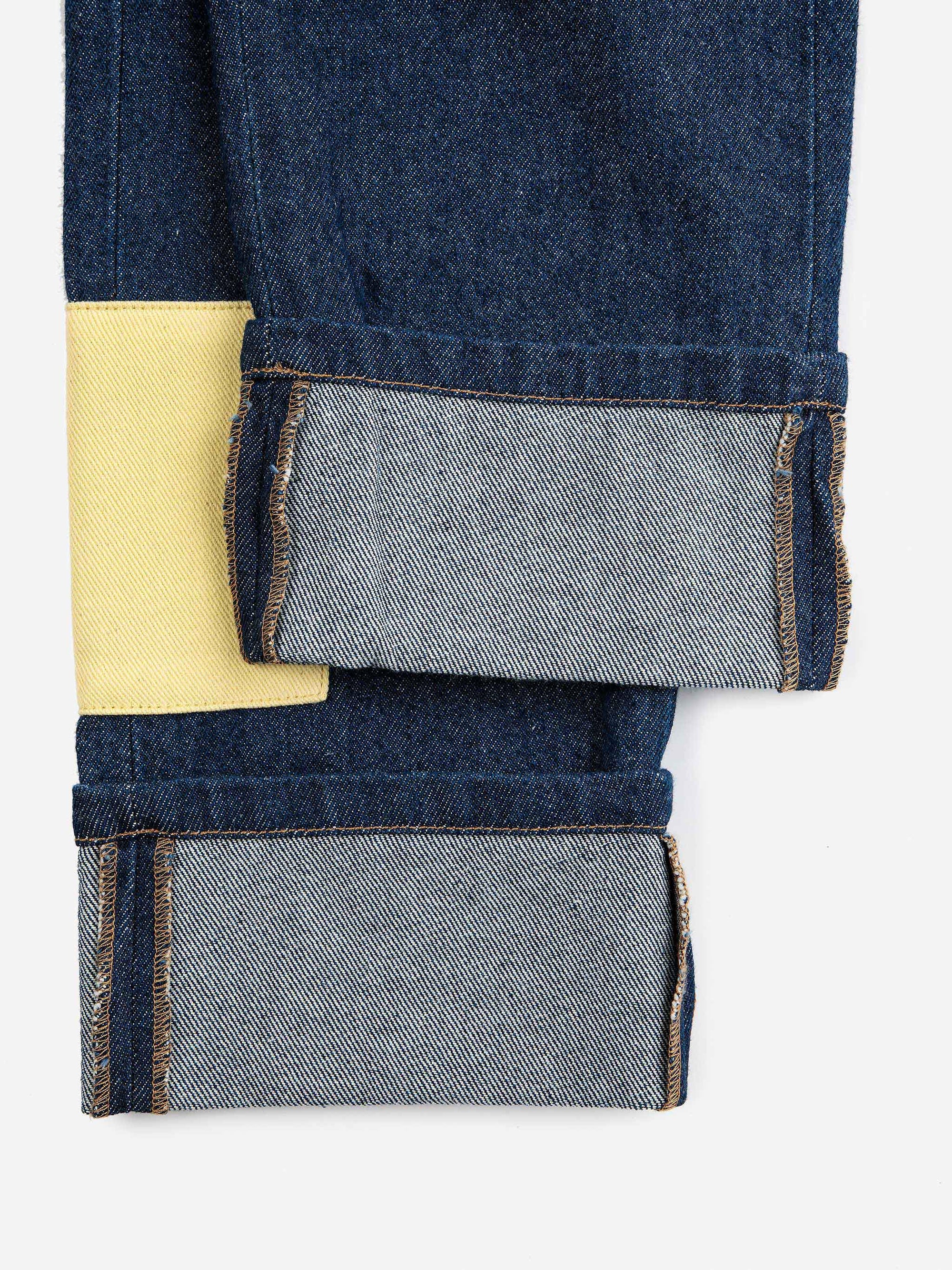 76% cotton, 24% recycled cotton navy blue pants. Designed with regular crotch, adjustable waistband, front button fastening, front zip fastening, embroidery, straight fit, back yoke, beltloop, long length, contrast fabric patch, five pockets and denim. Made in Portugal.