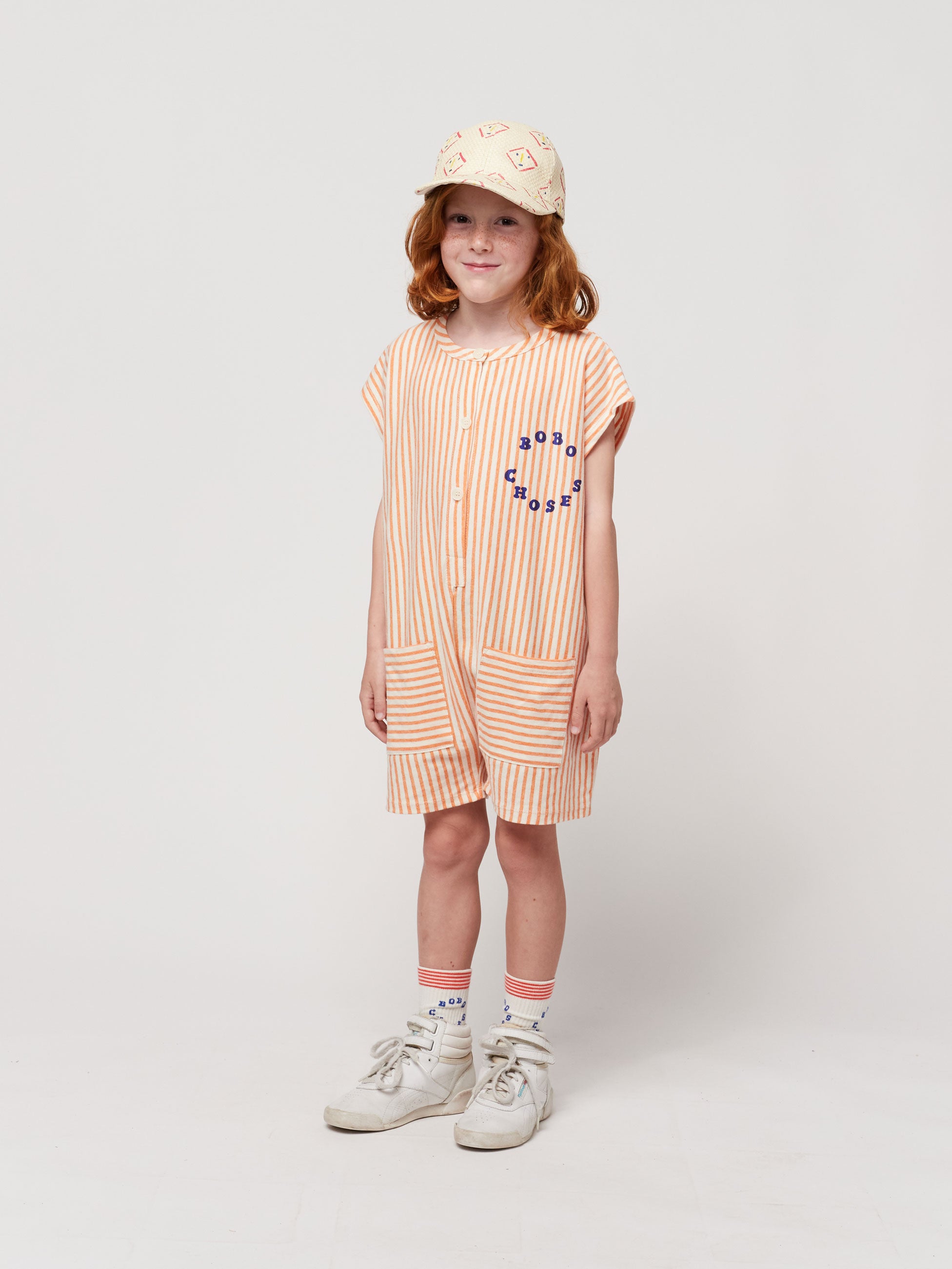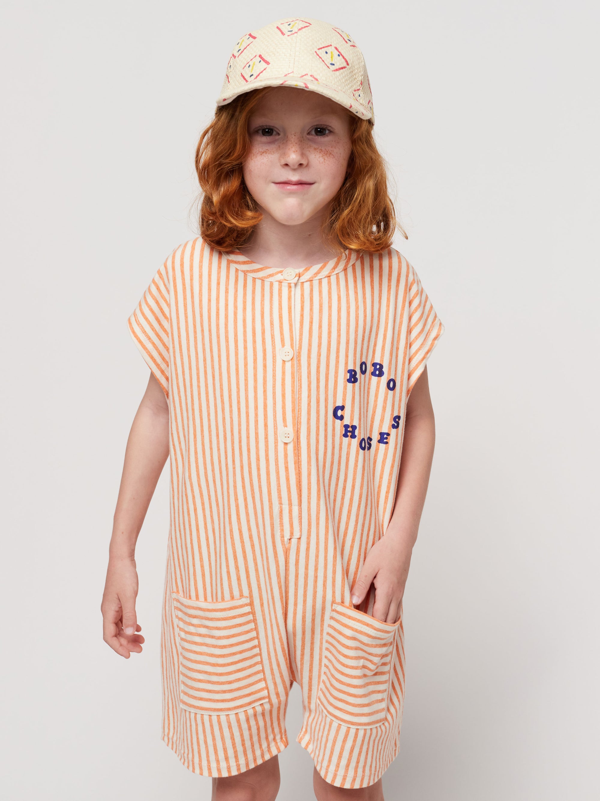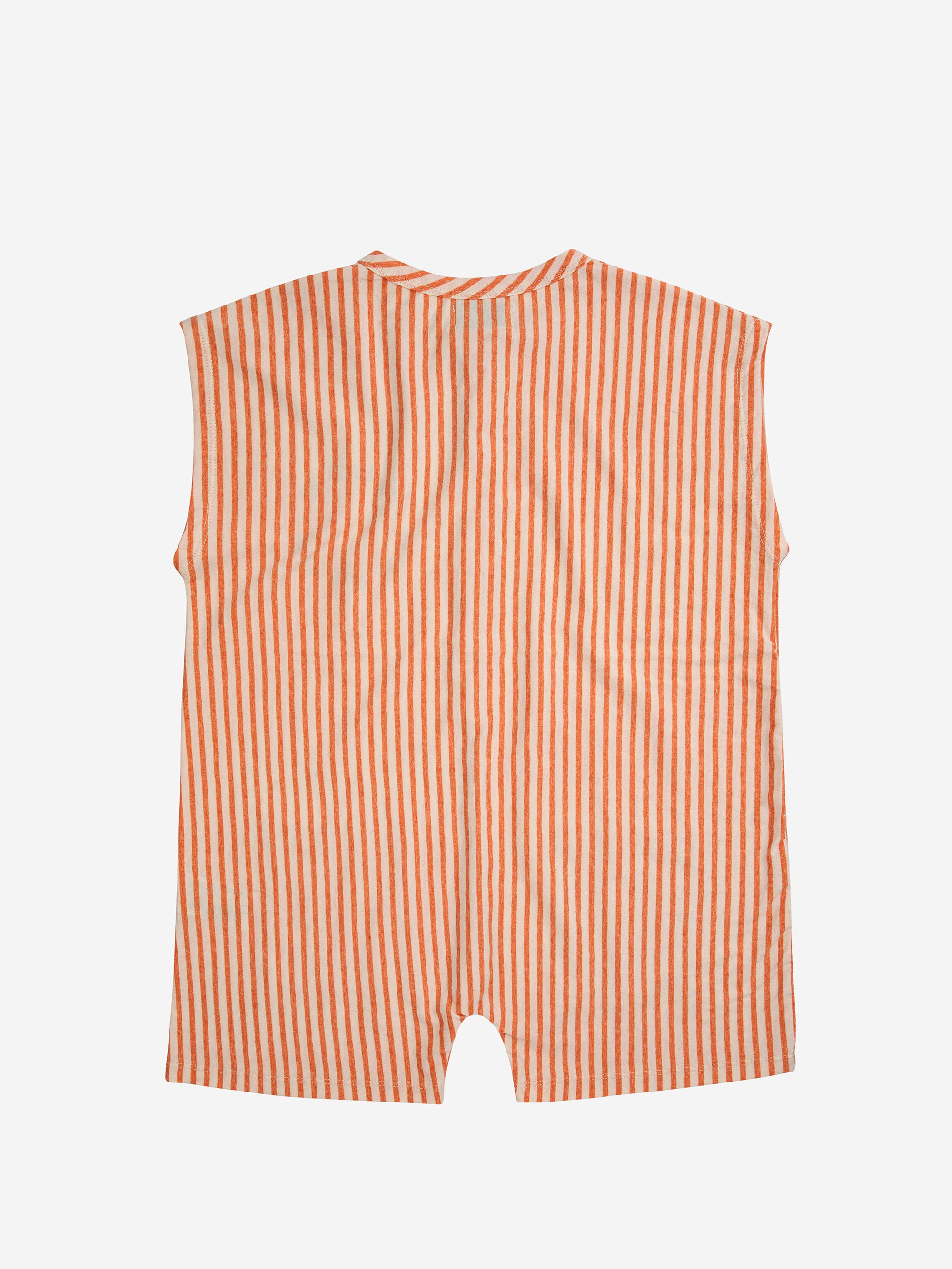 50% organic cotton, 50% cotton orange playsuit. Designed with sleeveless, front button fastening, oversize fit, short, round neck, patch pocket and relaxed crotch. Made in Spain.
