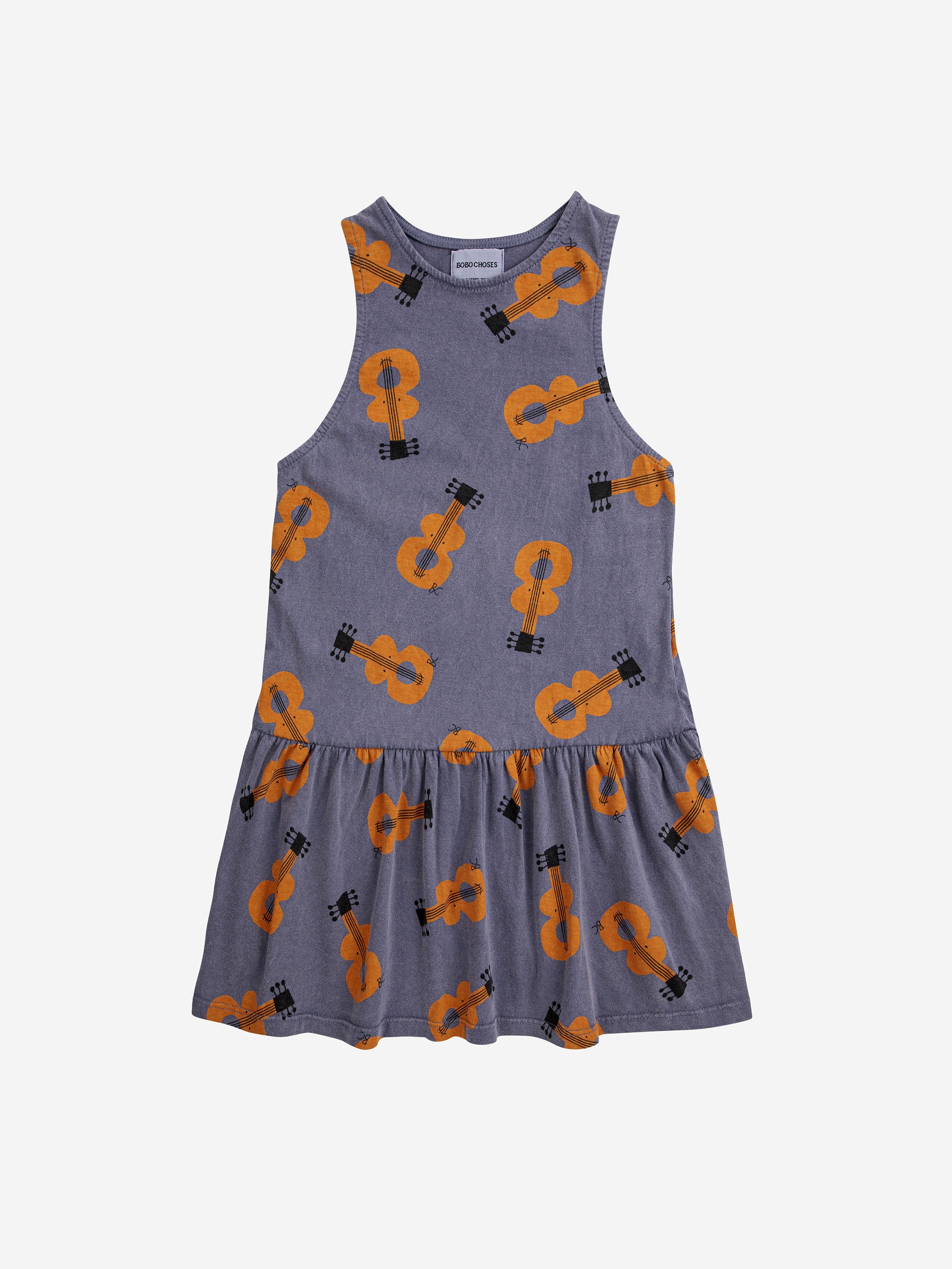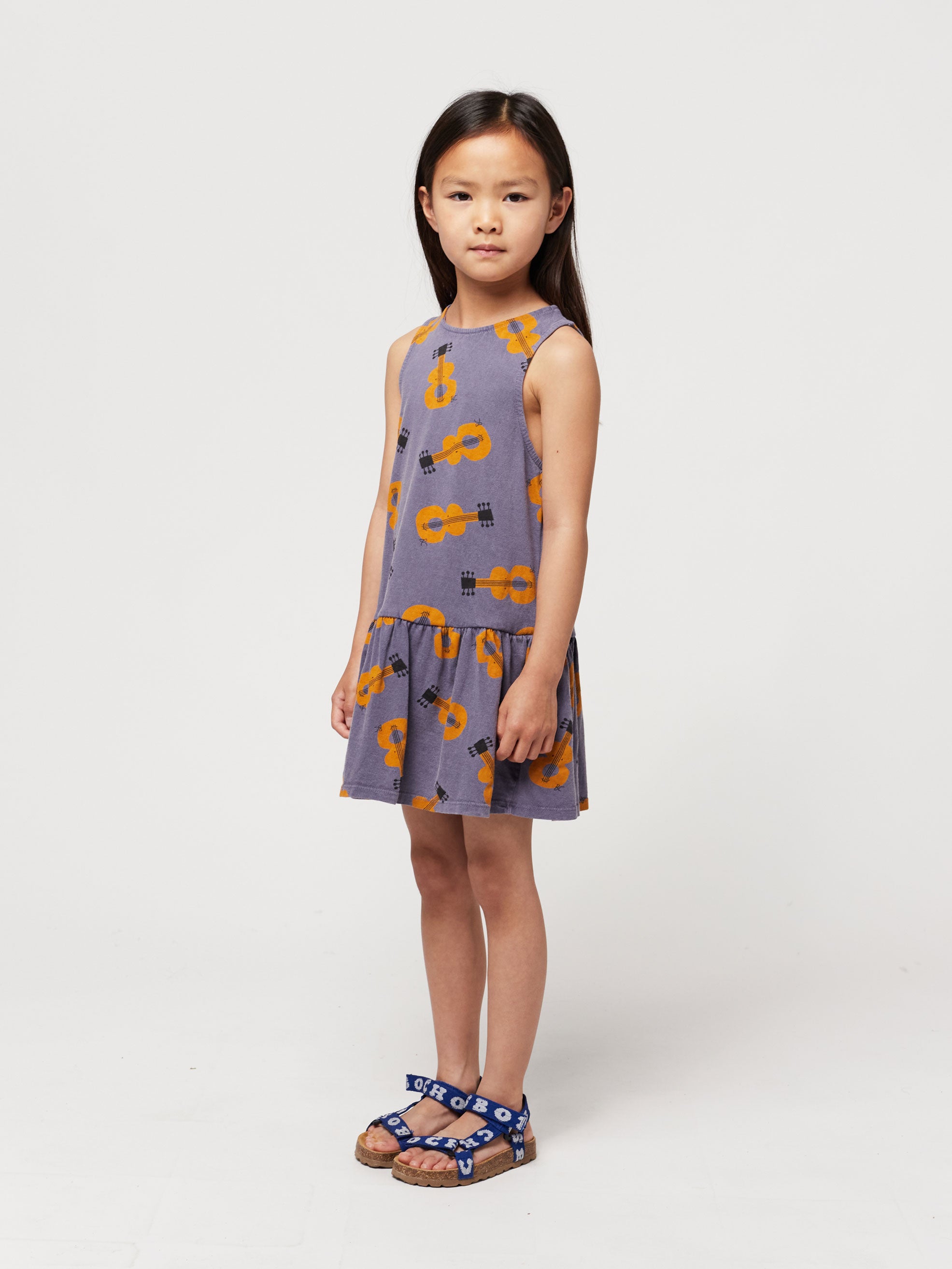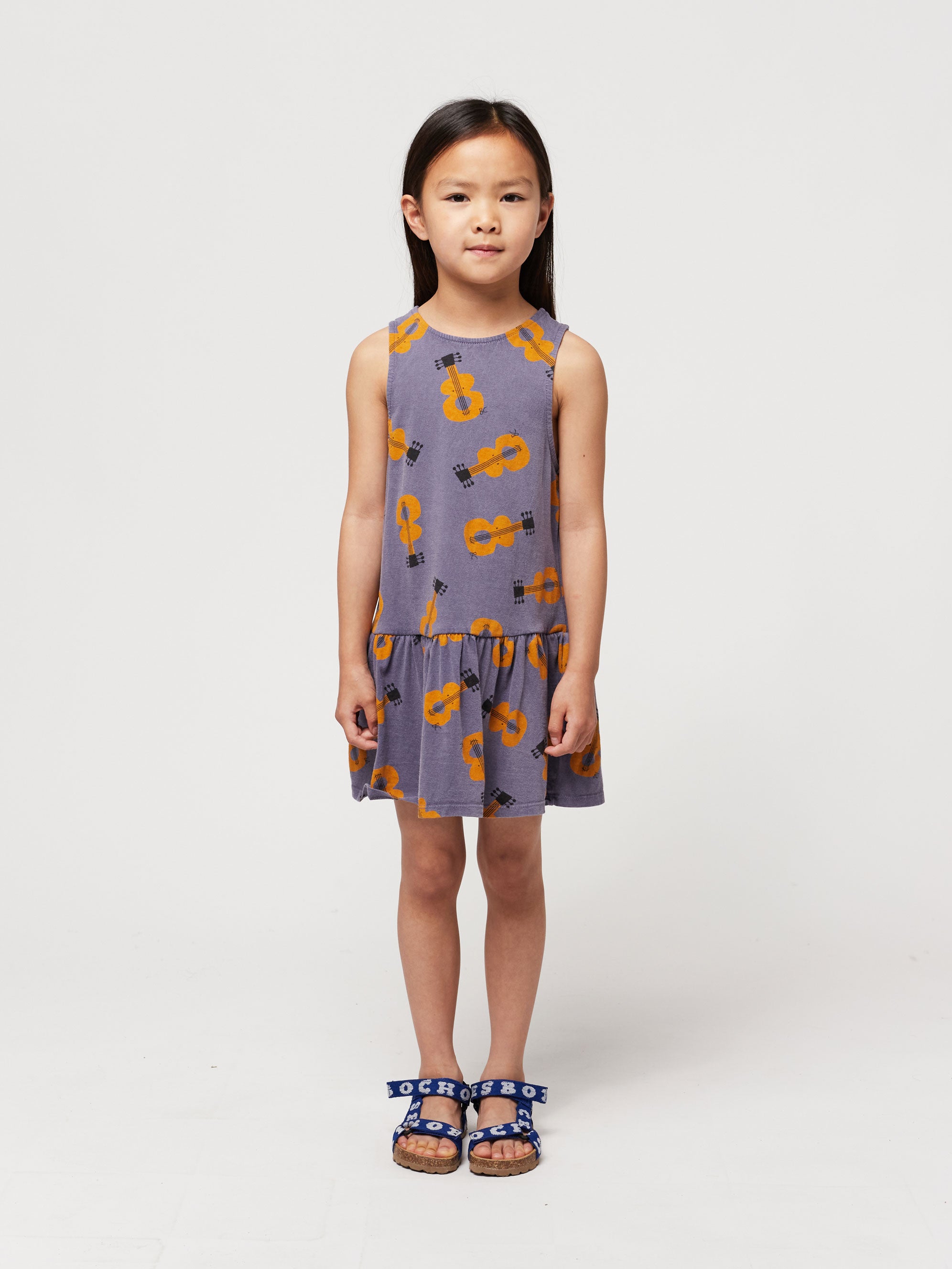 100% organic cotton prussian blue dress. Designed with sleeveless, evasé fit, gathered hem, short and round neck. Made in Spain.